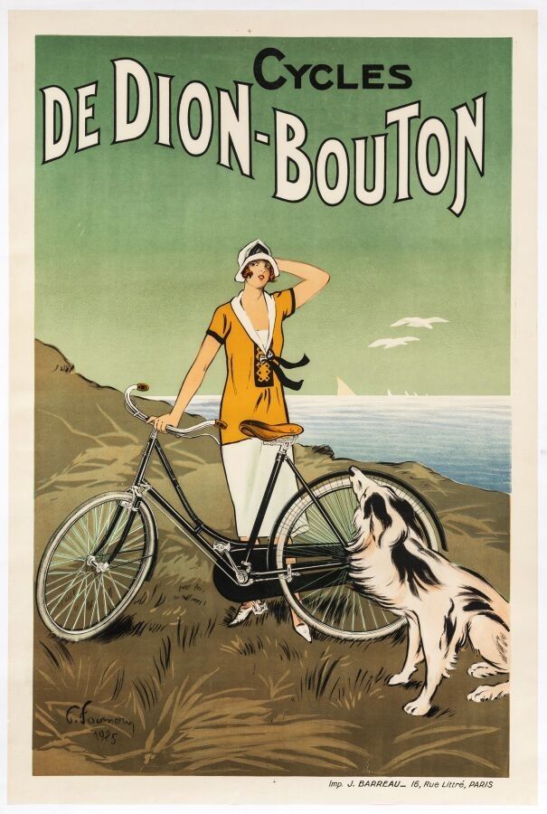 Cycles - Félix Fournery (1865-1938) - Cycles De Dion Bouton. 1925. Printer, Barreau, Paris. 119,5x80cm. Original poster, lithograph, canvas-backed. Condition A-, two small traces of tears in the lower part. Founded in 1883 by Jules-Albert de Dion, Georges Bouton and Charles-Armand Trépardoux, De Dion-Bouton was a renowned French manufacturer of top-of-the-range automobiles, railcars and engines in the late 19th and early 20th centuries, as well as bicycles.