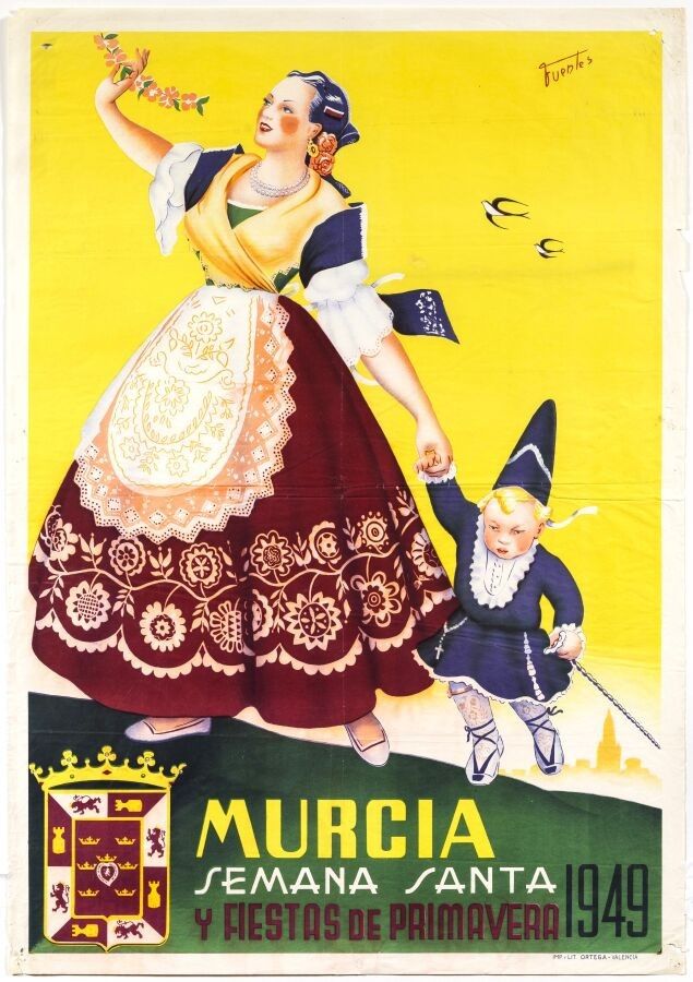Tourism - Fuentes (XX) - Murcia, Semana Santa. 1949. Printed by Ortega, Valencia. 100x70cm. Original poster, lithograph, not canvas-backed. Condition A-, traces of folds and small tears in the margins. Murcia, known as Murcia in Spanish, is a municipality in southern Spain and serves as the capital of the region of Murcia (a community consisting of a single province). It is the seventh-largest city in Spain. As the capital of the Huerta de Murcia region, the city is known as "the orchard of Europe", due to its rich agricultural tradition, which is reflected in the production and export of fruit, vegetables and flowers.