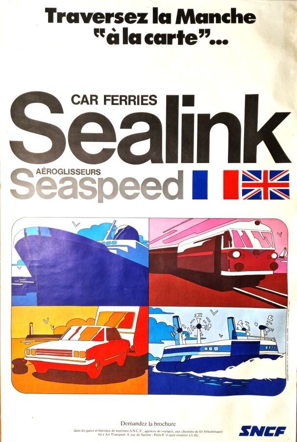 Tourism - Anonymous - Sealink car ferries, seaspeed hovercraft. 1976. Printed by Lalande Coubet. 120x80cm. Original offset poster, not canvas-backed. Condition A-, drawing pin holes in margins. This poster advertises a service offered by the SNCF to cross the English Channel to England.