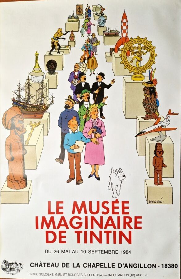 Hergé (1907-1983) d'après - Le musée imaginaire de Tintin au château de la chapelle d'Angillon. 1984 Printed by Castermann, Tournai, Belgium. 90x60cm. Original poster, offset. Condition A- stains in lower right corner. The exhibition took place in this château in the Cher region of the Loire Valley. The poster features Snowy, Tintin, Captain Haddock and Castafiore in a trio, strolling among the iconic objects from the young reporter's adventures. Hergé's preparatory drawing for this poster was sold at Artcurial in 2011.