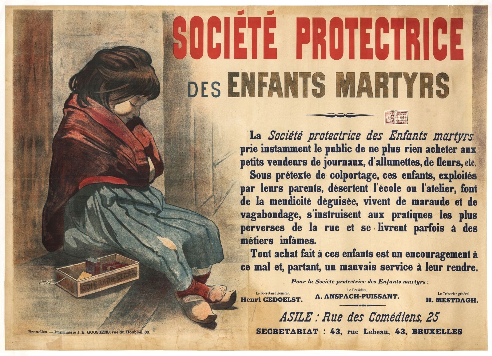 Anonymous - Society for the Protection of Martyred Children. 1897. Printed by Goossens, Brussels. 88.5x124cm. Original lithographed poster, canvas-backed. Condition A-, traces of marginal tears. This society was founded in Belgium to help combat child poverty, which was a real scourge at the time. Between child labour in disguise, corporal punishment and vagrancy, it was a veritable battle for public health, encouraged by the then Minister of Justice. To illustrate the poster, a real children's trade that also inspired Andersen's famous fairy tale, The Little Match Girl.