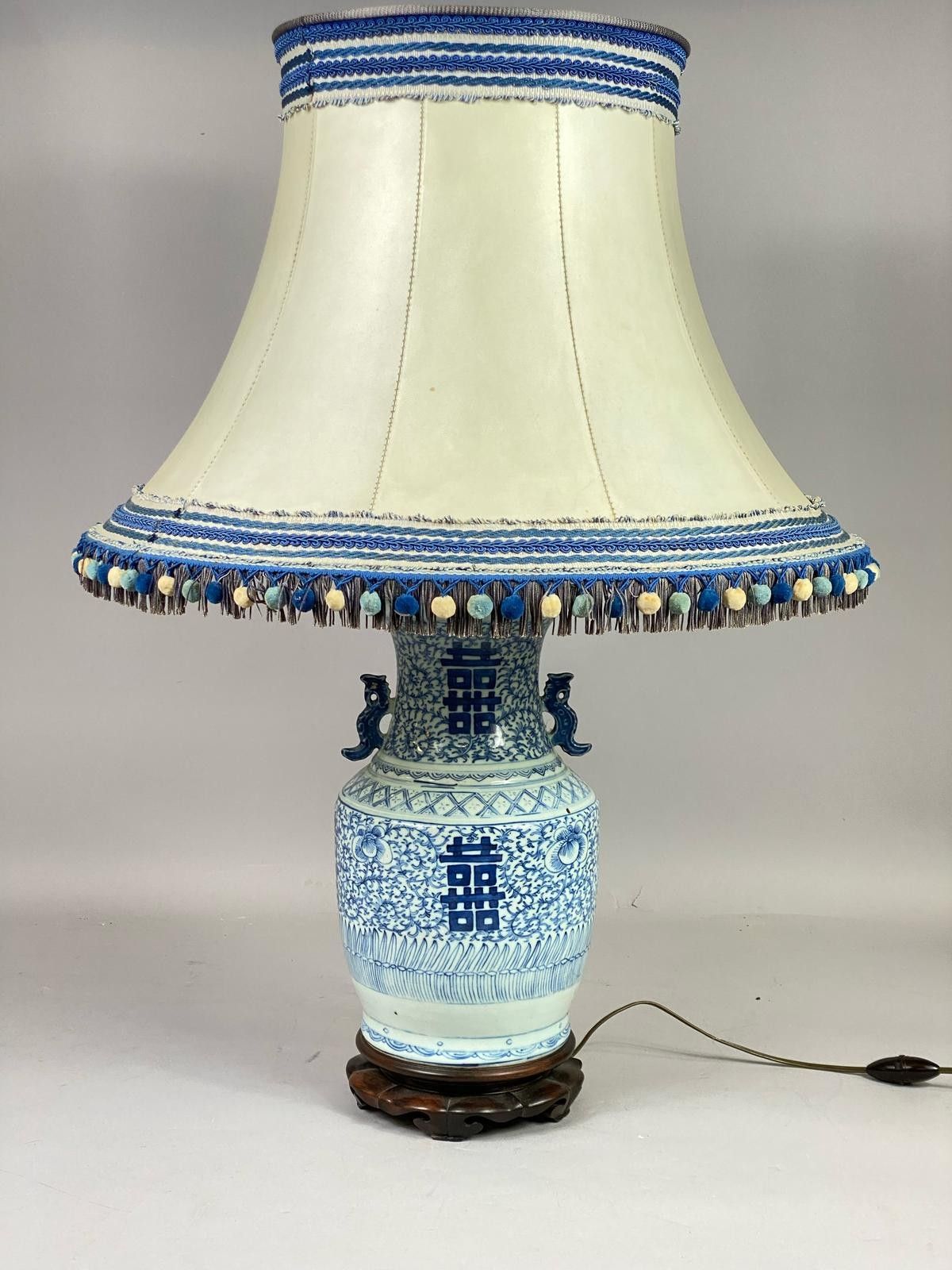 CHINA - Porcelain baluster lamp with handles decorated with flowers and symbols, standing on a round openwork wooden base, with a large ivory skin shade with white and blue tassels. H.