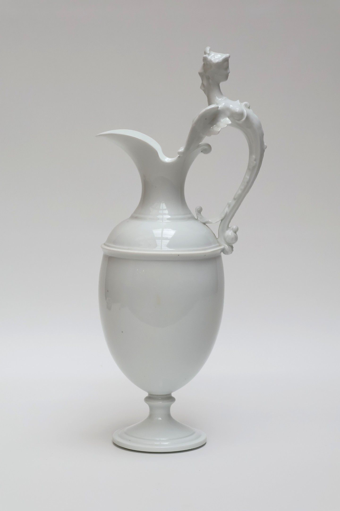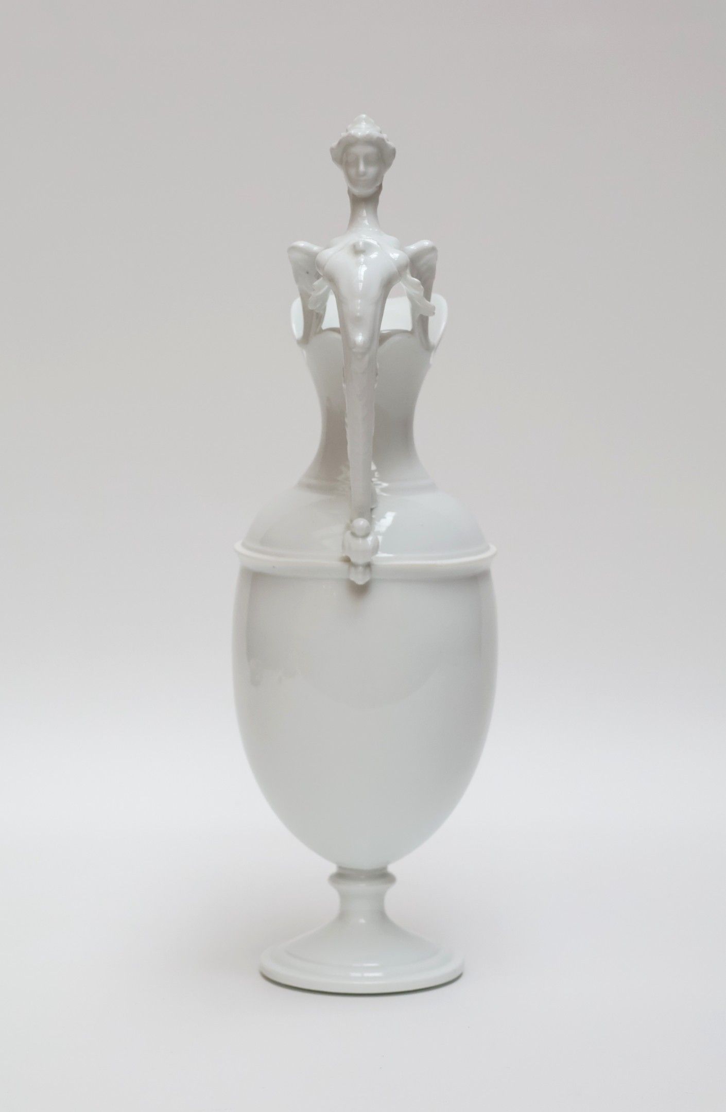 Ewer on pedestal in white enamelled hard porcelain decorated on the handle with a bust of a winged caryatid, inspired by Renaissance models sculpted by Benvenuto Cellini