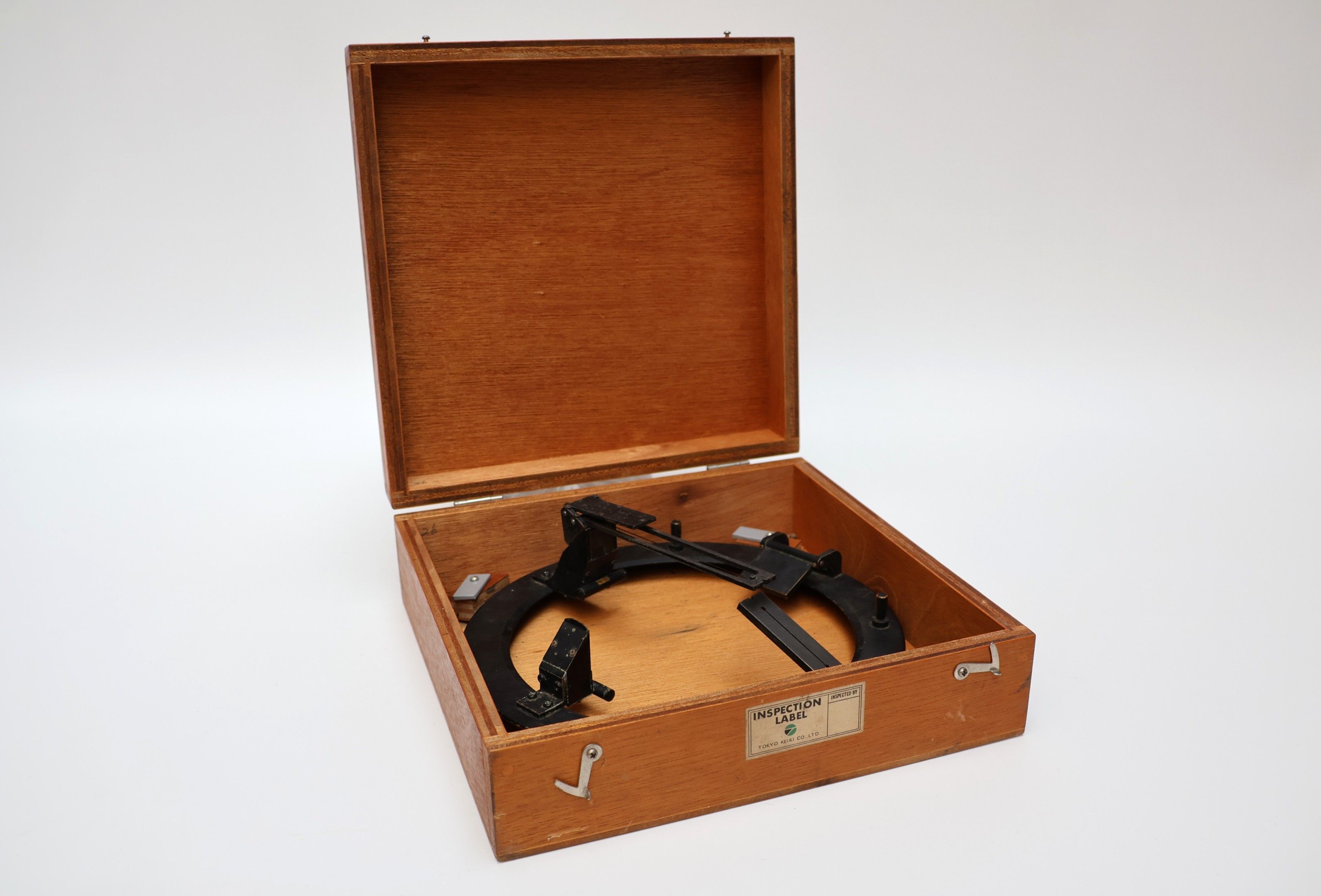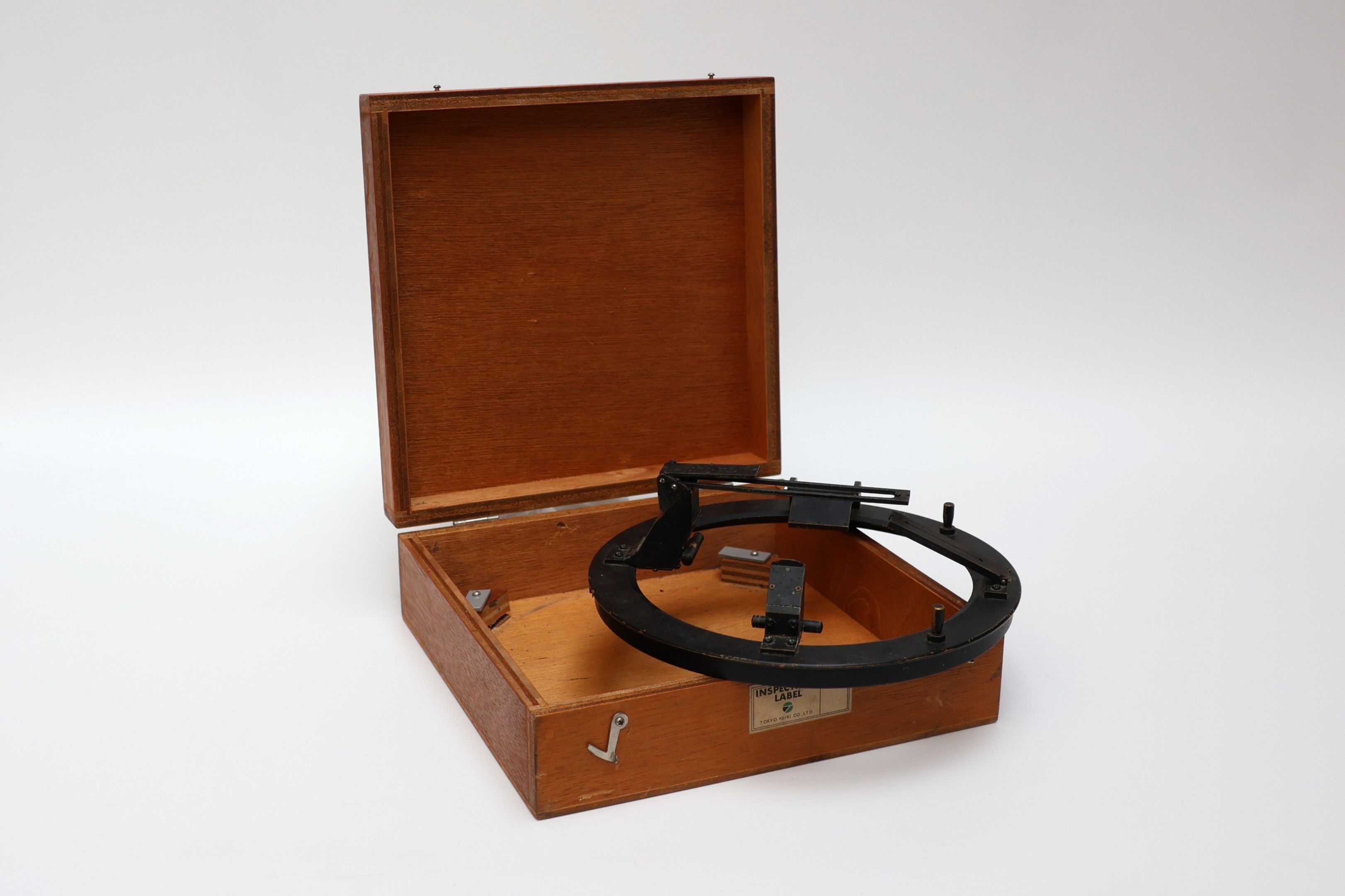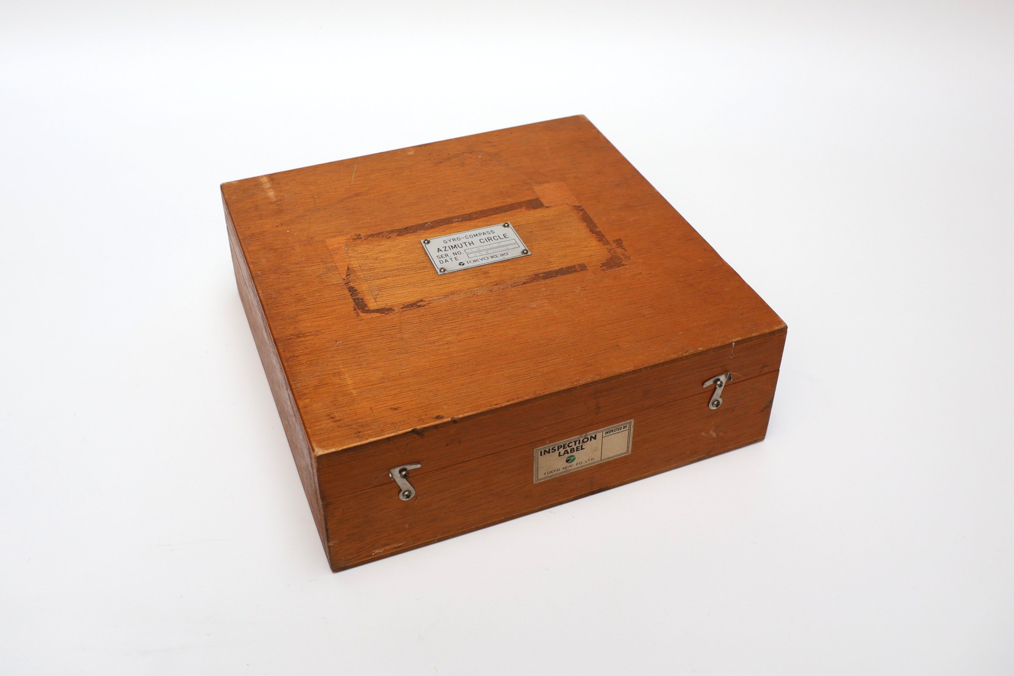 Azymuth circle in painted metal, in its original wooden case bearing a plaque "GYRO-COMPASS - AZIMUTH CIRCLE".