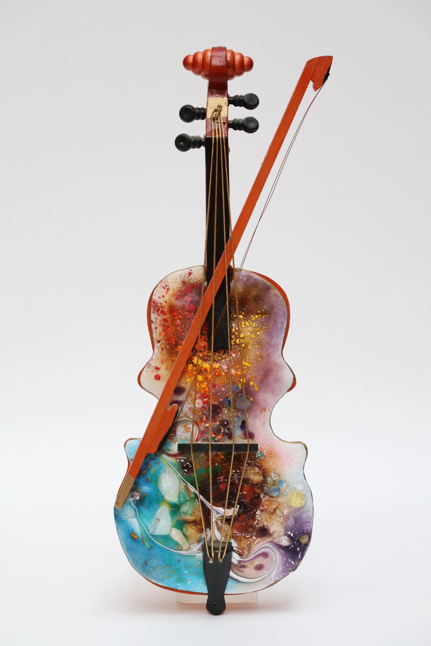 Violin in wood and polychrome enamels in relief with abstract decoration, signed and dedicated, unique piece dated 1999