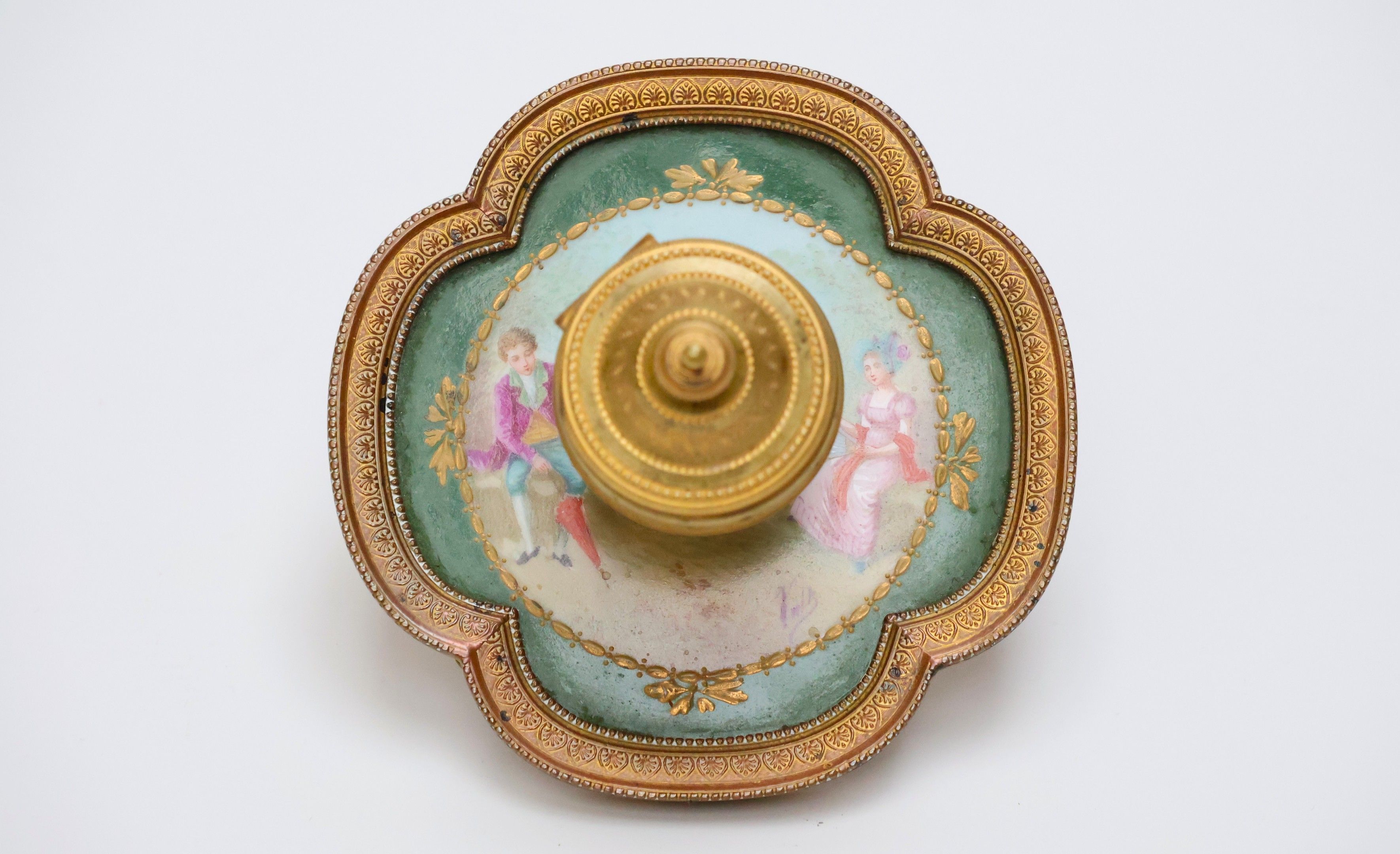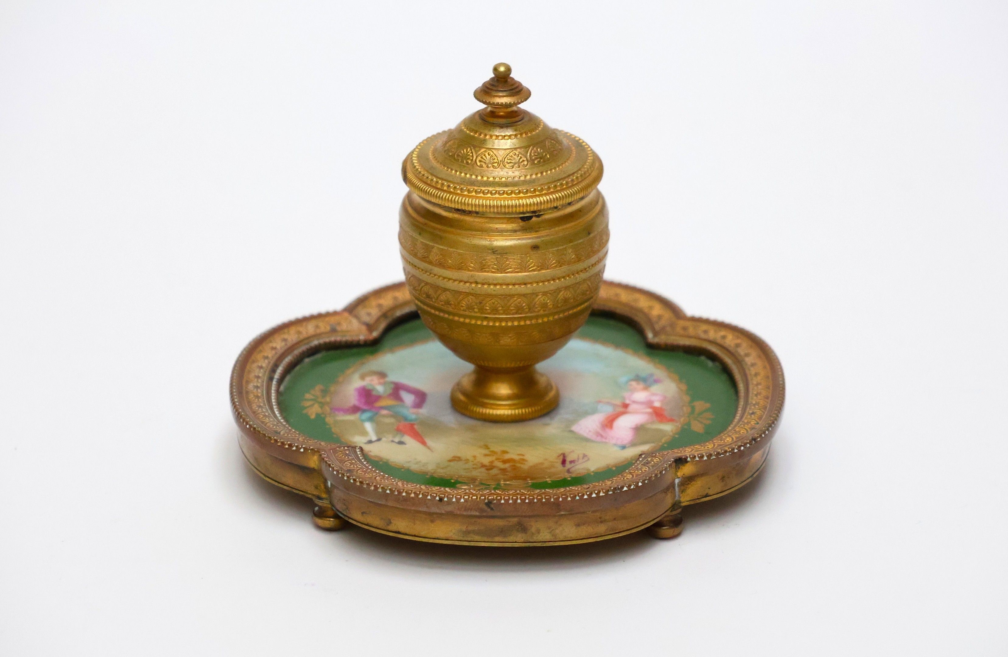 An ormolu inkwell with a hinged lid, decorated with friezes of palmettes, resting on a poly-lobed base adorned with an enamelled porcelain plate with polychrome painted decoration enhanced with gold of a gallant scene signed Valk?