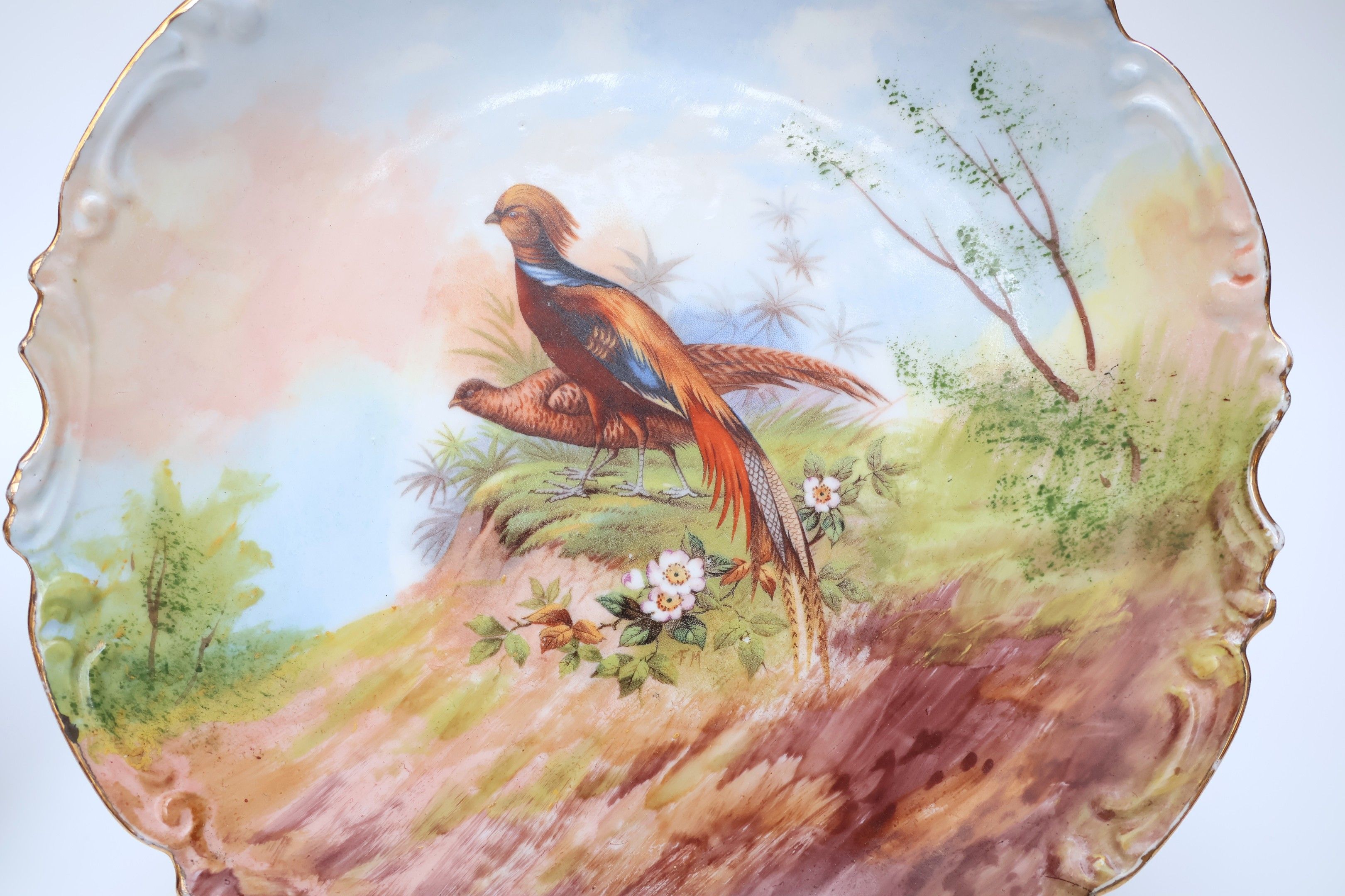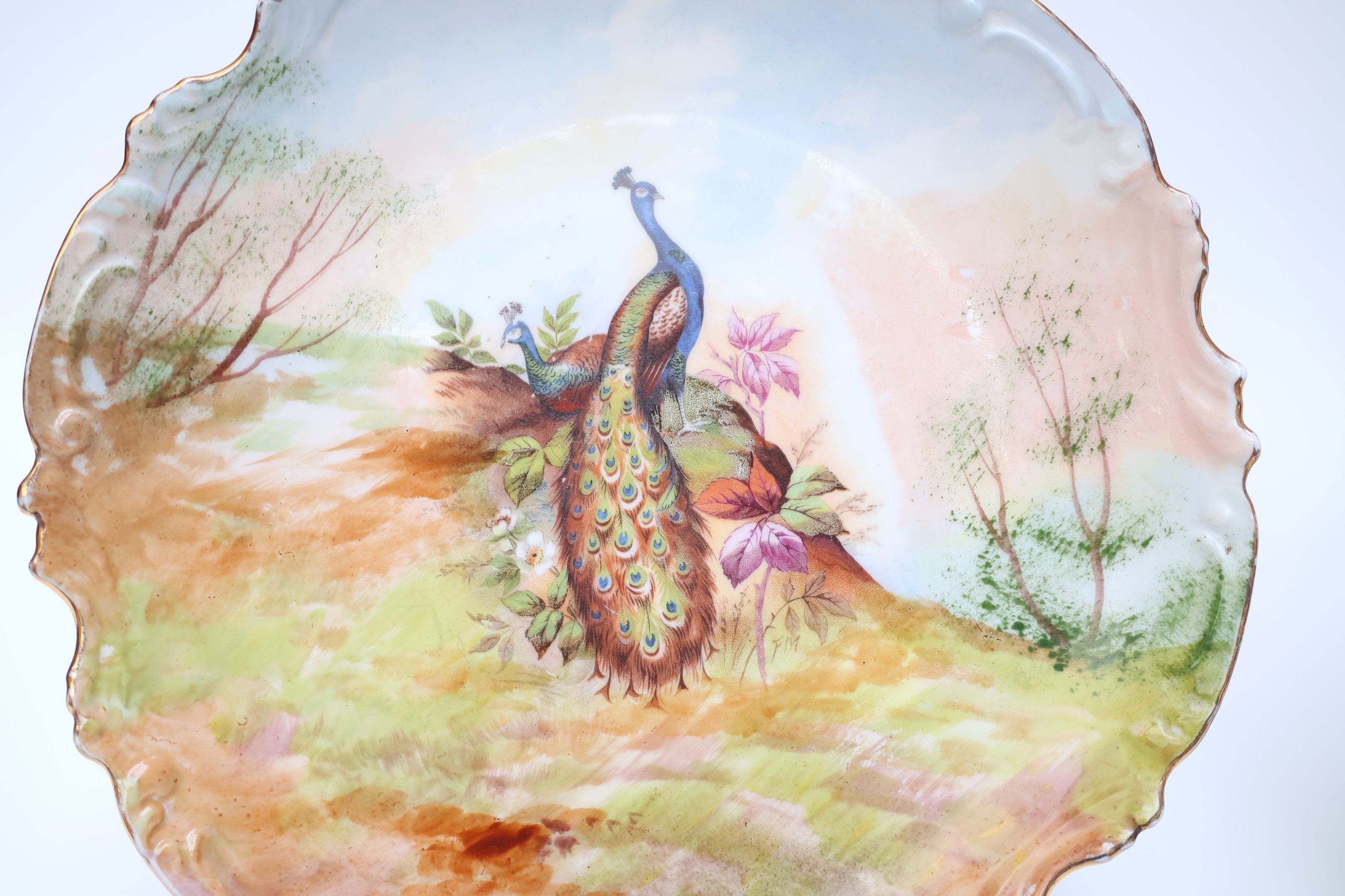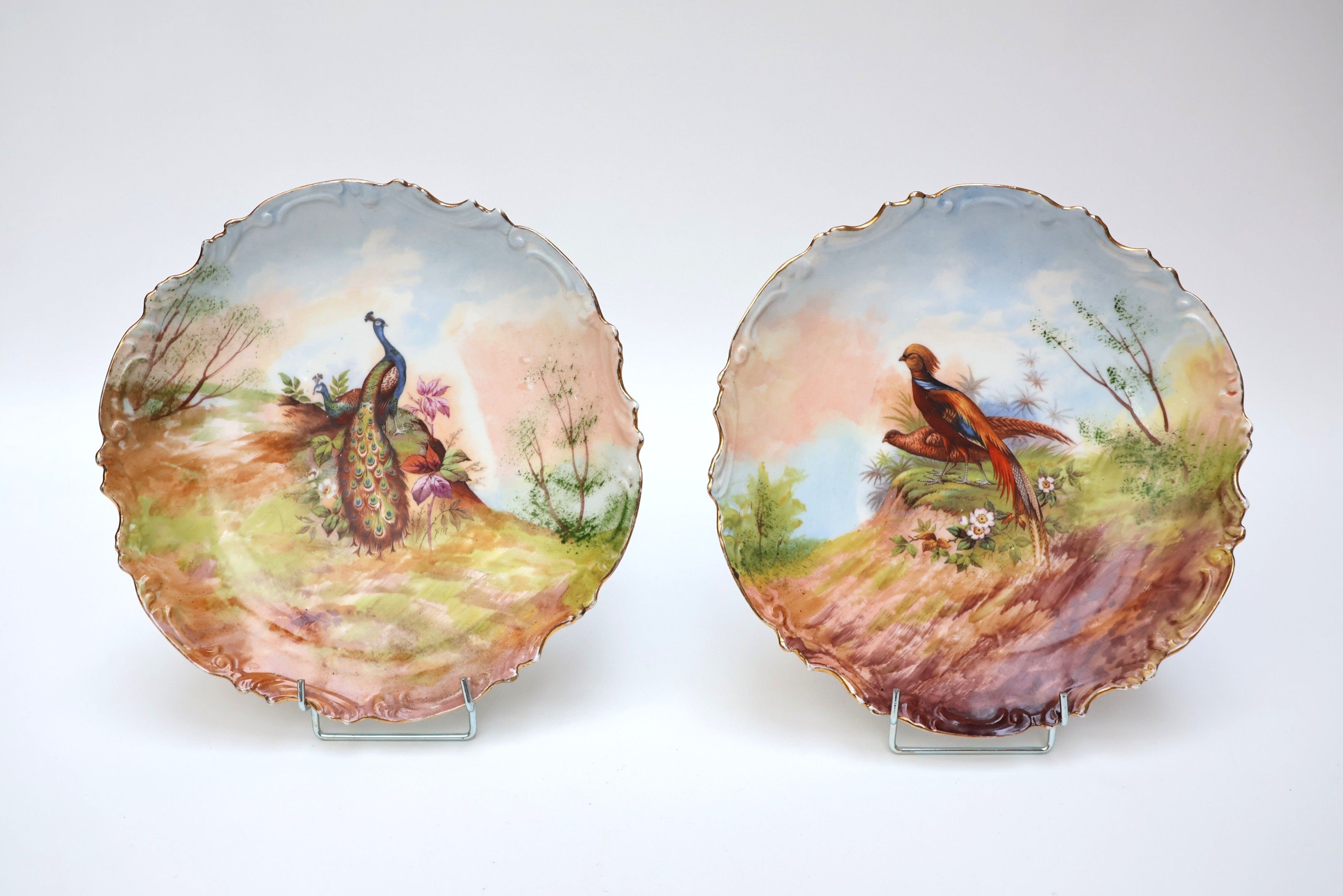Pair of gold-enamelled hard-paste porcelain dishes with moving rims and hand-enhanced chromolithographed decoration of peacocks and a pair of pheasants monogrammed FM (probably François Marcadet)