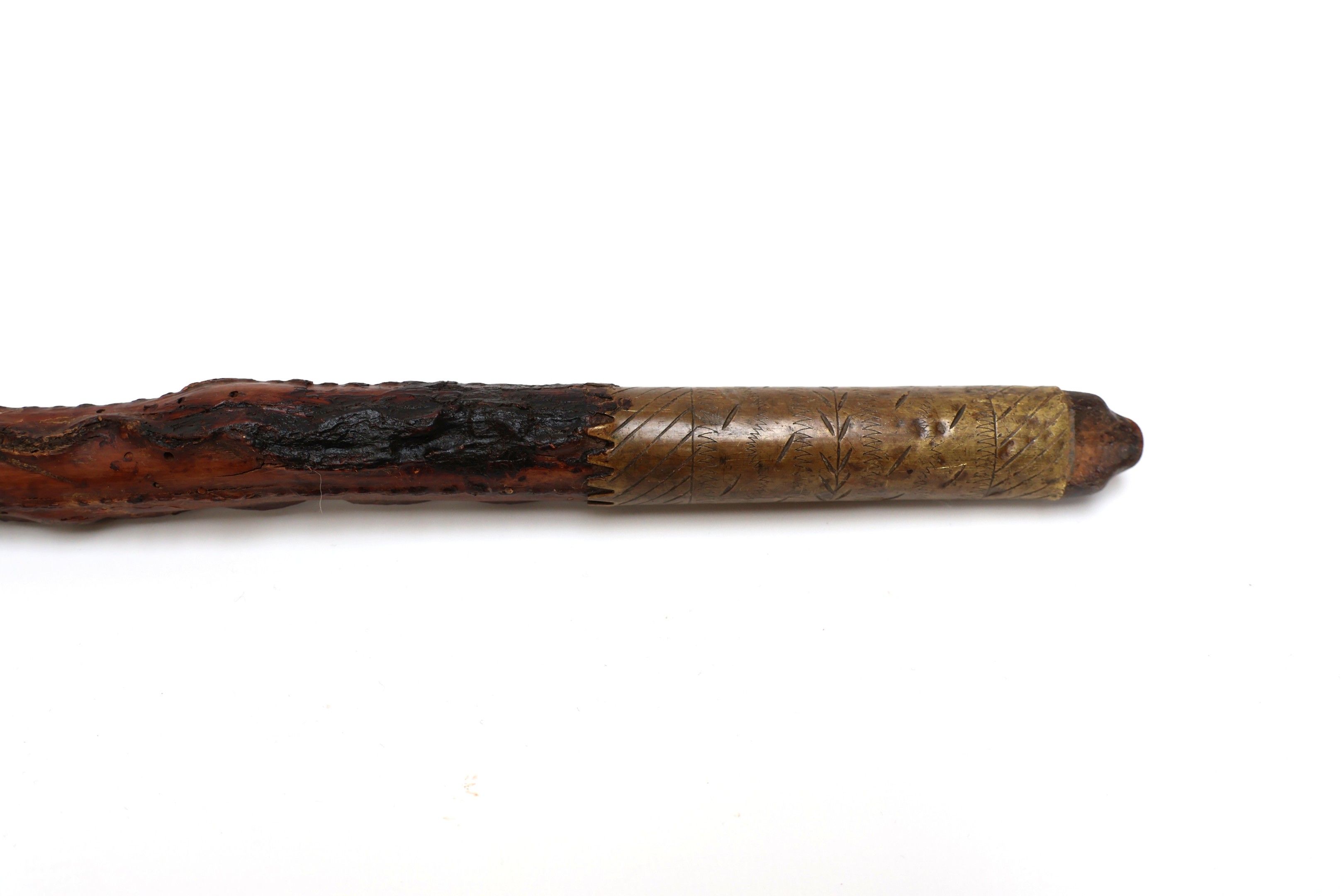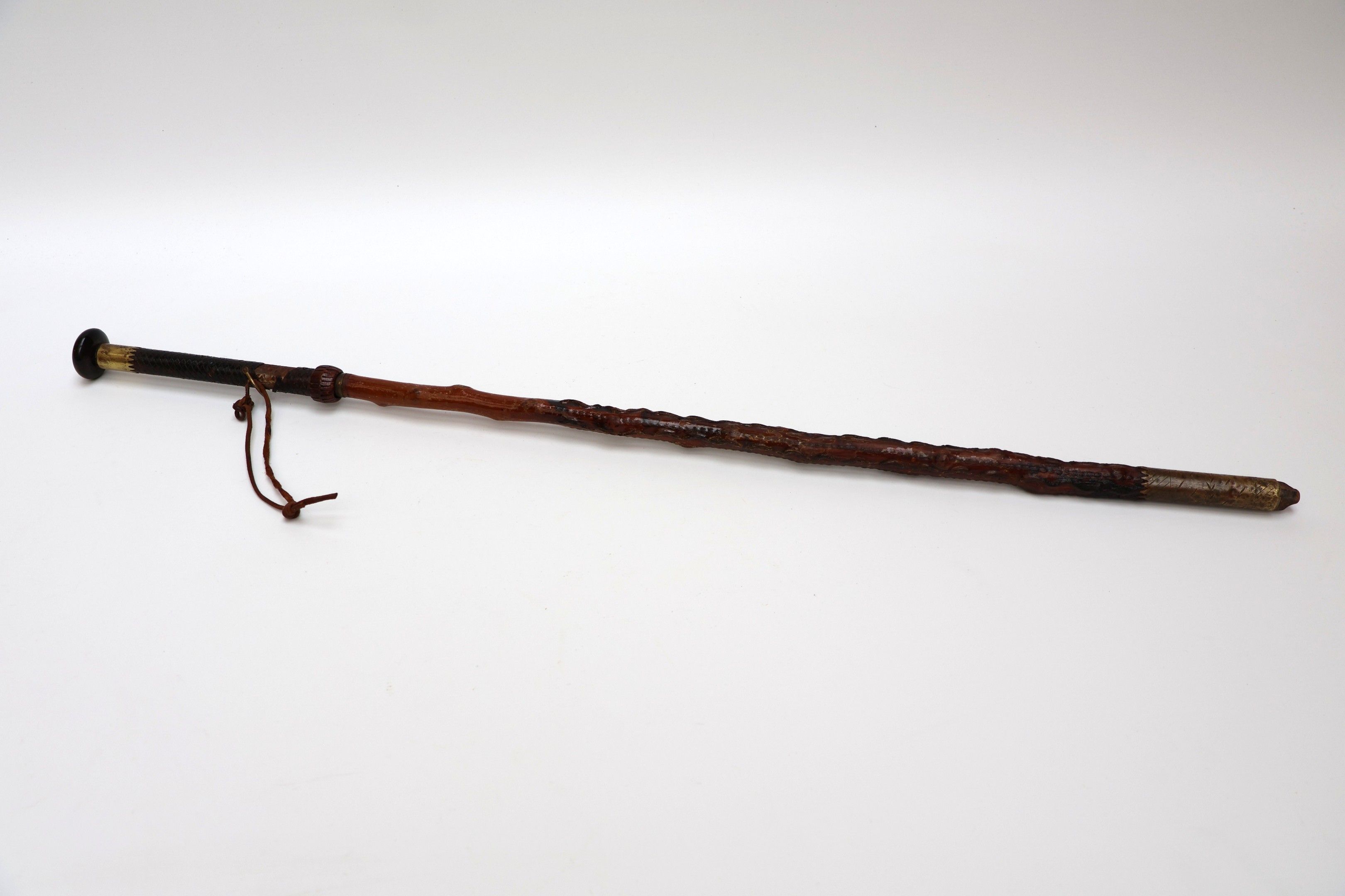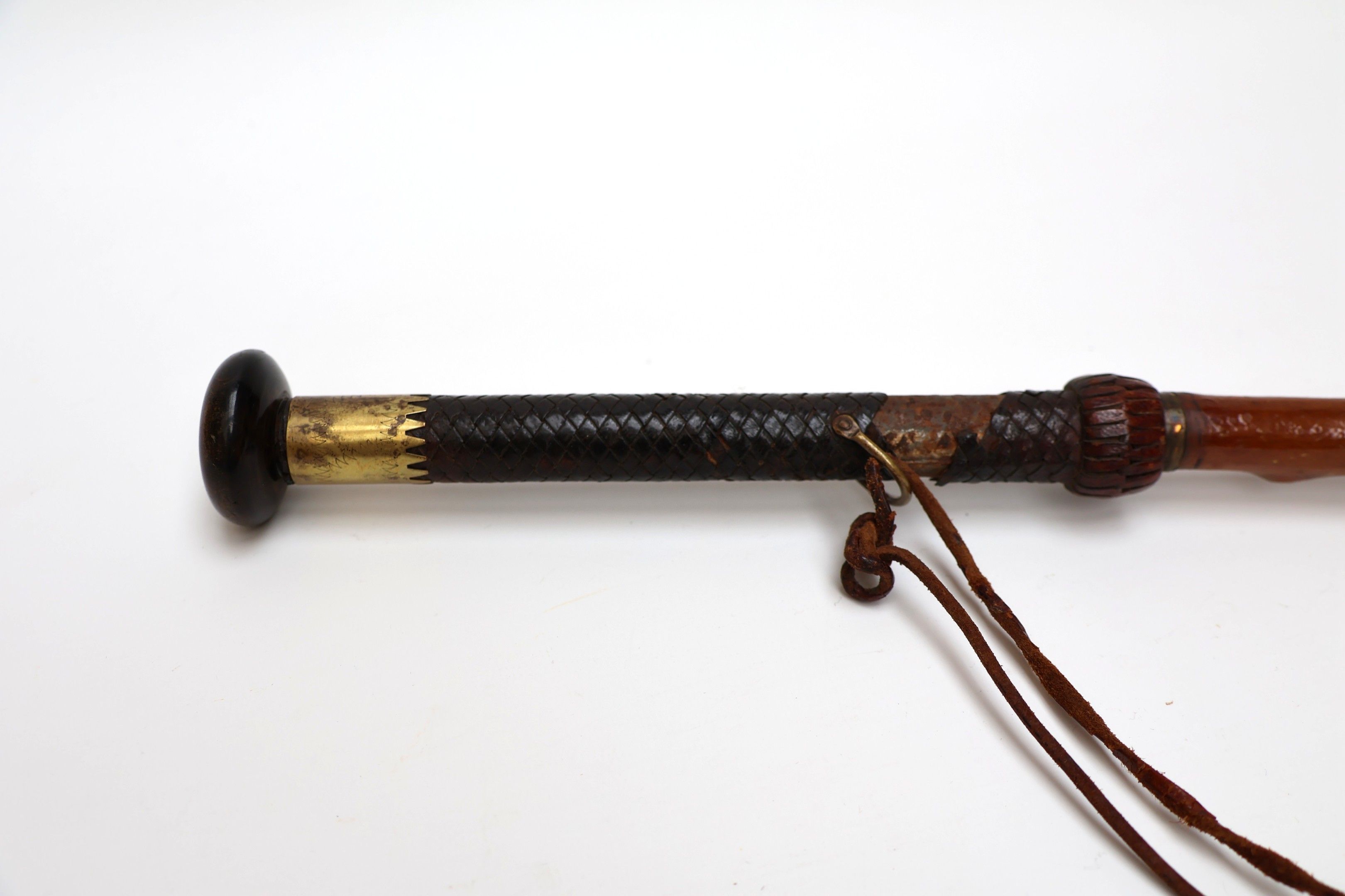 Basque defence cane known as a "Makila" with a medlar tree shaft revealing a braided leather handle with horn knob and dragon, engraved brass ring.