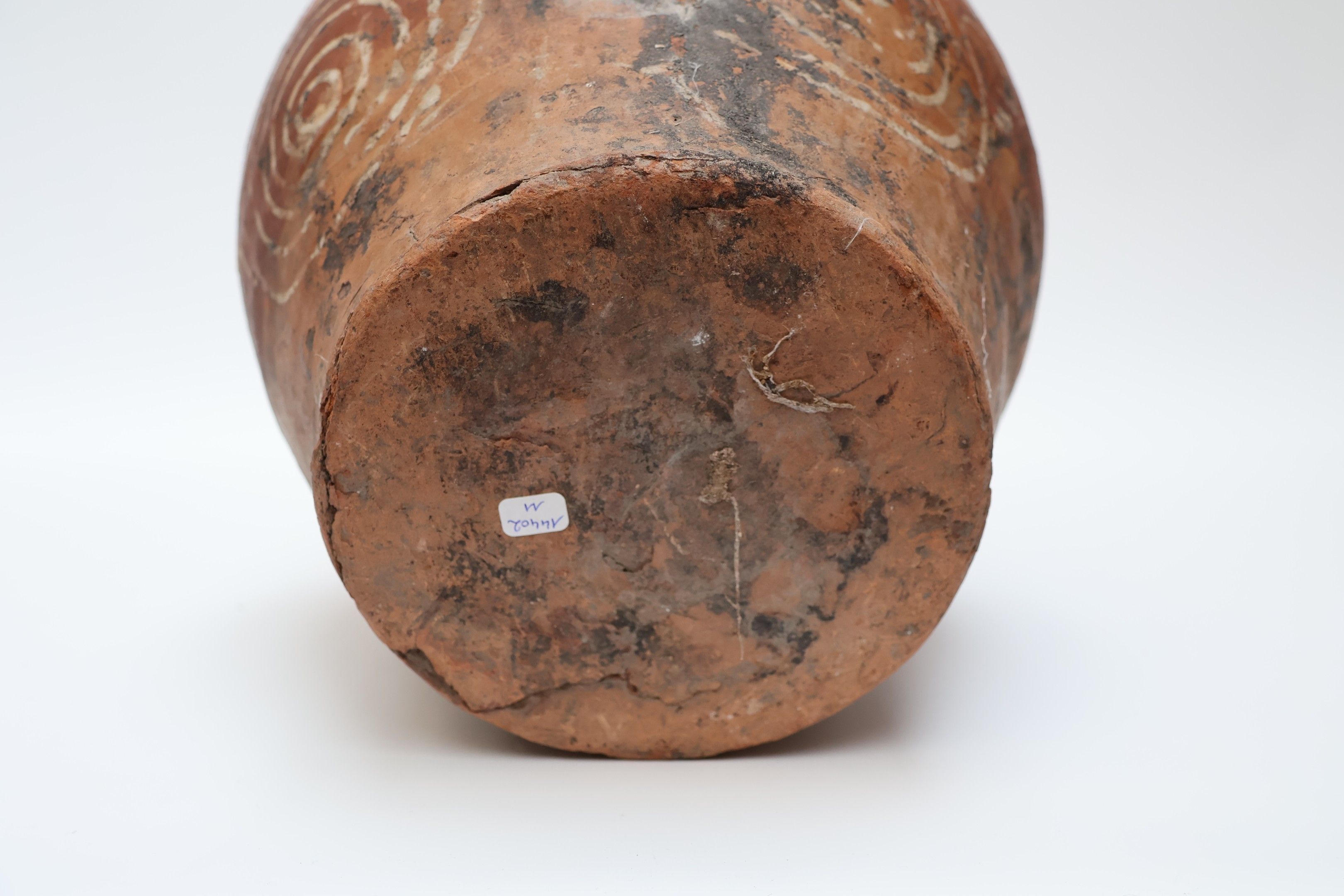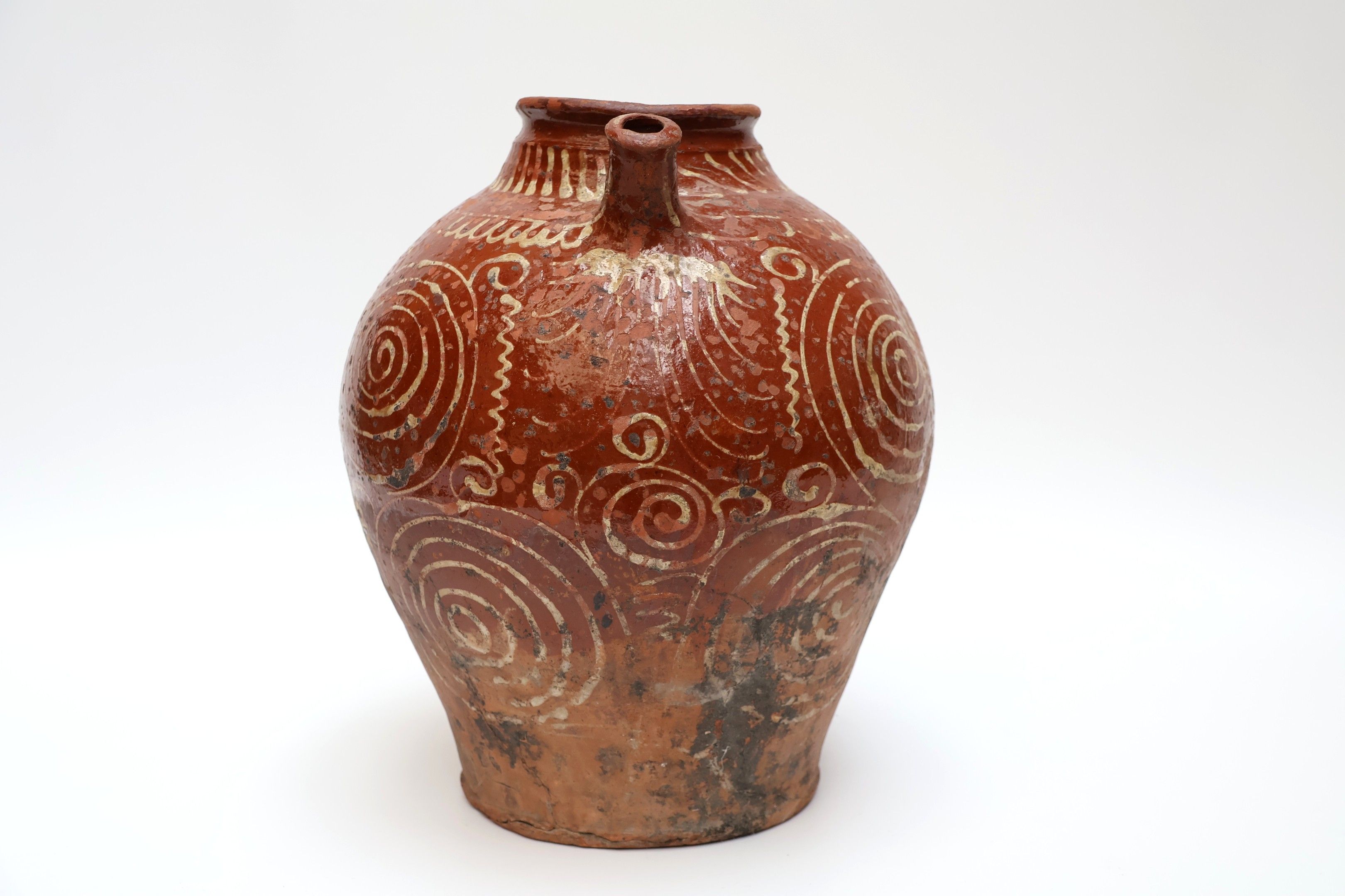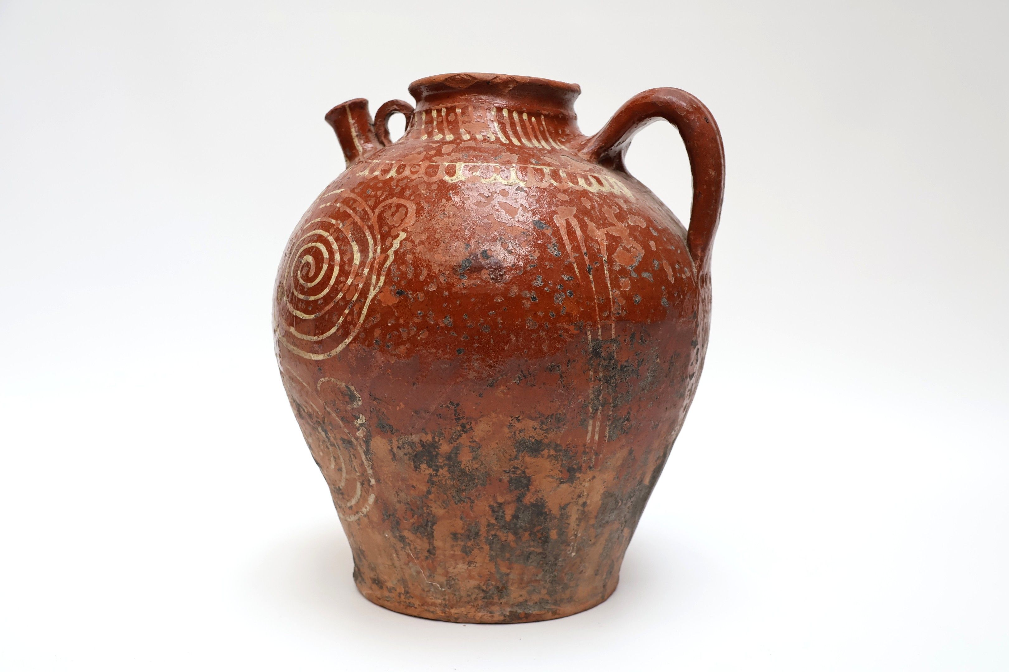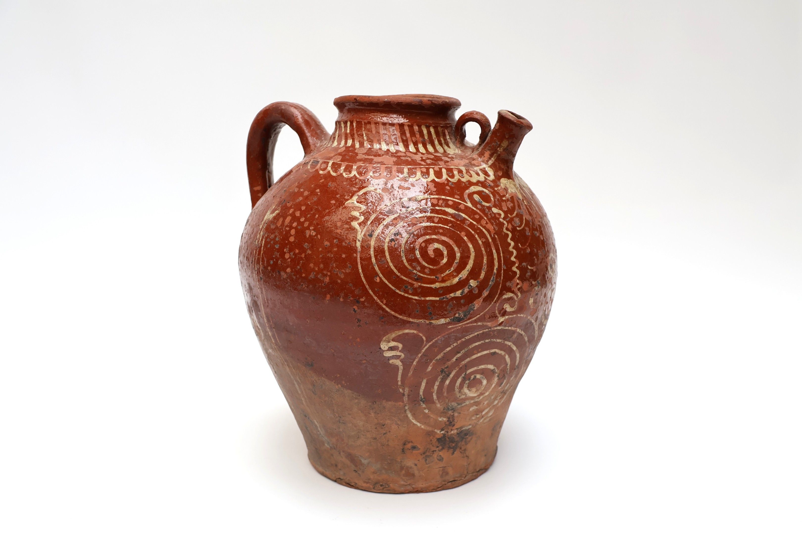 Bressane jug in glazed earthenware with brown glaze and yellow slip decoration of stylised motifs