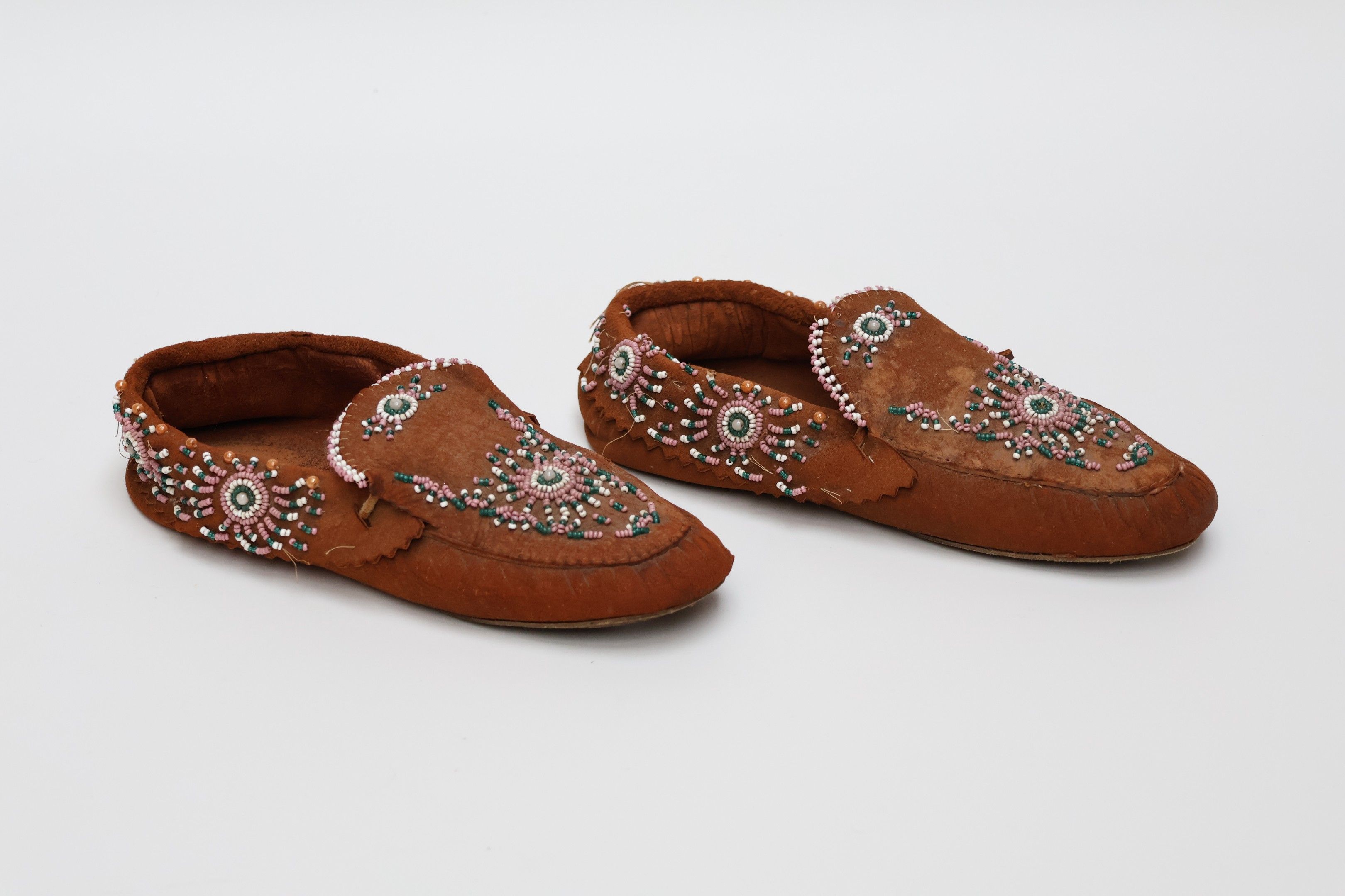 Pair of brown suede moccasins decorated with polychrome pearls forming stylised floral motifs