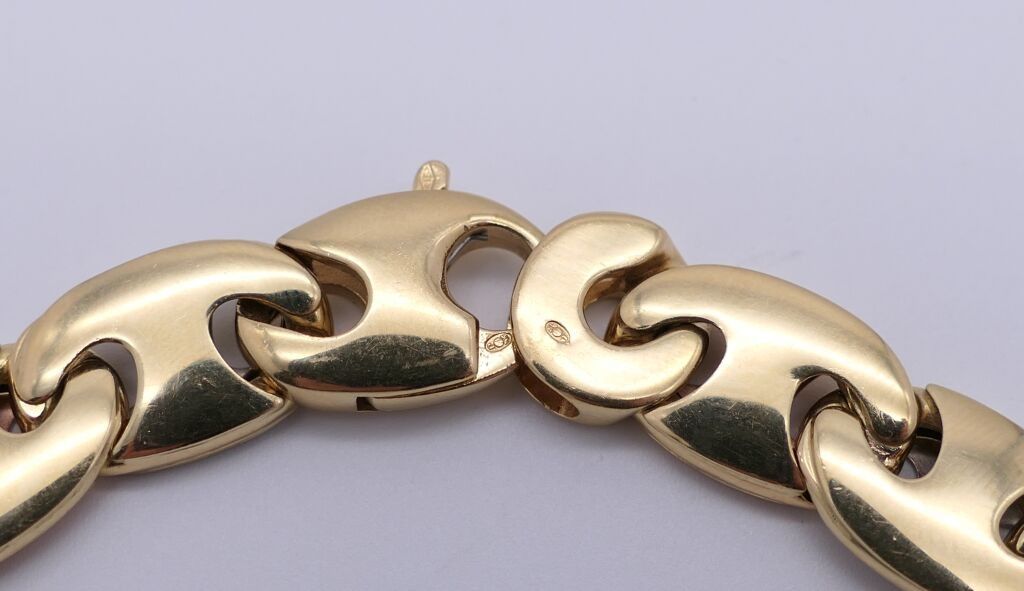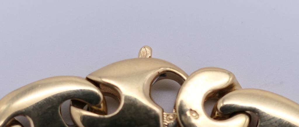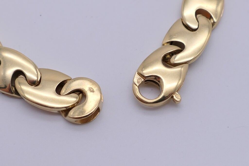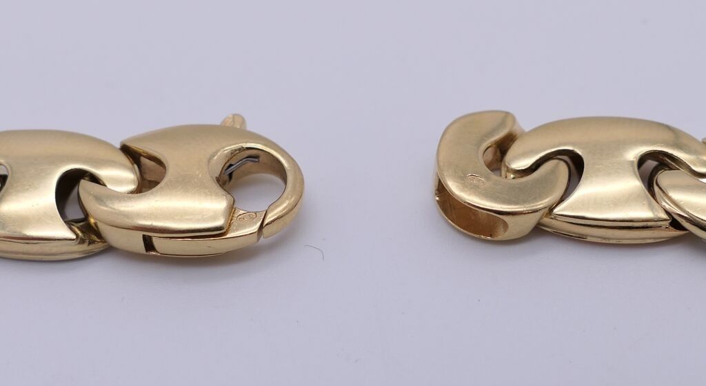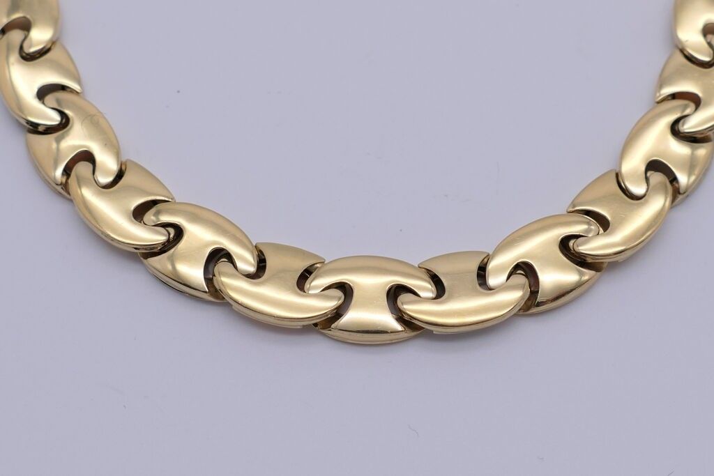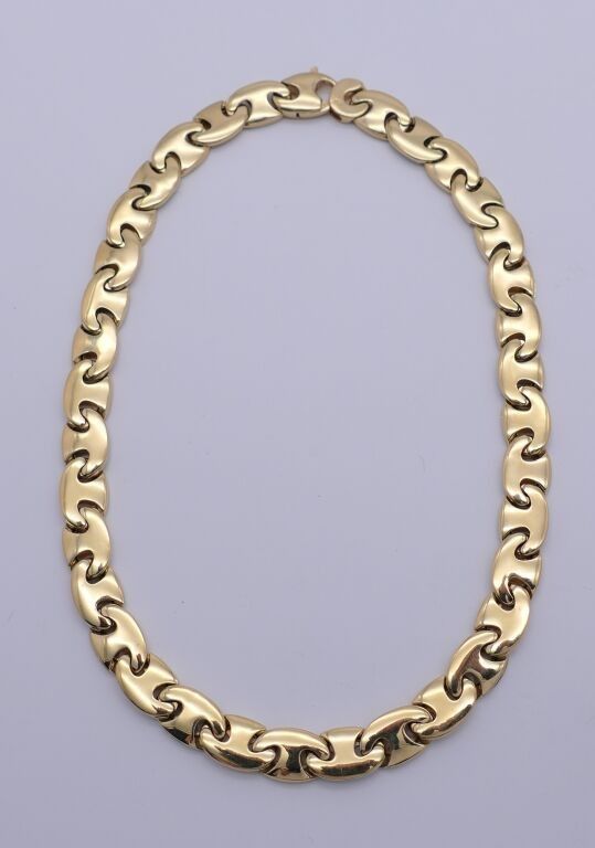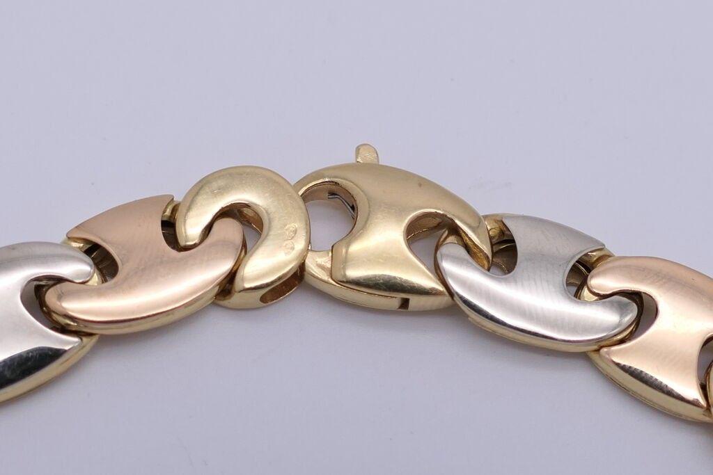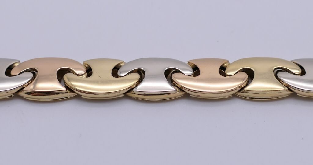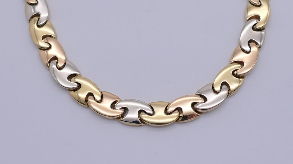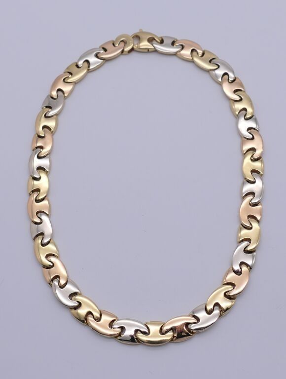 Beautiful double-sided necklace (yellow gold and 3-tone gold) in gold 750. L. 42 cm. Weight: 64g.