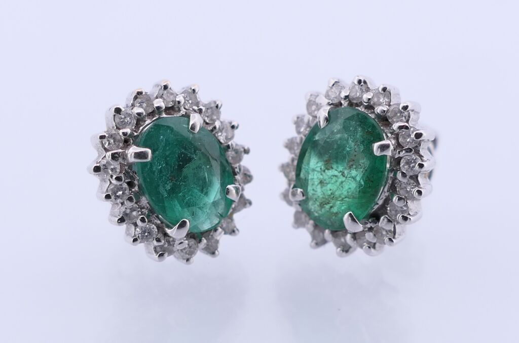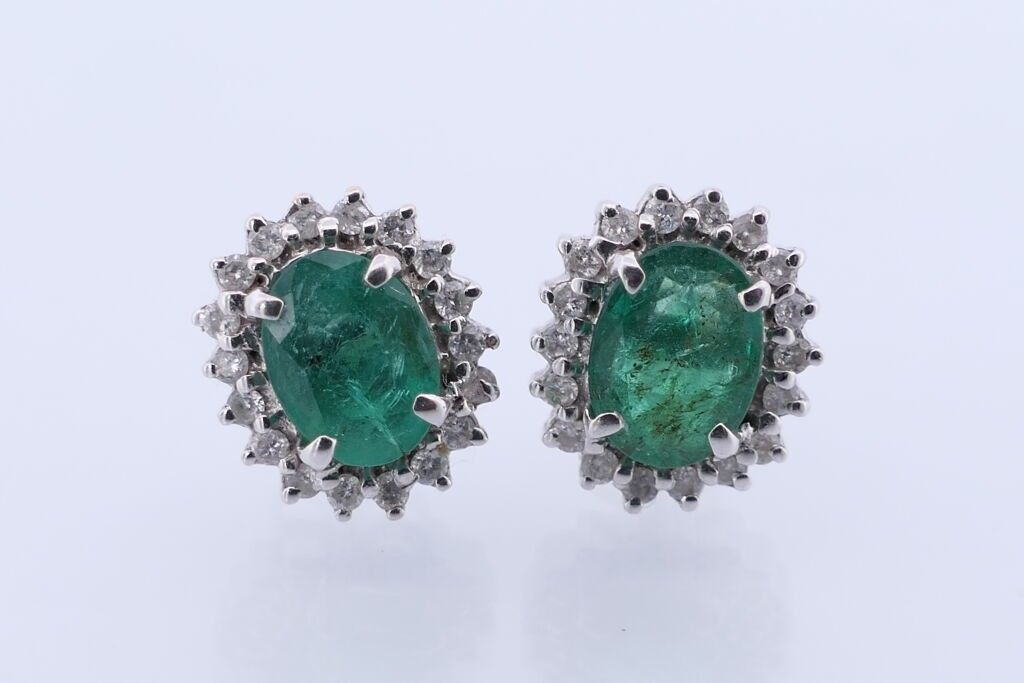 Pair of BO in white gold 750 set with two emeralds surrounded by diamonds. PB. 3.9g.