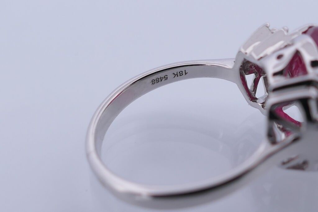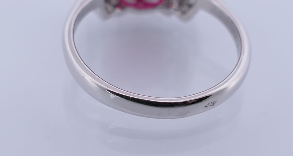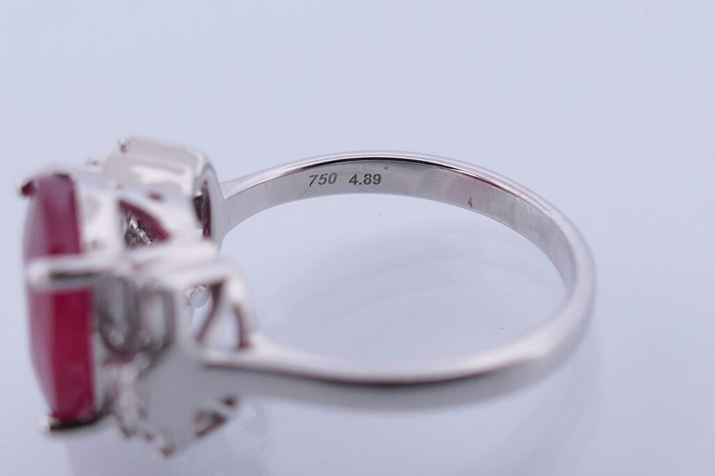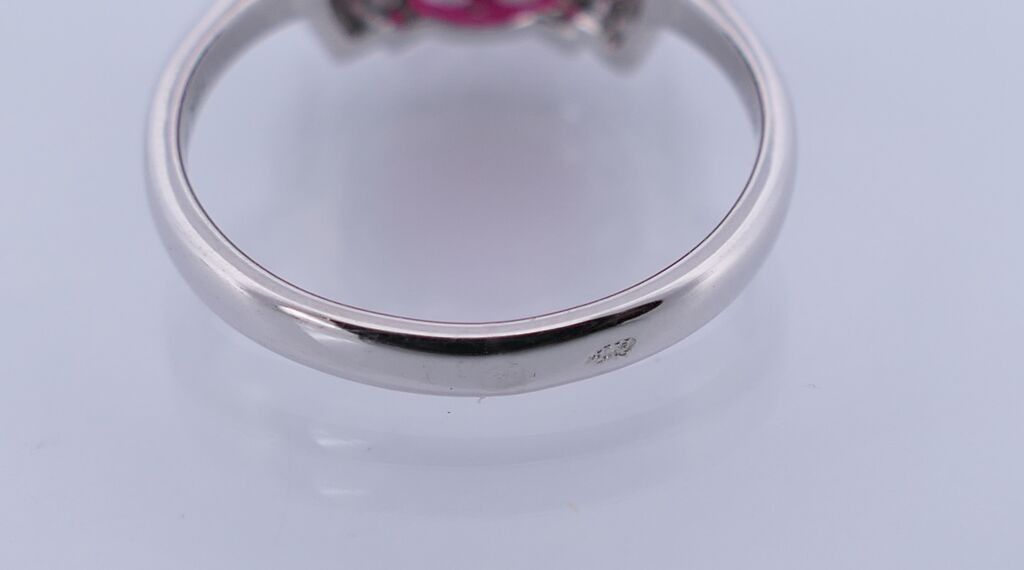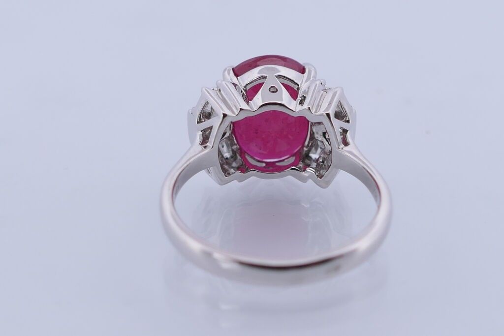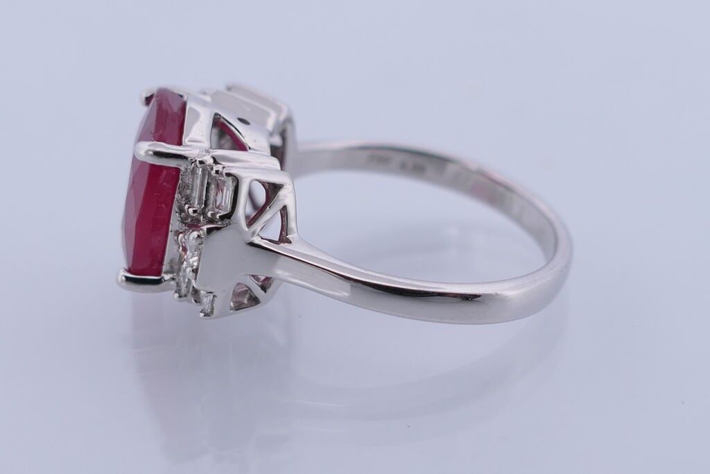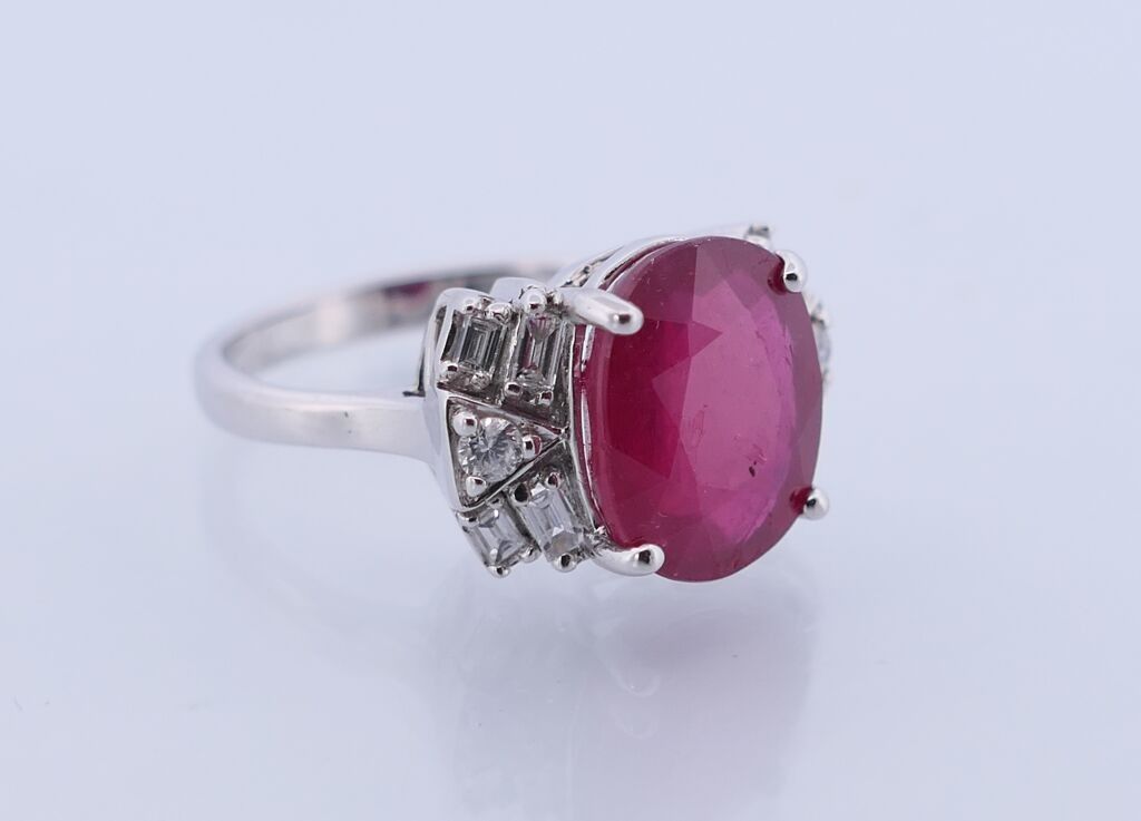 Ring in 750°/.(18K) white gold weighing 5g30 set with an oval-cut treated ruby weighing 4.90 carats set with baguette-cut and modern diamonds weighing 0.25 carat. TDD: 52.5.