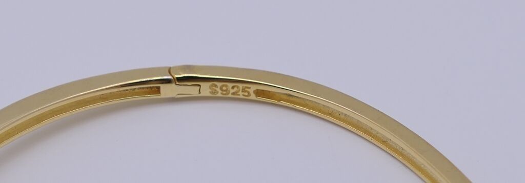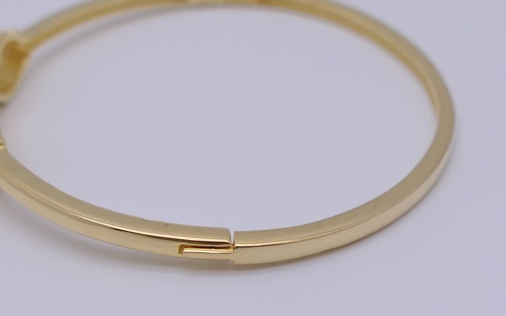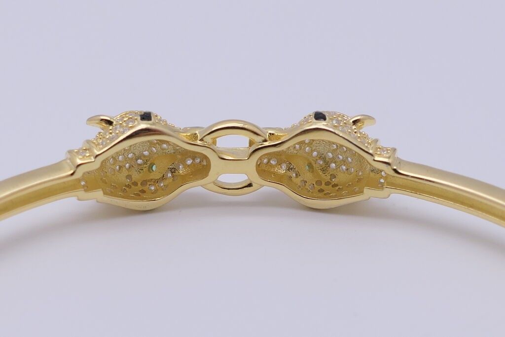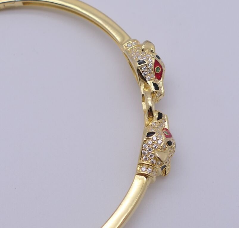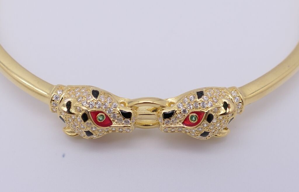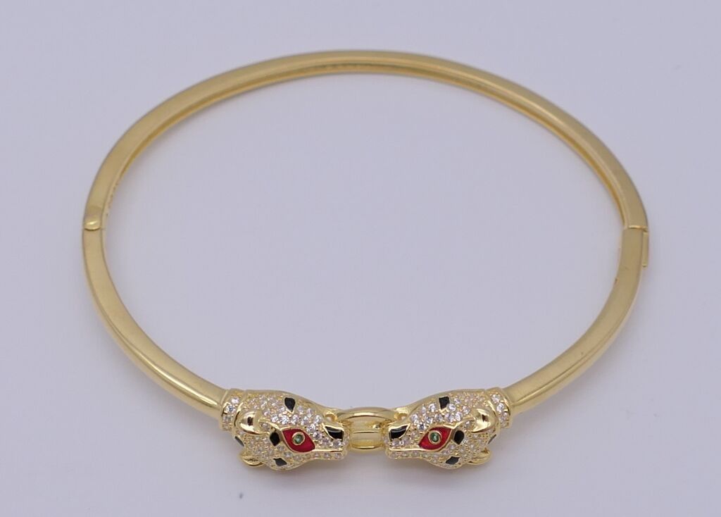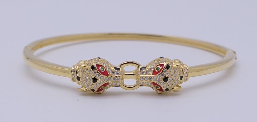 Gilt silver bangle with confronted panther heads, red enamelled eyes set with emeralds, heads paved with white stones. PB: 12.2 g.