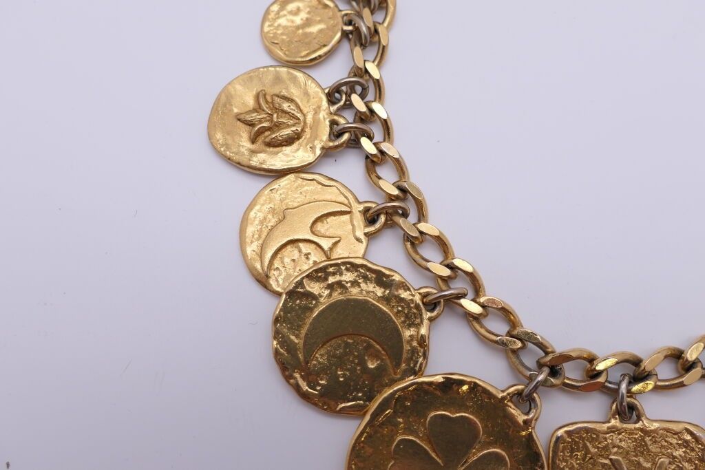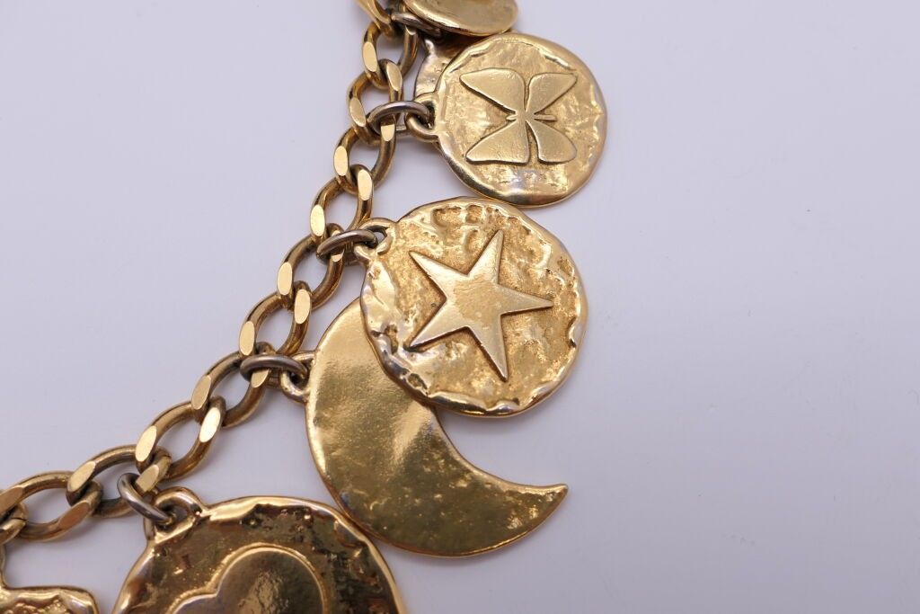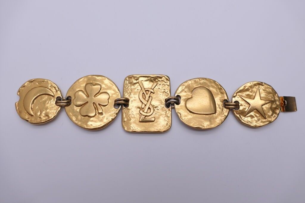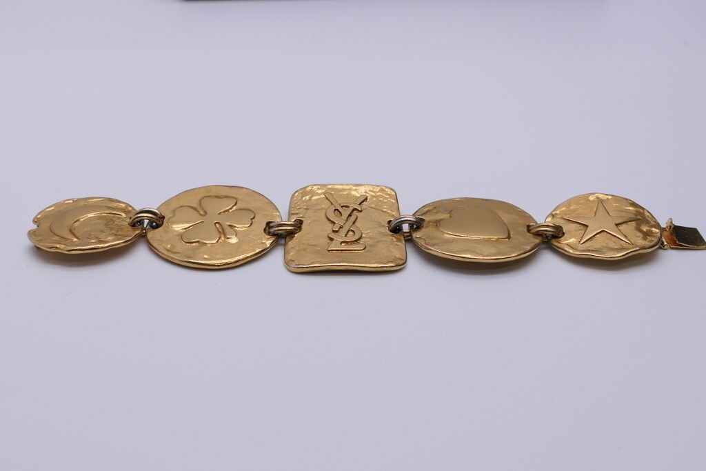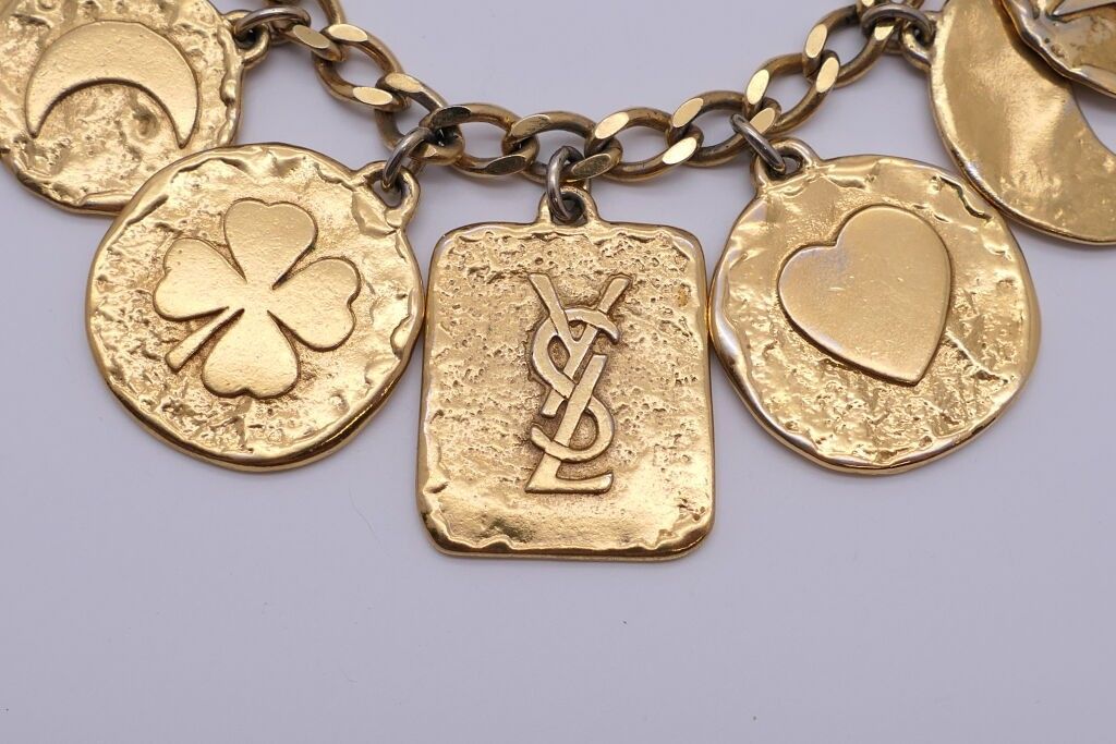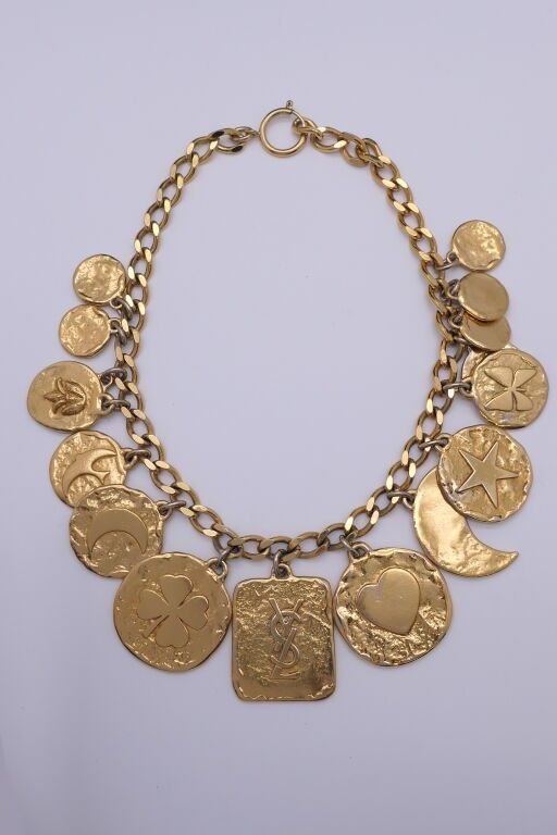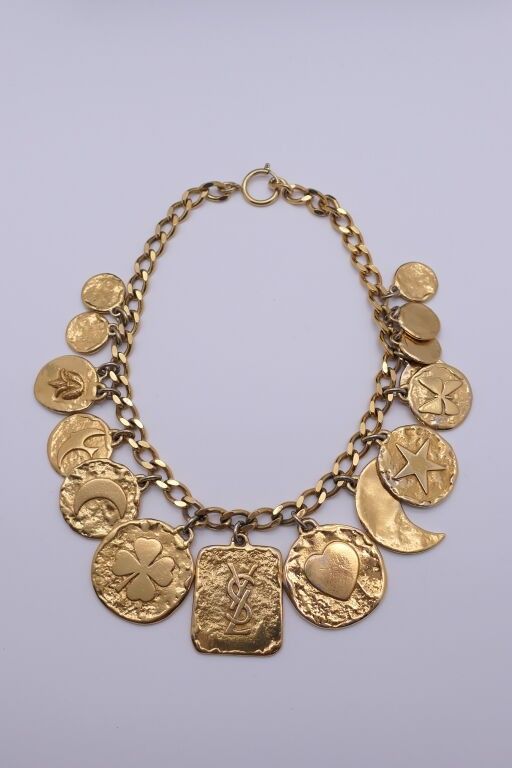 YVES SAINT LAURENT Gilt metal set comprising necklace and bracelet with round drop tassels decorated with the YSL logo, four-leaf clovers, butterflies, stars, moons and a bird, matched with a pair of earrings bearing the YSL logo. Signed. Necklace length: 42cm. Length of bracelet: 19cm. With two boxes.