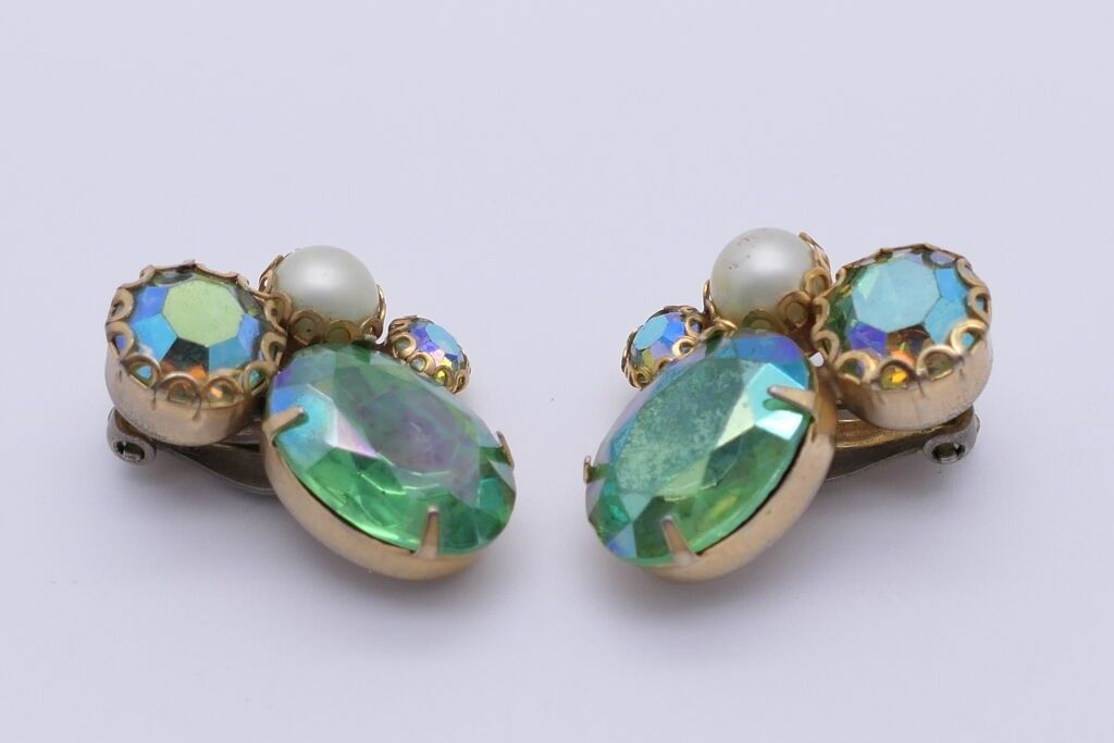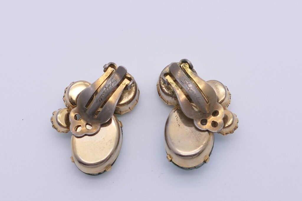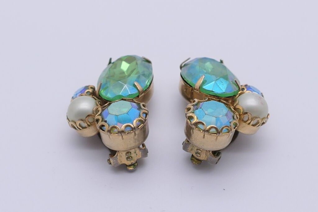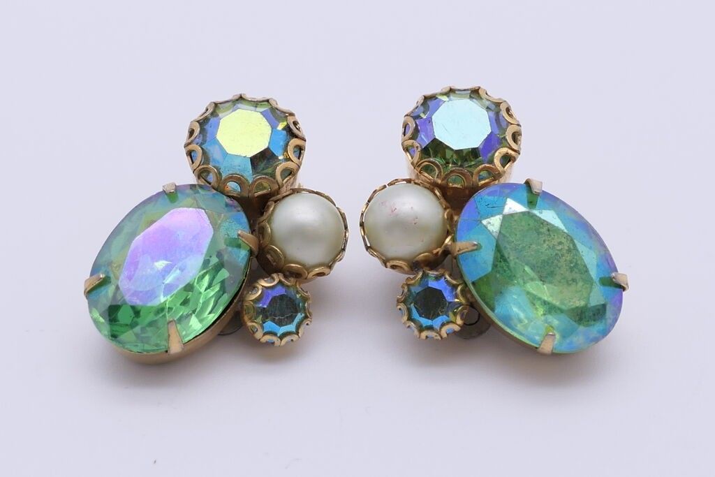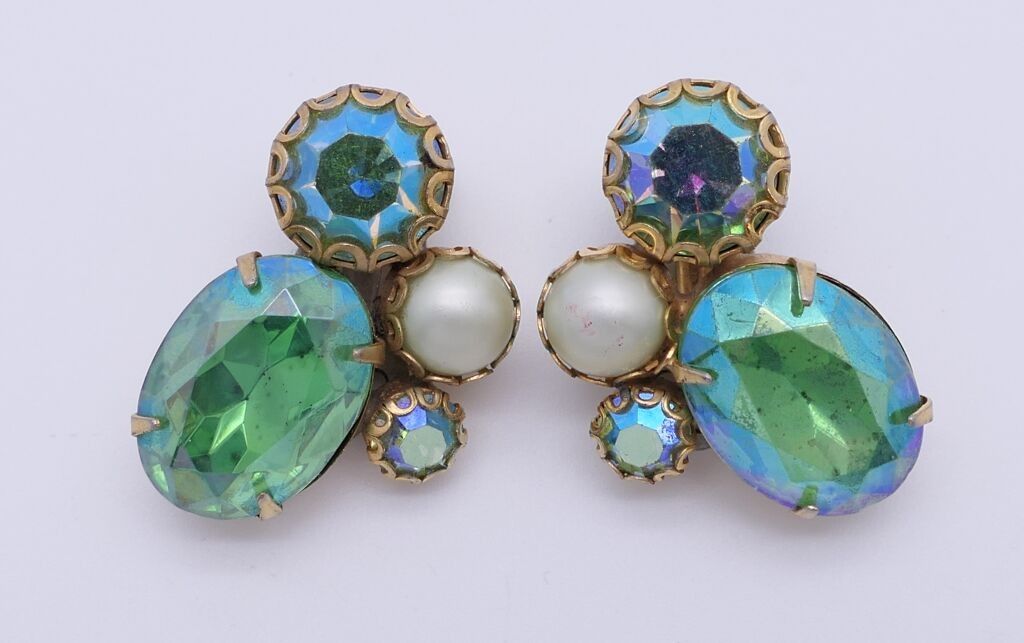 SCHIAPARELLI. Pair of earrings in gilt metal, fantasy pearls and faceted glass, signed. L. 3 cm.