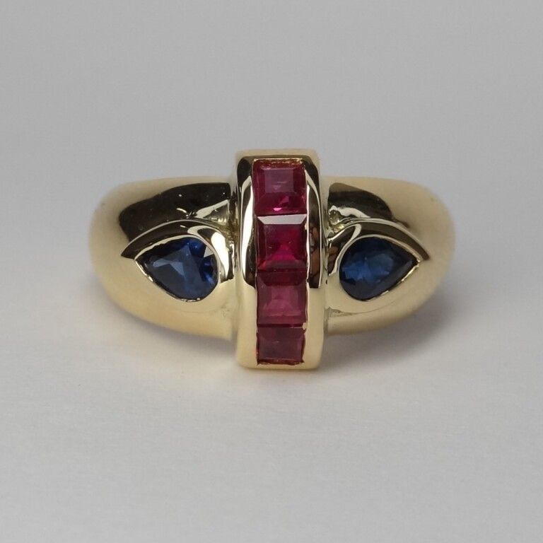 Art Deco style ring in 18 carat gold, hallmarked "eagle's head", 7g80, set with 4 calibrated rubies approx.