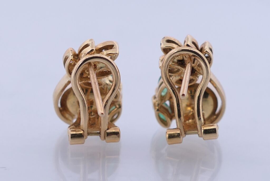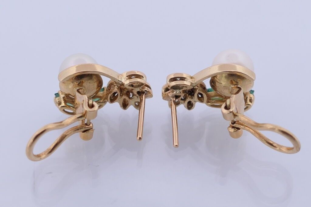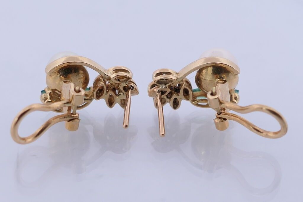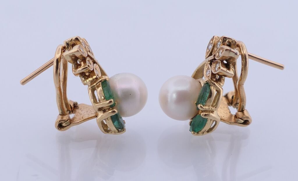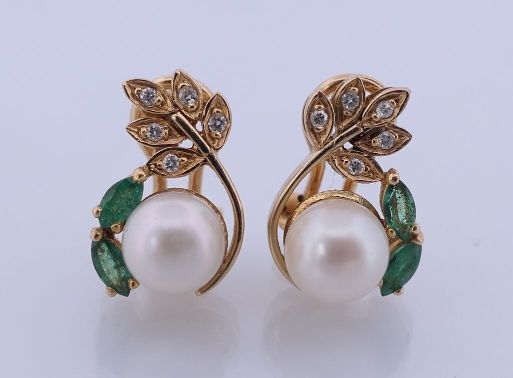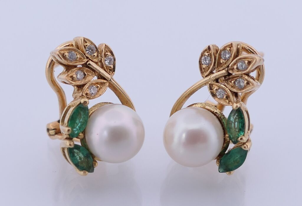 Pair of pierced ear clips in yellow gold set with emeralds, diamonds and a pearl. PB. 8.2g.