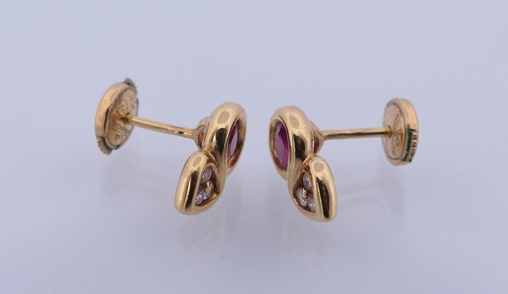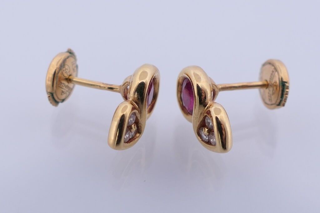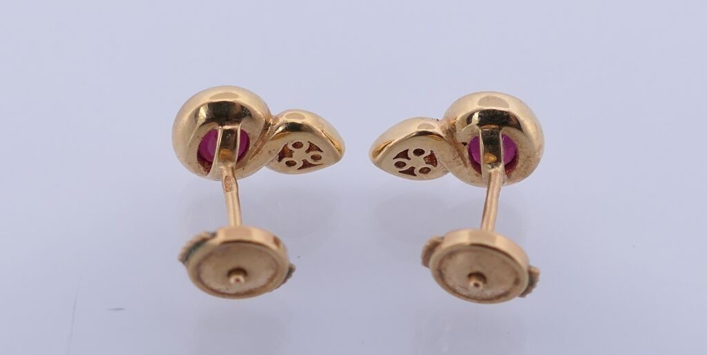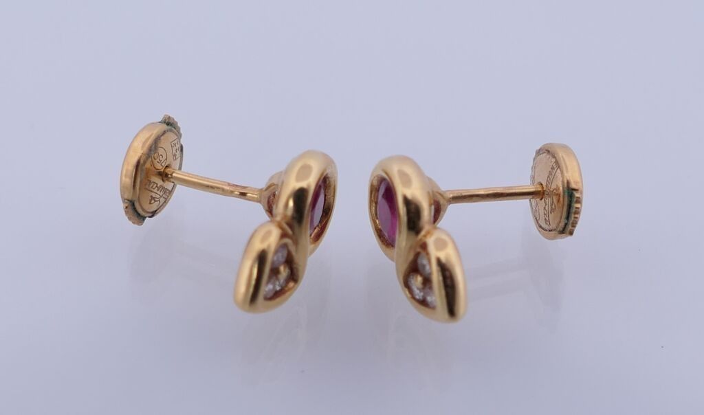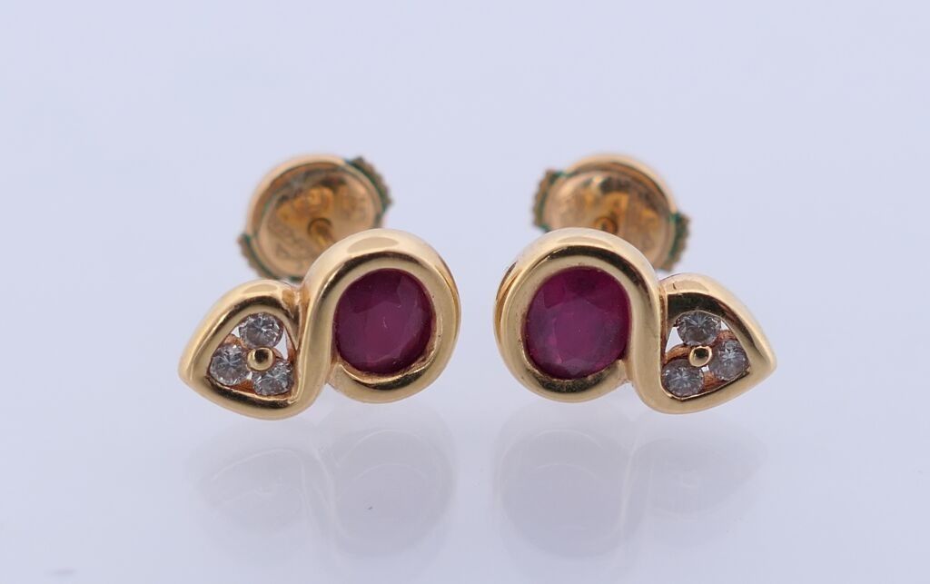 Pair of yellow gold stud earrings each set with a faceted oval ruby and 3 small diamonds. Alpa system. PB: ?