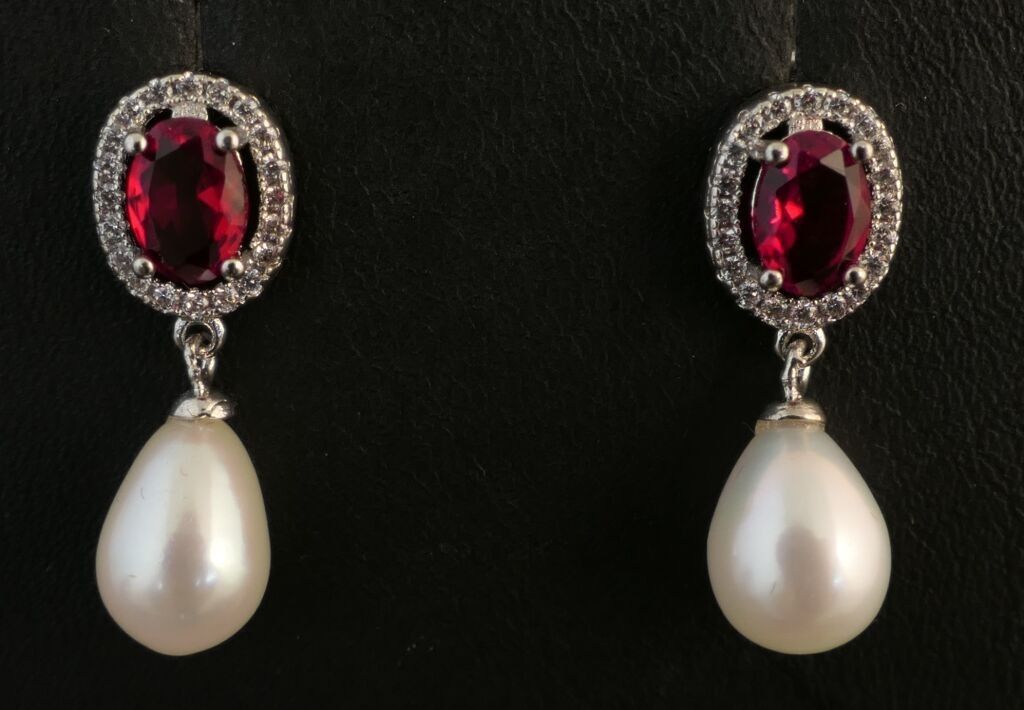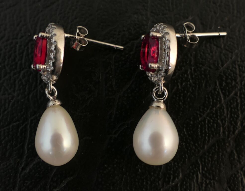 A pair of silver pendants set with a red stone surrounded by small white stones and adorned with a pear-shaped pearl. Weight: 3.38g