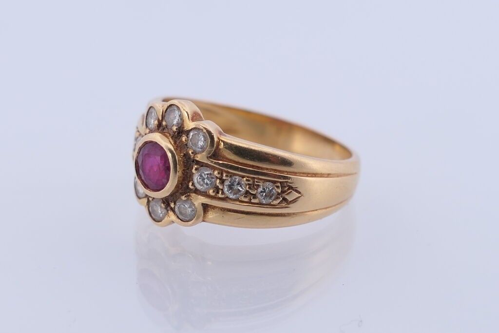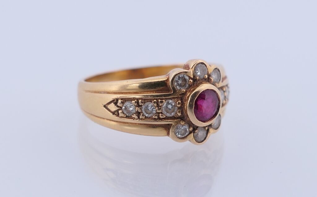 Ring in 750 yellow gold set with a round faceted ruby and di…