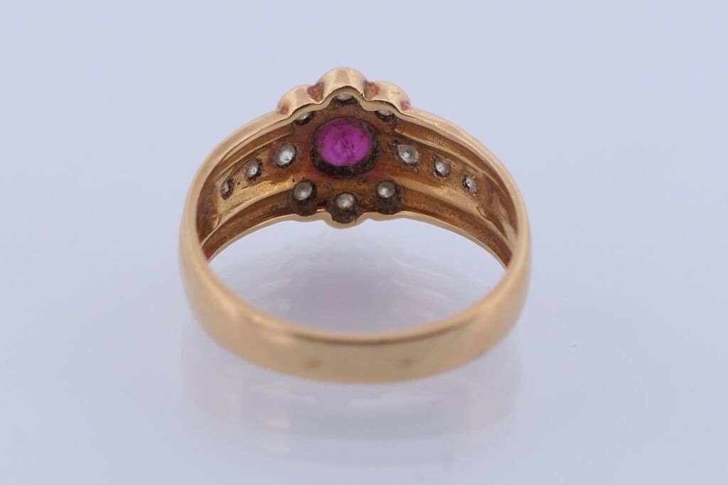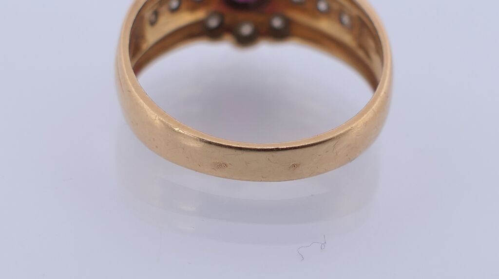 Ring in 750 yellow gold set with a round faceted ruby and diamonds. TDD. 54/55. PB.4.3g.