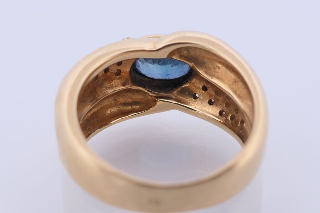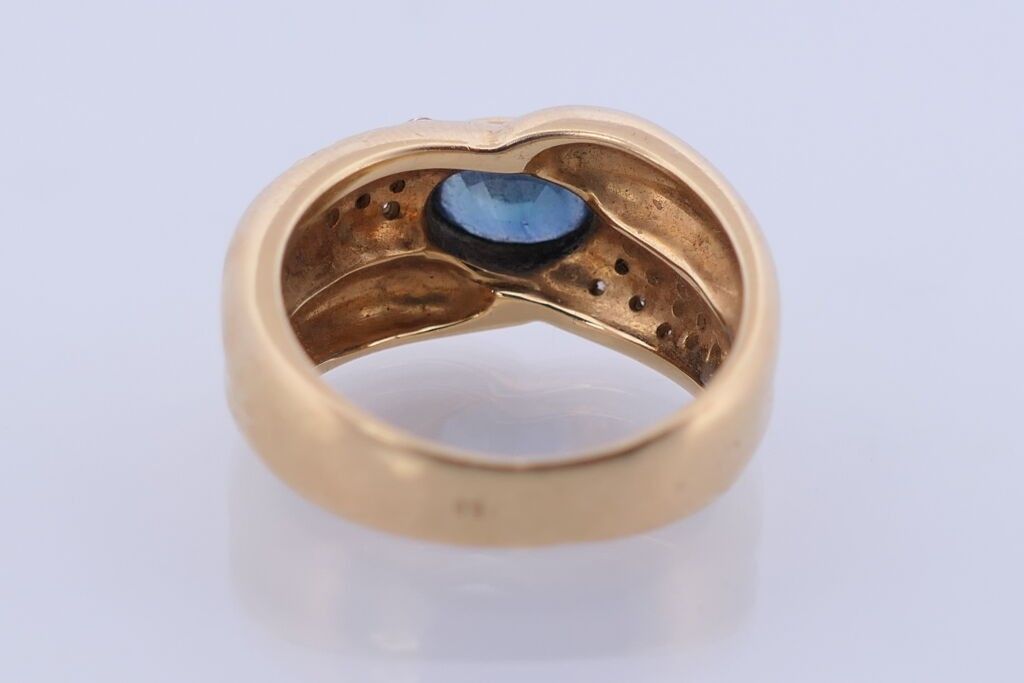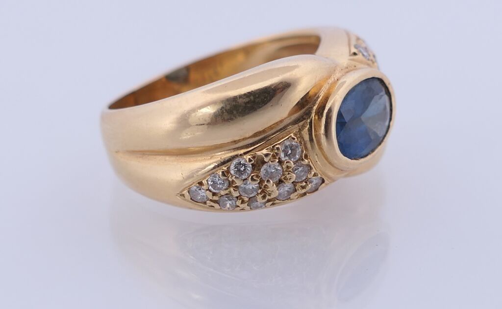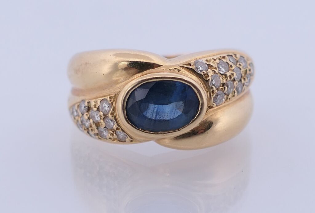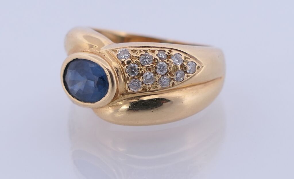 Ring in 750 yellow gold set with a faceted oval-cut sapphire…