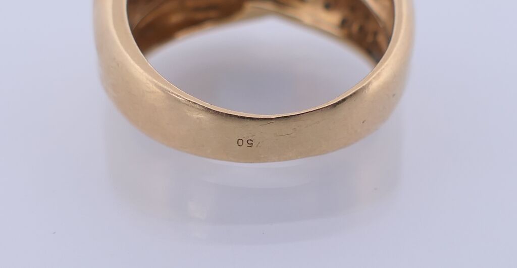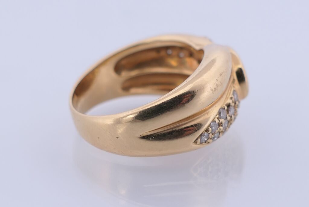 Ring in 750 yellow gold set with a faceted oval-cut sapphire set in pavé-cut diamonds. TDD. 57. PB.13.8g.