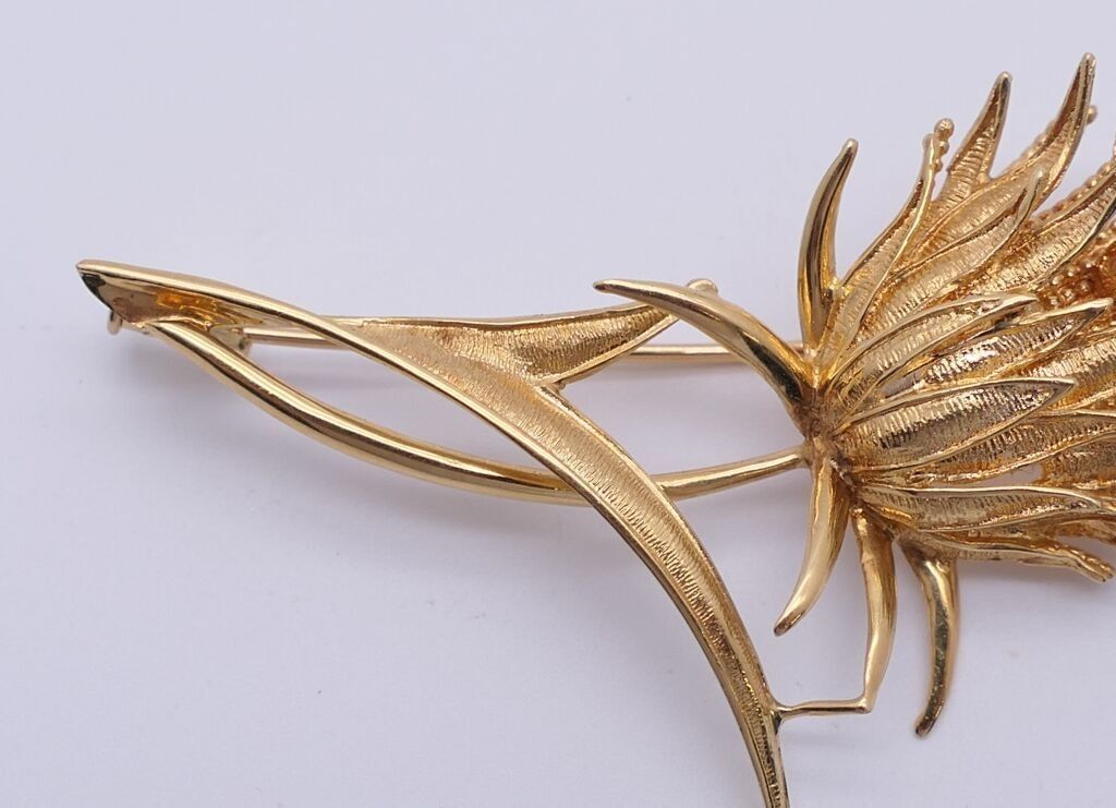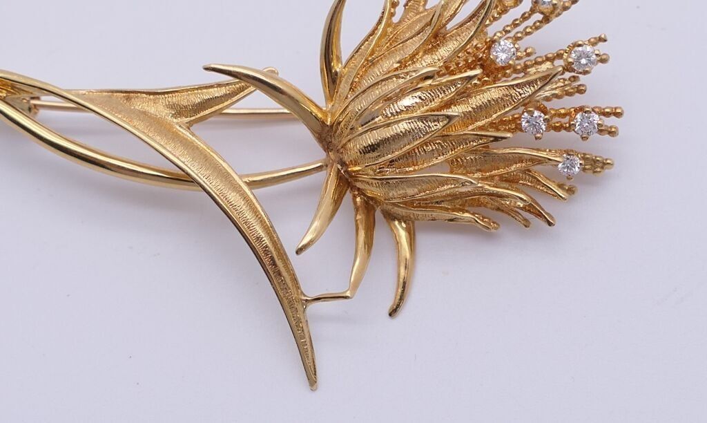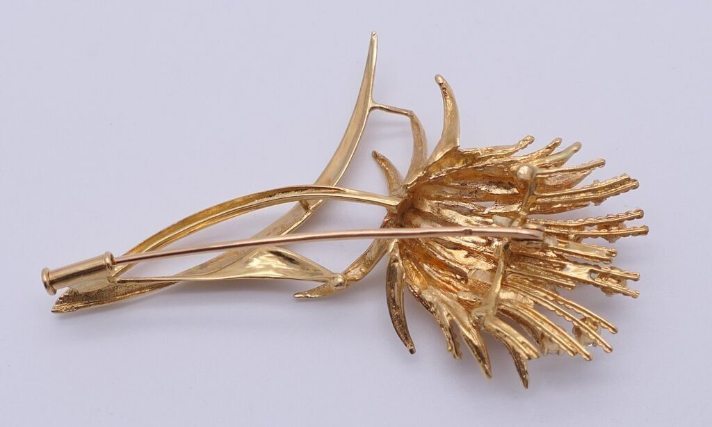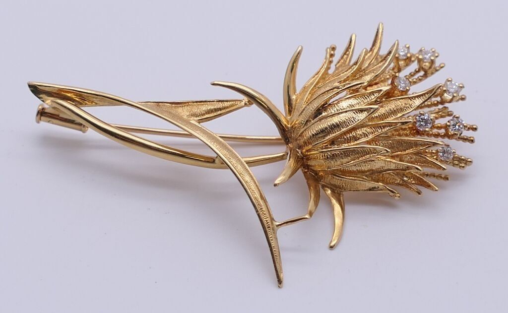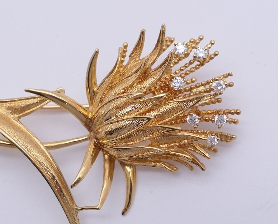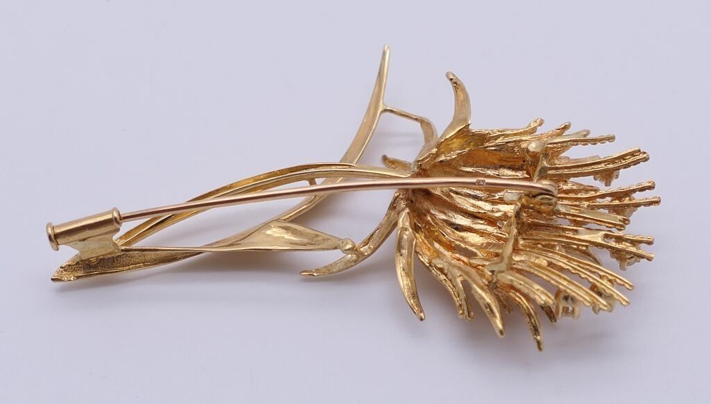 Brooch in 750 yellow gold depicting a thistle set with 7 small diamonds. WEIGHT 12.7g.