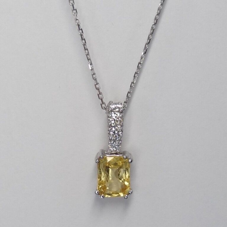 an emerald-cut 1.05 ct yellow sapphire set with 4 modern-cut 0.15 ct (0.14) white diamonds on the