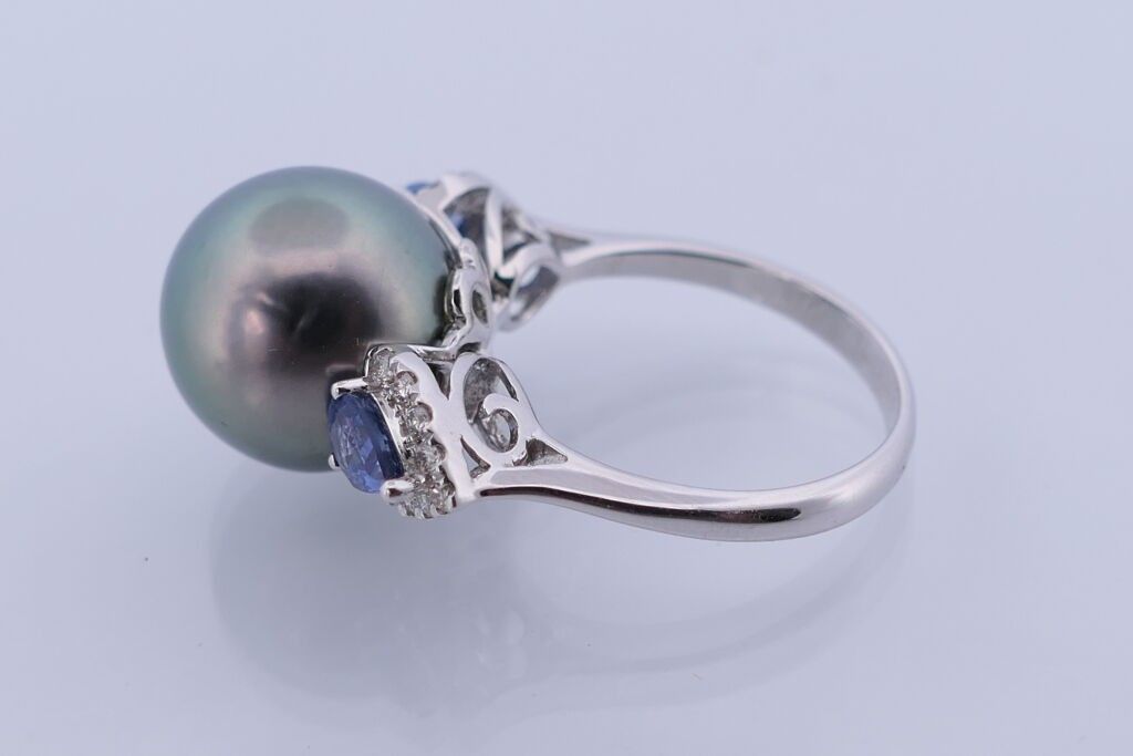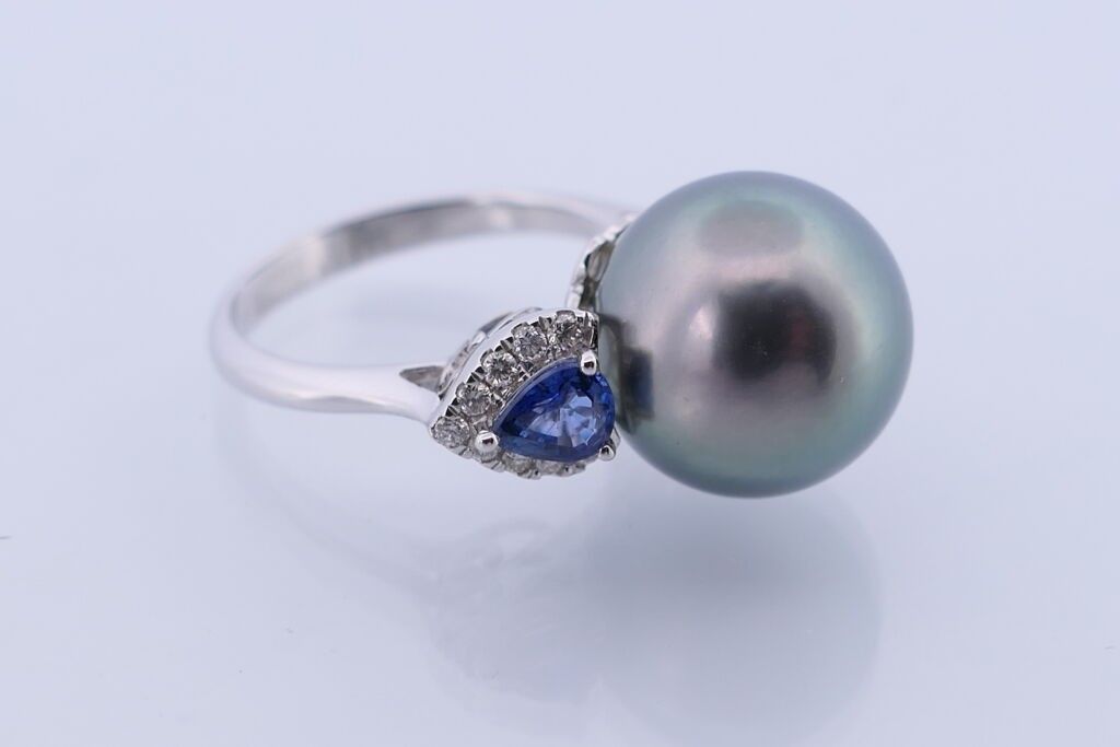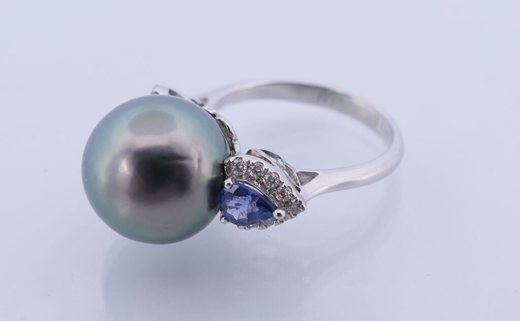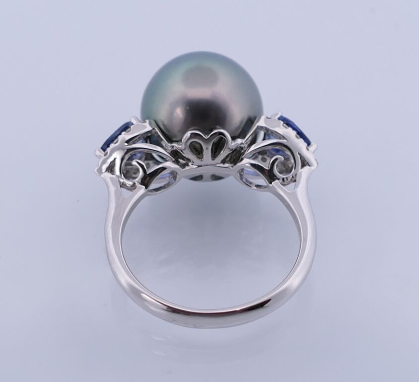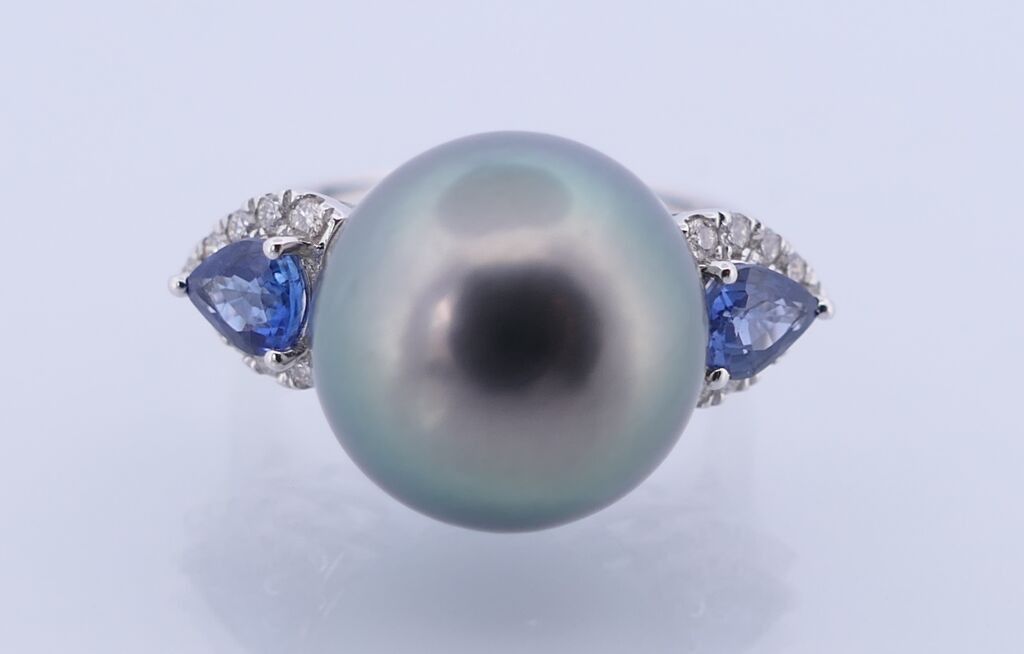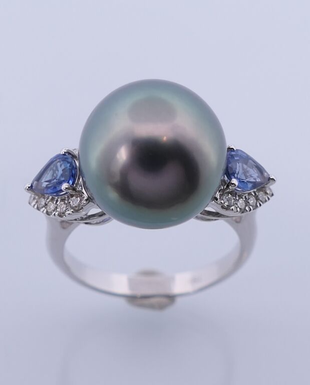 Cocktail ring in 750°/.(18K) white gold 6g70 set with an imposing 13 mm grey pearl set with two pear-cut sapphires weighing 0.80 carat surrounded by diamonds weighing 0.20 carat. TDD: 53.5.