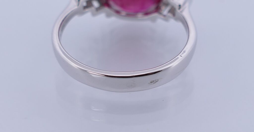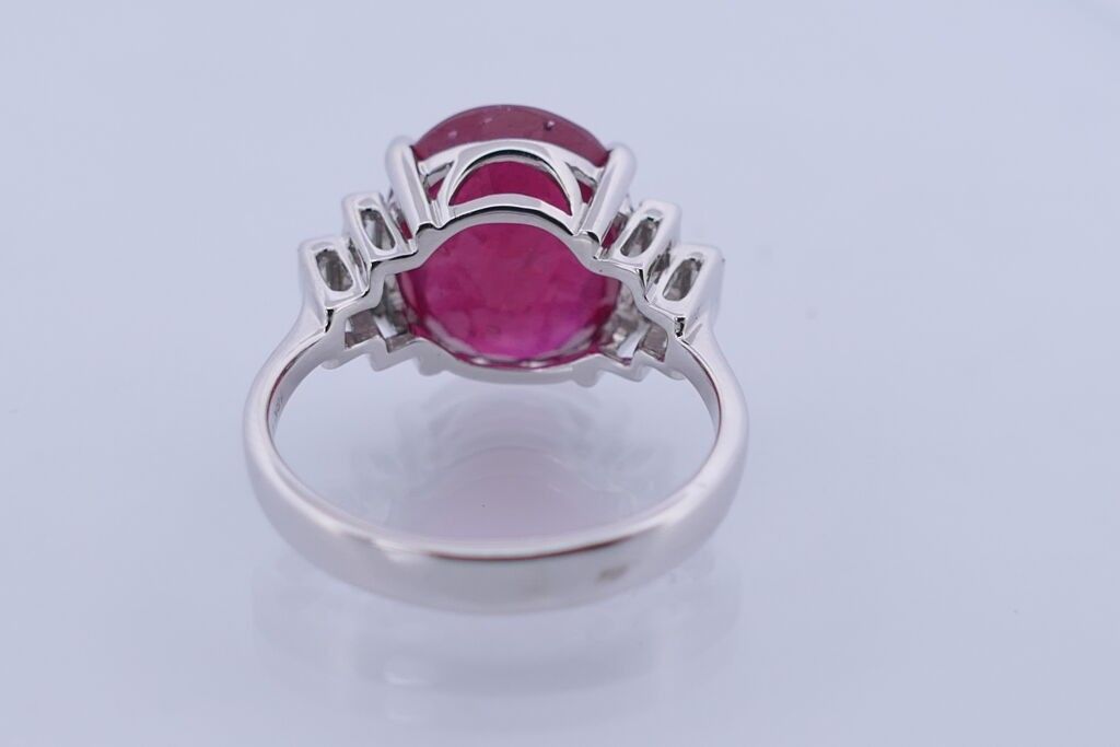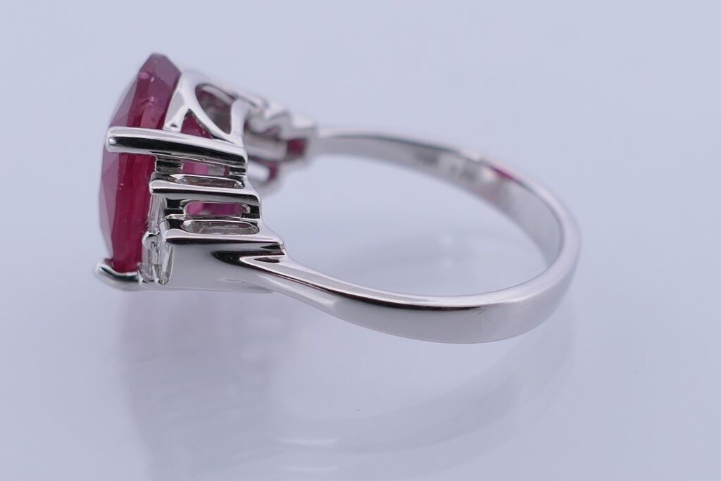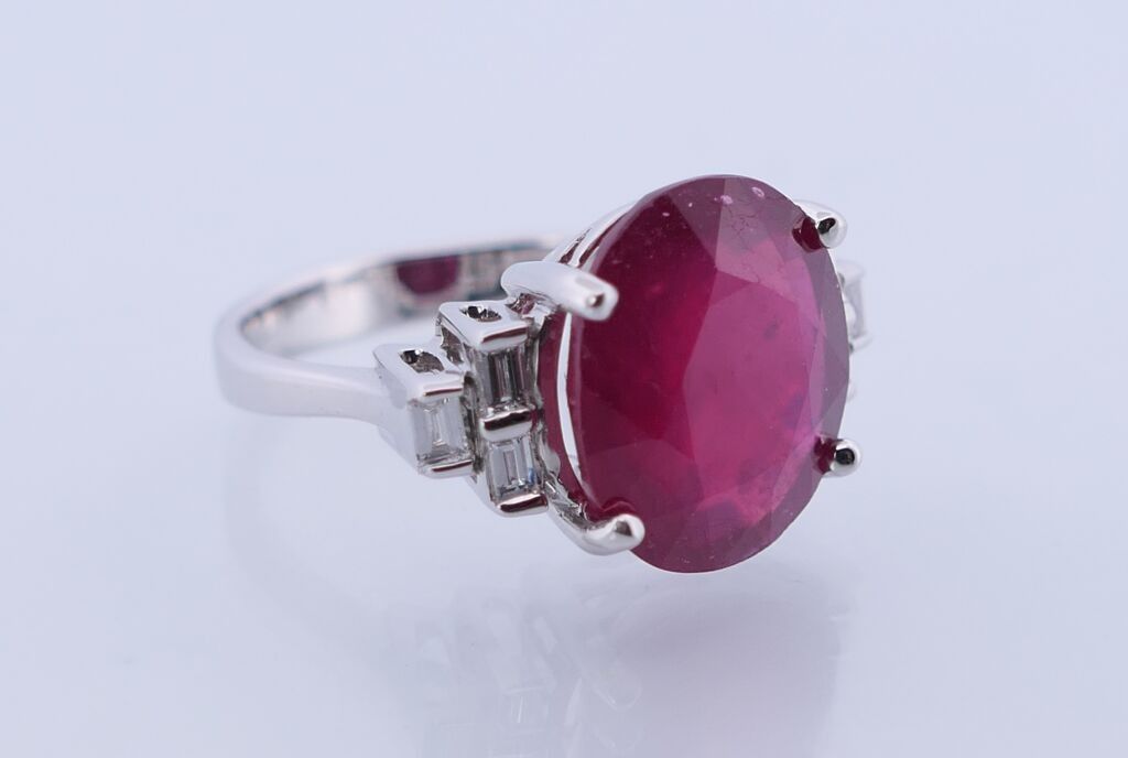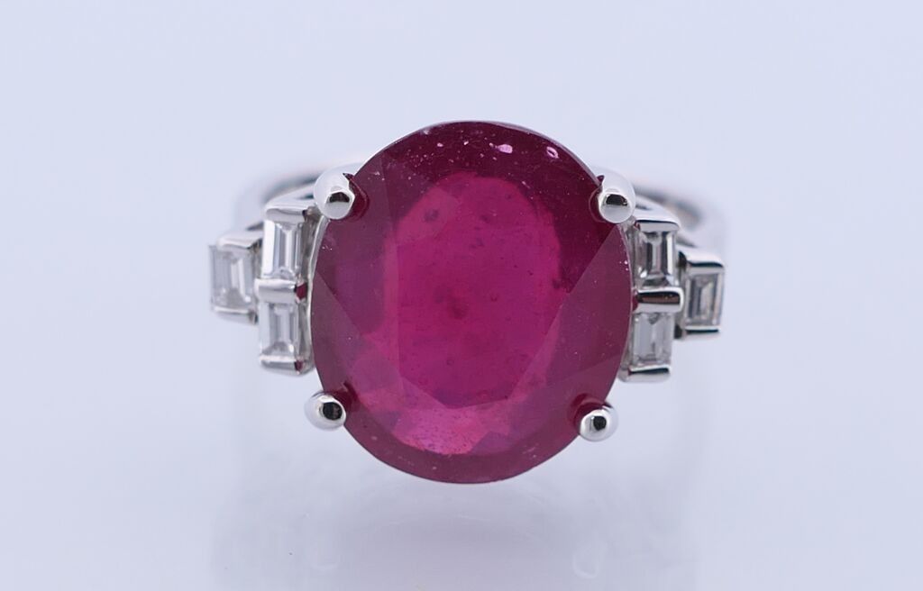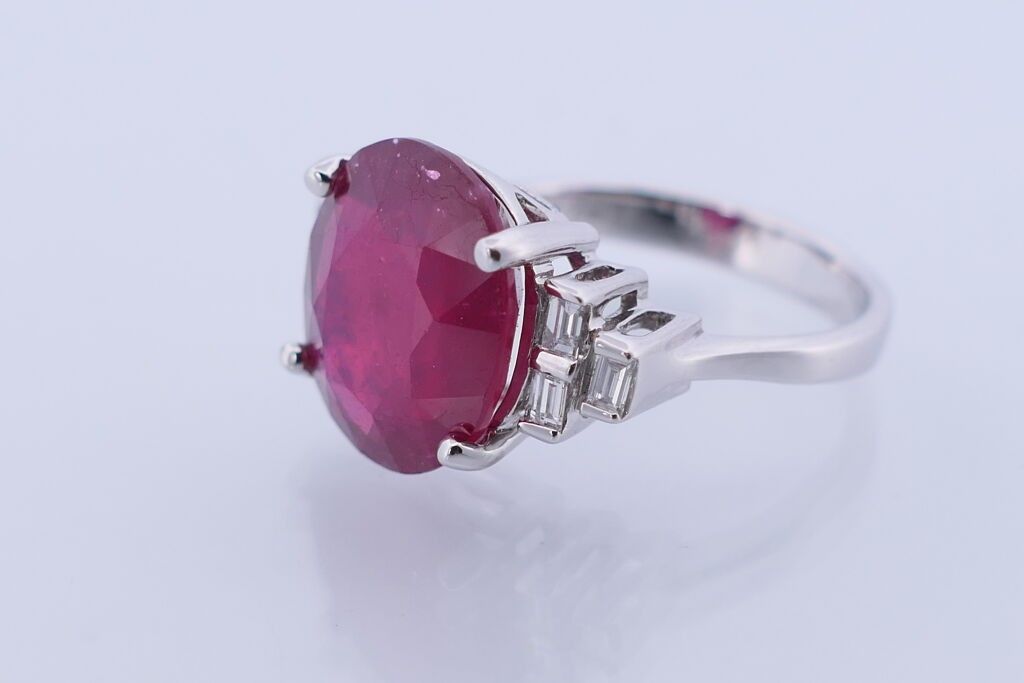 Art Deco style ring in 750°/.(18K) white gold 5g50 set with an oval-cut treated ruby weighing 7.10 carats set with baguette-cut diamonds weighing 0.15 carat. TDD: 53.