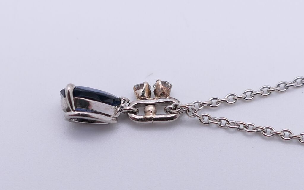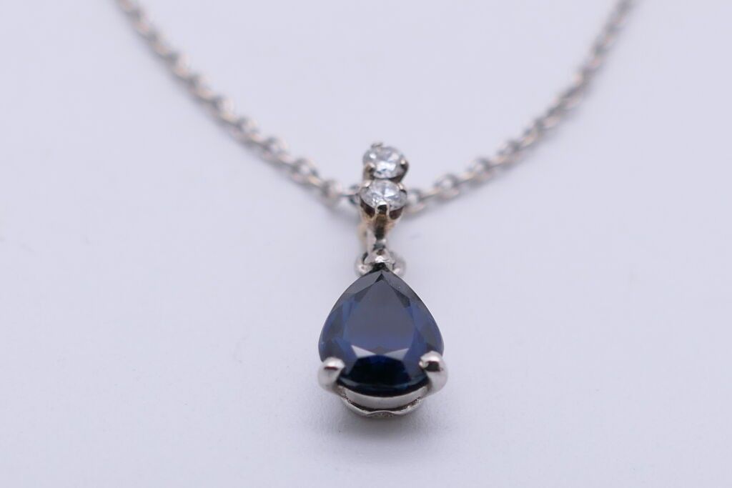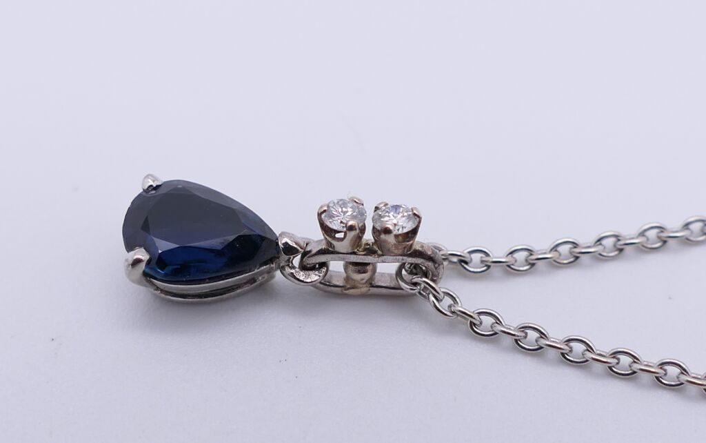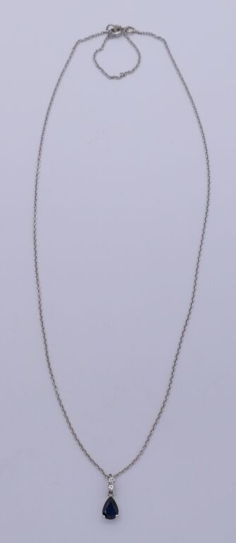 750 white gold chain with pear-shaped sapphire pendant and 2 diamonds. PB. 3.5g.