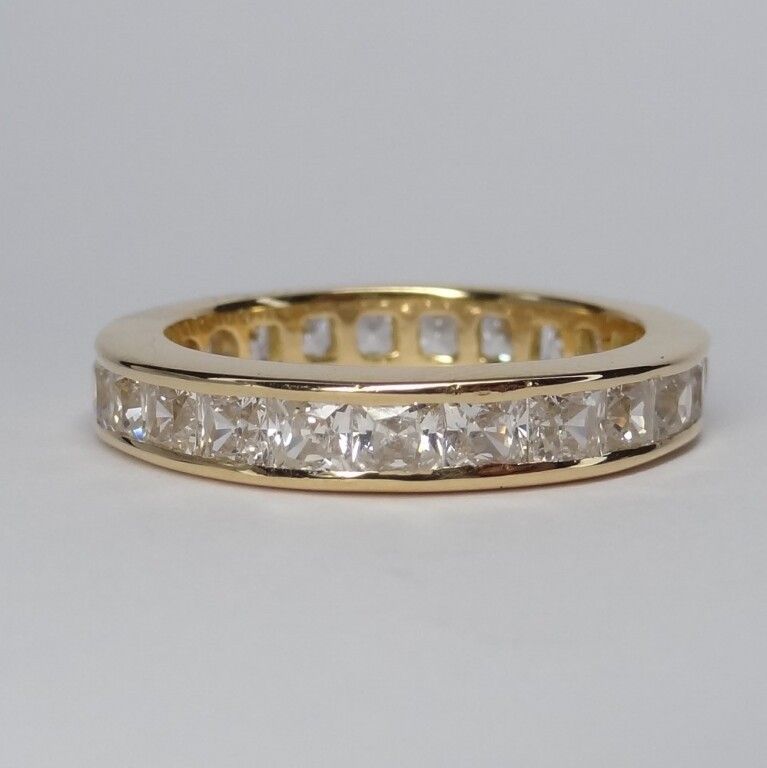 Rail" wedding band in 18 carat (750/1000) gold with "eagle head" hallmark, 6g25, set with 23 radian-cut white stones.