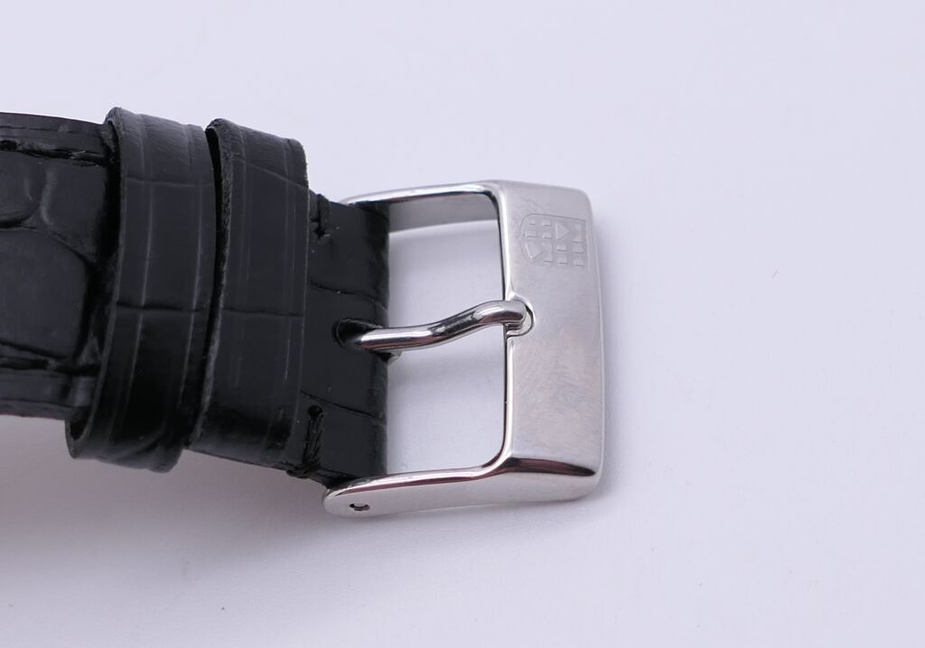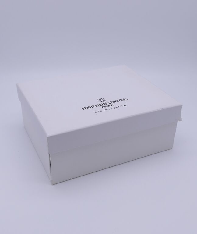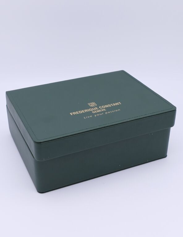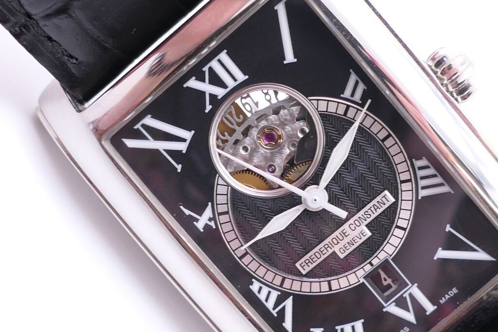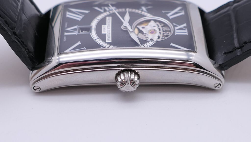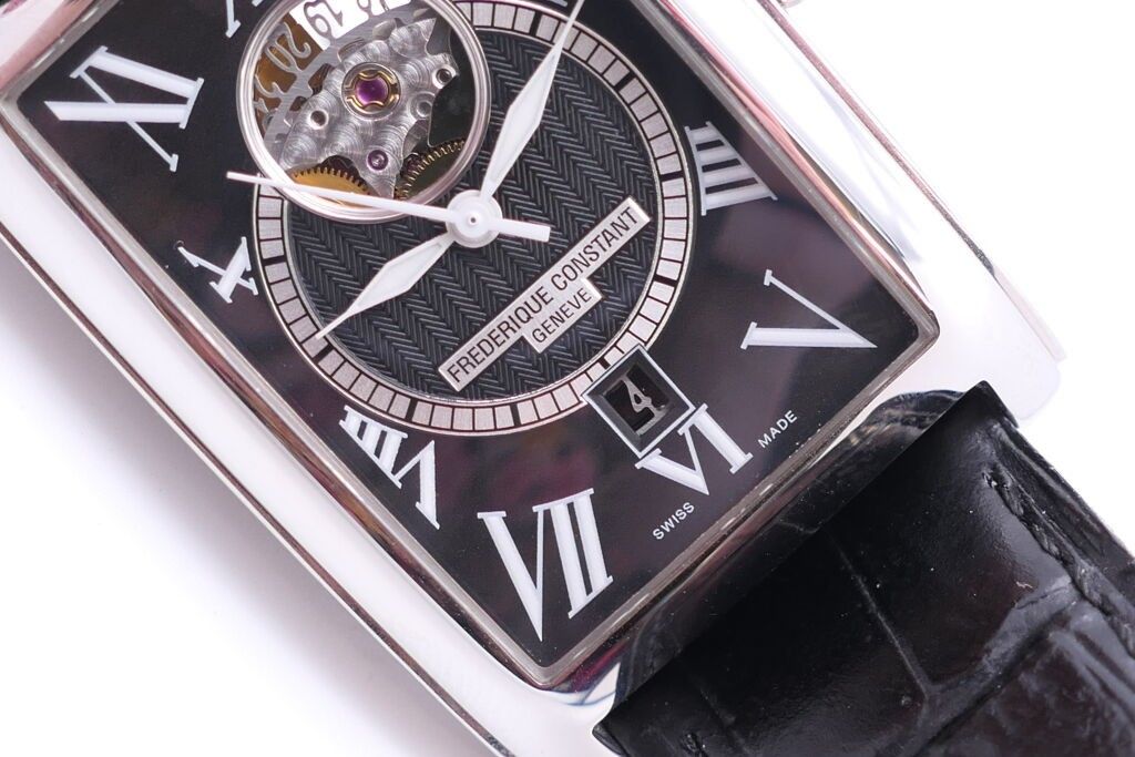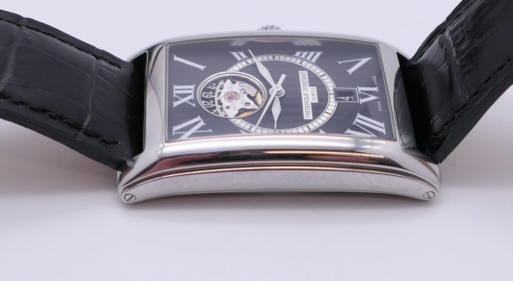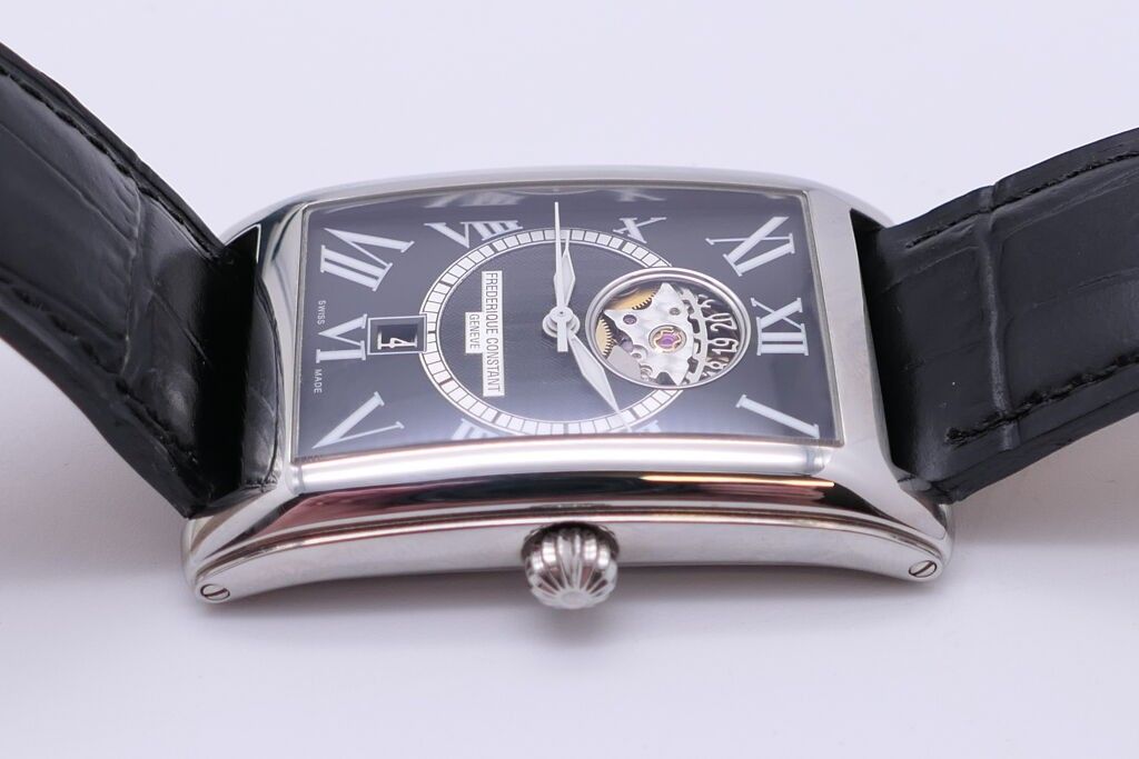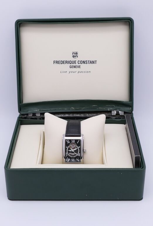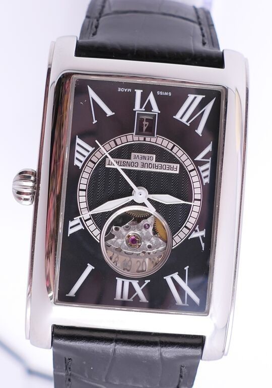 FRÉDÉRIC CONSTANT. Men's stainless steel wristwatch, rectangular case, black herringbone guilloché dial with Roman numerals for the hours and date window at six o'clock. Embossed black leather strap. Automatic movement. Height 46 x 30 cm. Case and papers. Apparent working condition.
