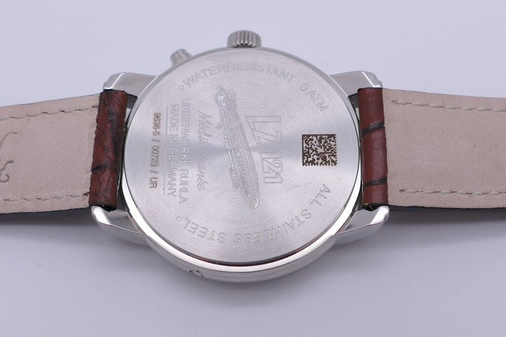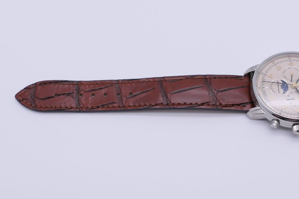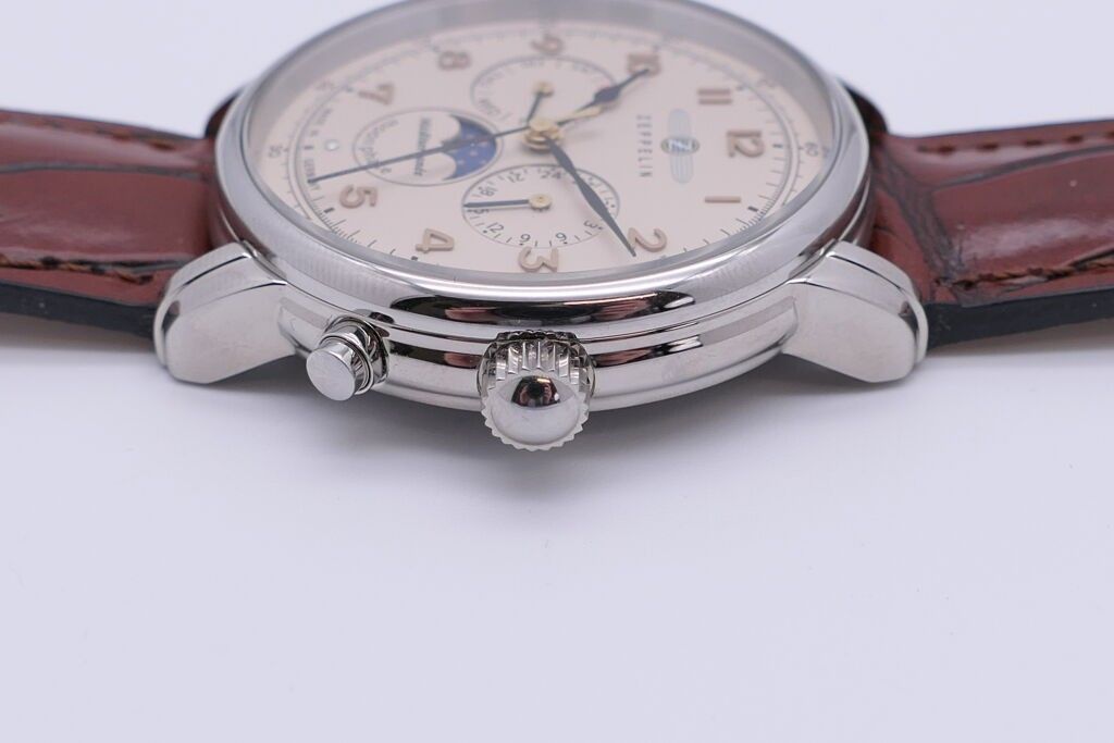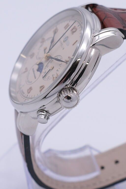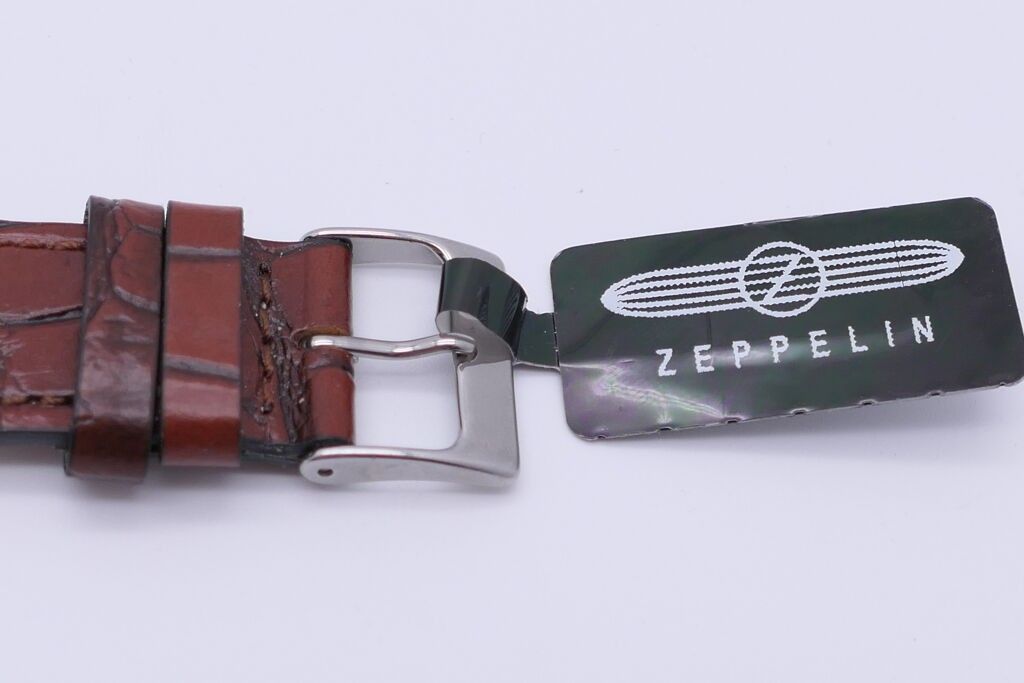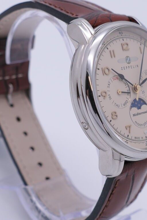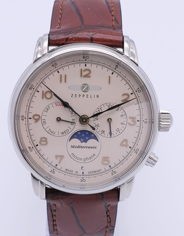 ZEPPELIN. Quartz watch. 3 hands. Day date moon phase. Steel case. Diameter: 40 mm. Beige dial. Brown leather strap. Ref : Z-9636-5. Apparent working condition.