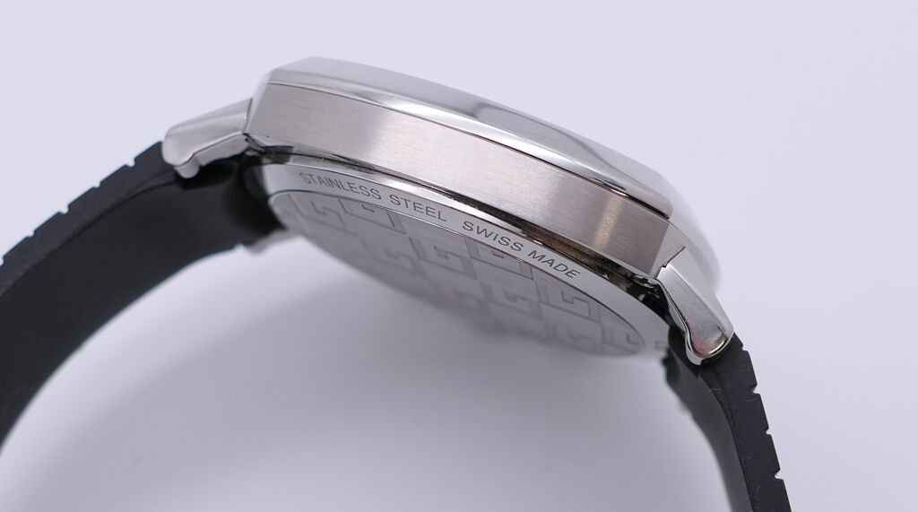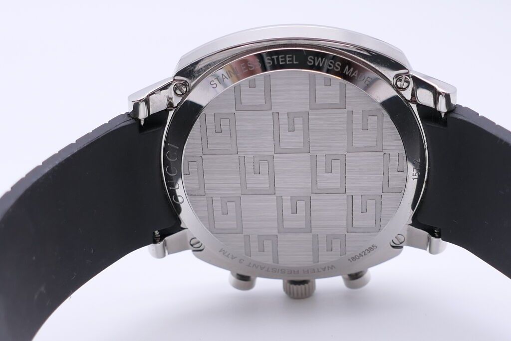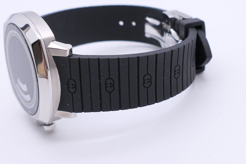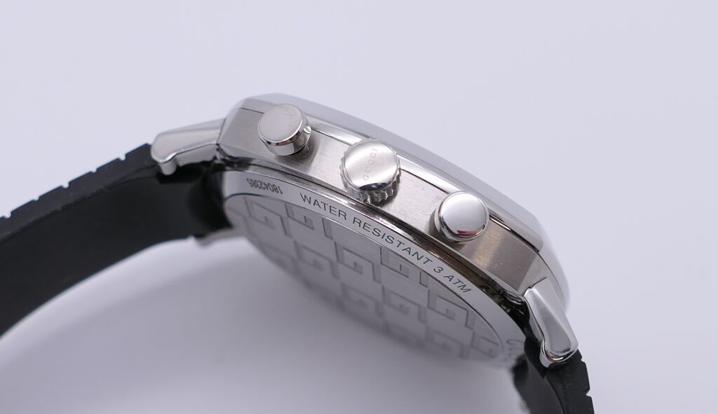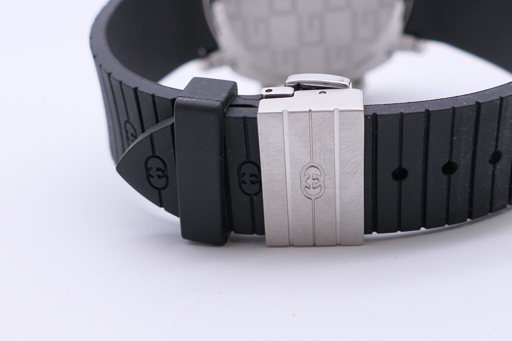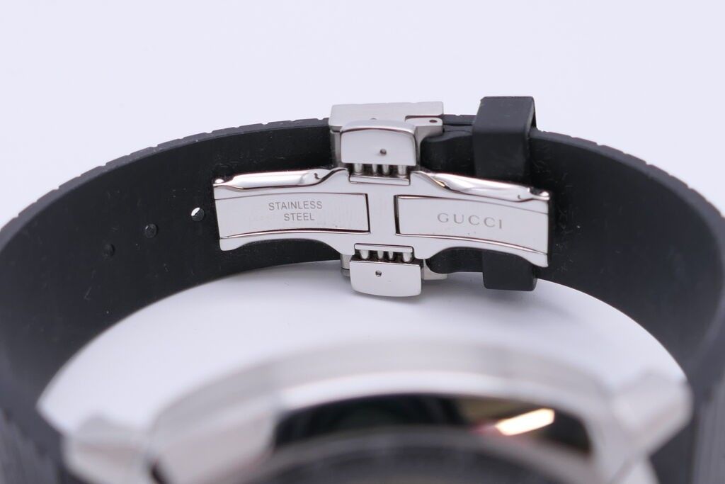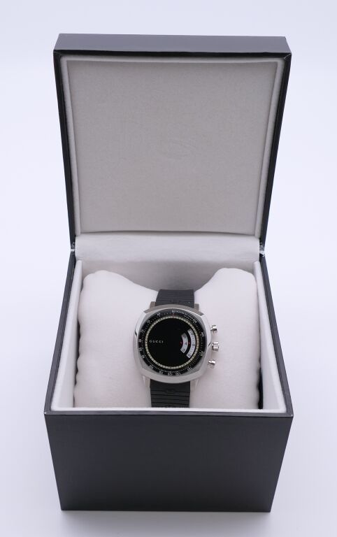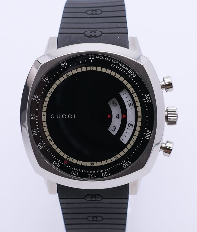 Gucci. Gripe watch. 40mm. Water-resistant to 30 metres. Steel case. Black rubber strap. Chronograph. Apparent working order.