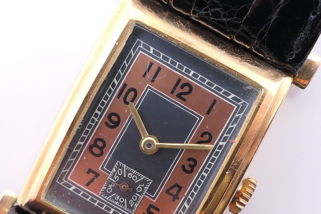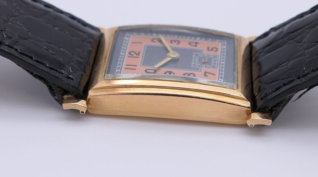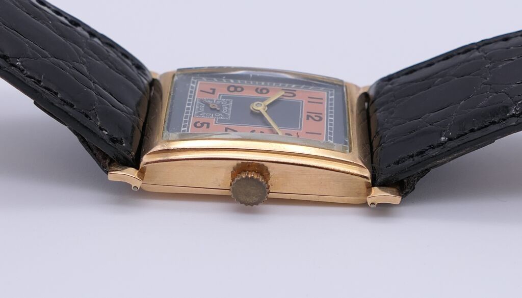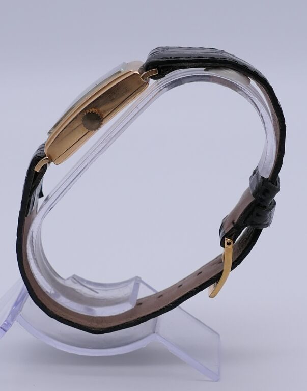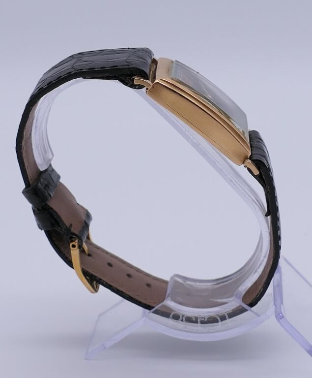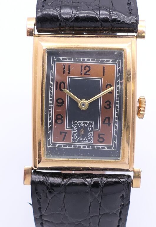 Art deco yellow gold watch. Mechanical movement. H. 35 mm with lugs. After-market leather strap. P.B. 24.8g.