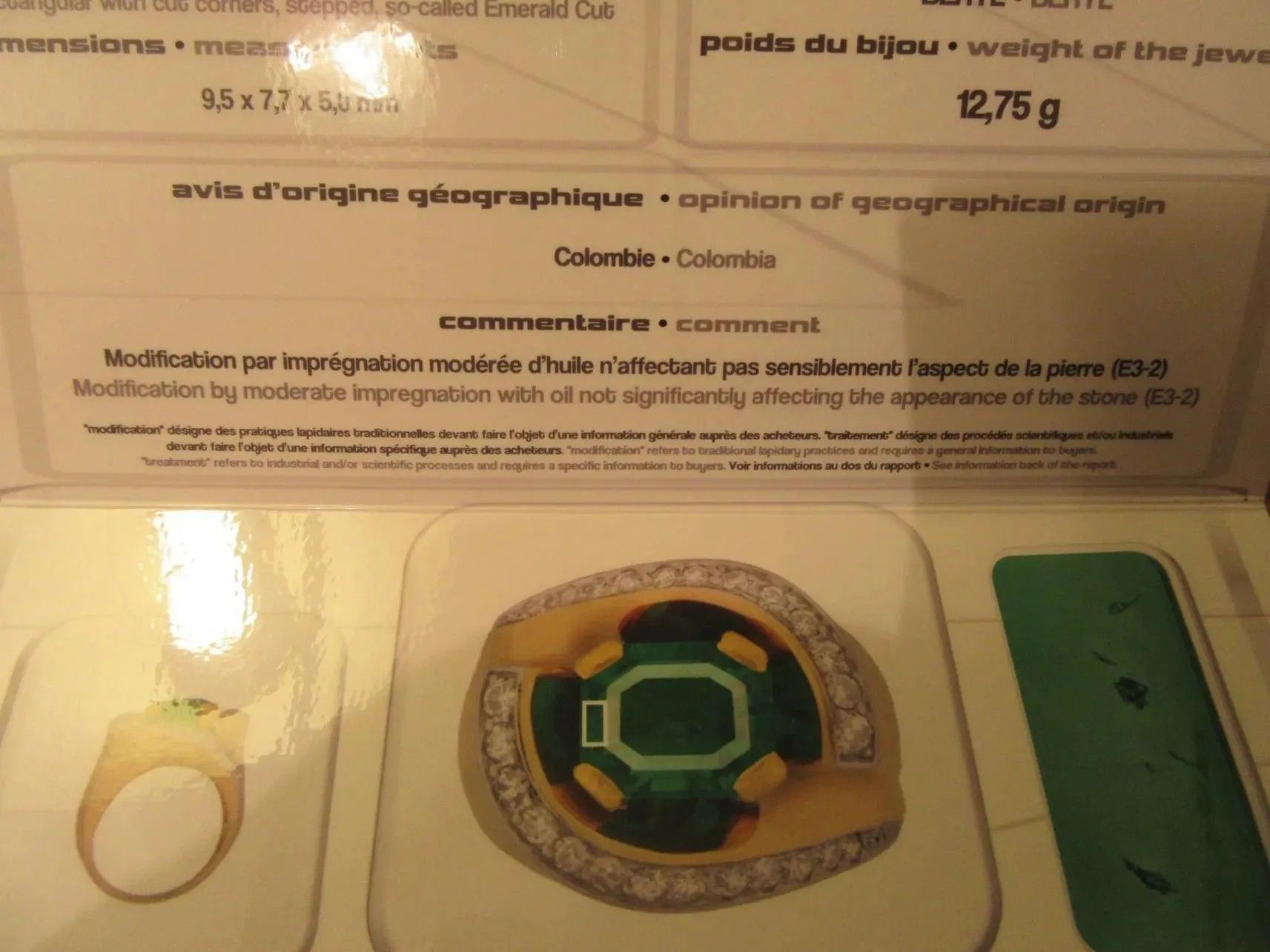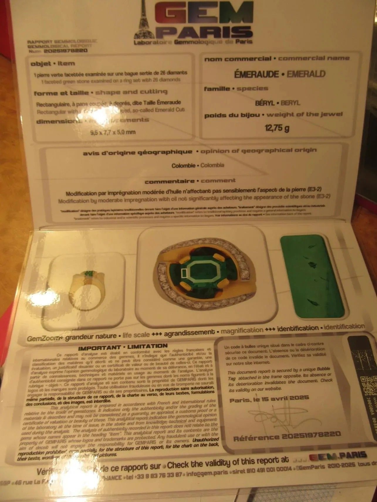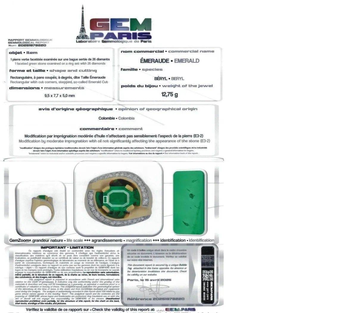 169.31 EXCEPTIONAL 18K GOLD AND PLATINUM RING SET WITH A COLUMBIA EMERALD AND TWO LINES OF DIAMONDS, WITH GEM PARIS CERTIFICATE - FINGER SIZE 50 - 12.75 gr 3 000 / 3 500 euros