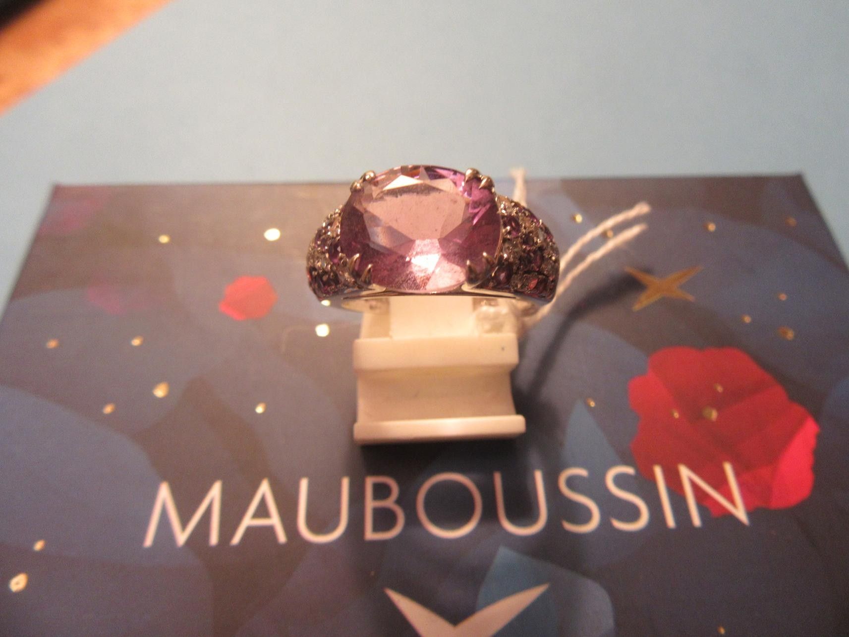 22 - MAUBOUSSIN, RING IN 18K GOLD + ROSE STONE FROM FRANCE + DIAMONDS, WITH ORIGINAL BOX AND CERTIFICATE, Gross weight 6.8 gr - FINGER SIZE 52 (value 2300 euros in 2013) (two photographs) 700 - 900 EURO