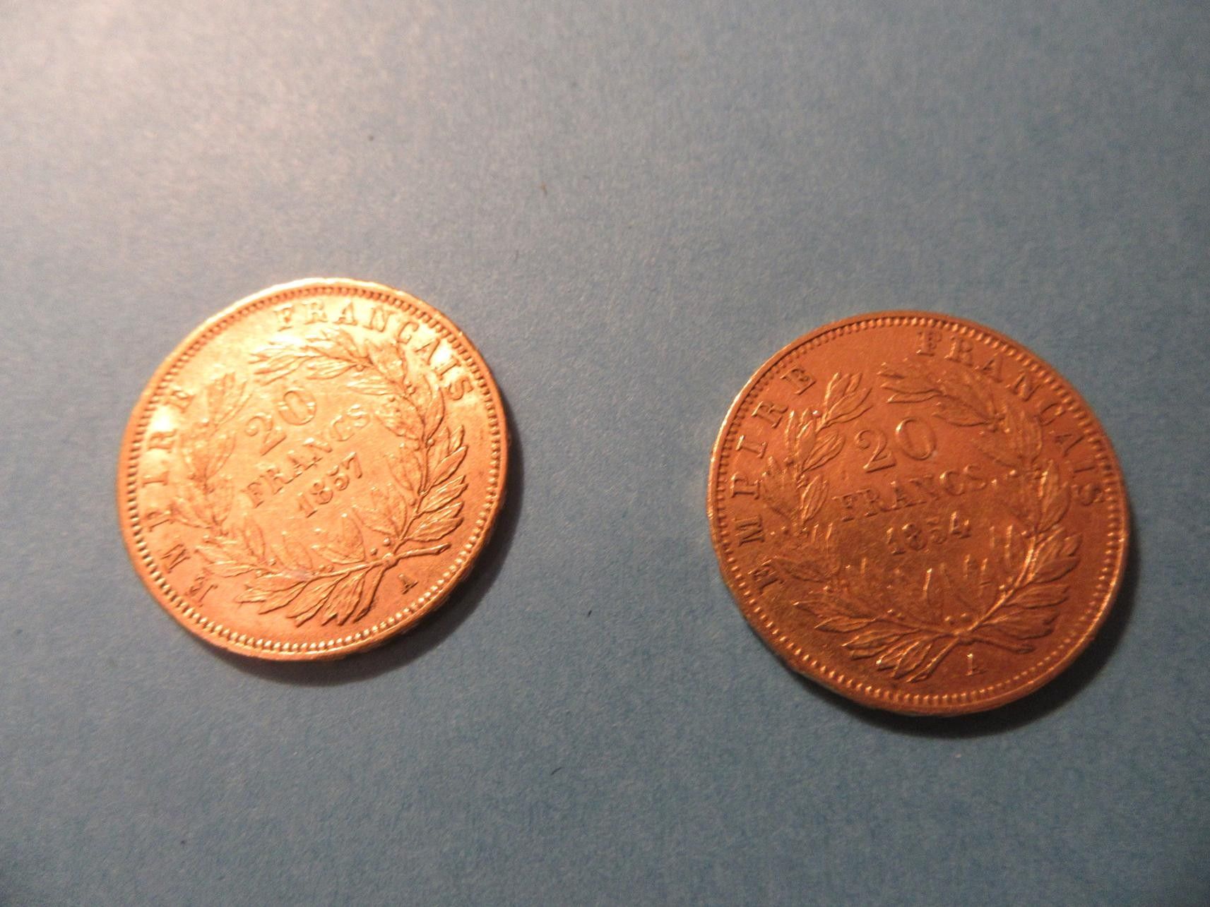 83 - TWO 20 FRANCS GOLD PIECES NAPOLEON III 1854 / 1857 (two photographs) 900 - 1100 EURO