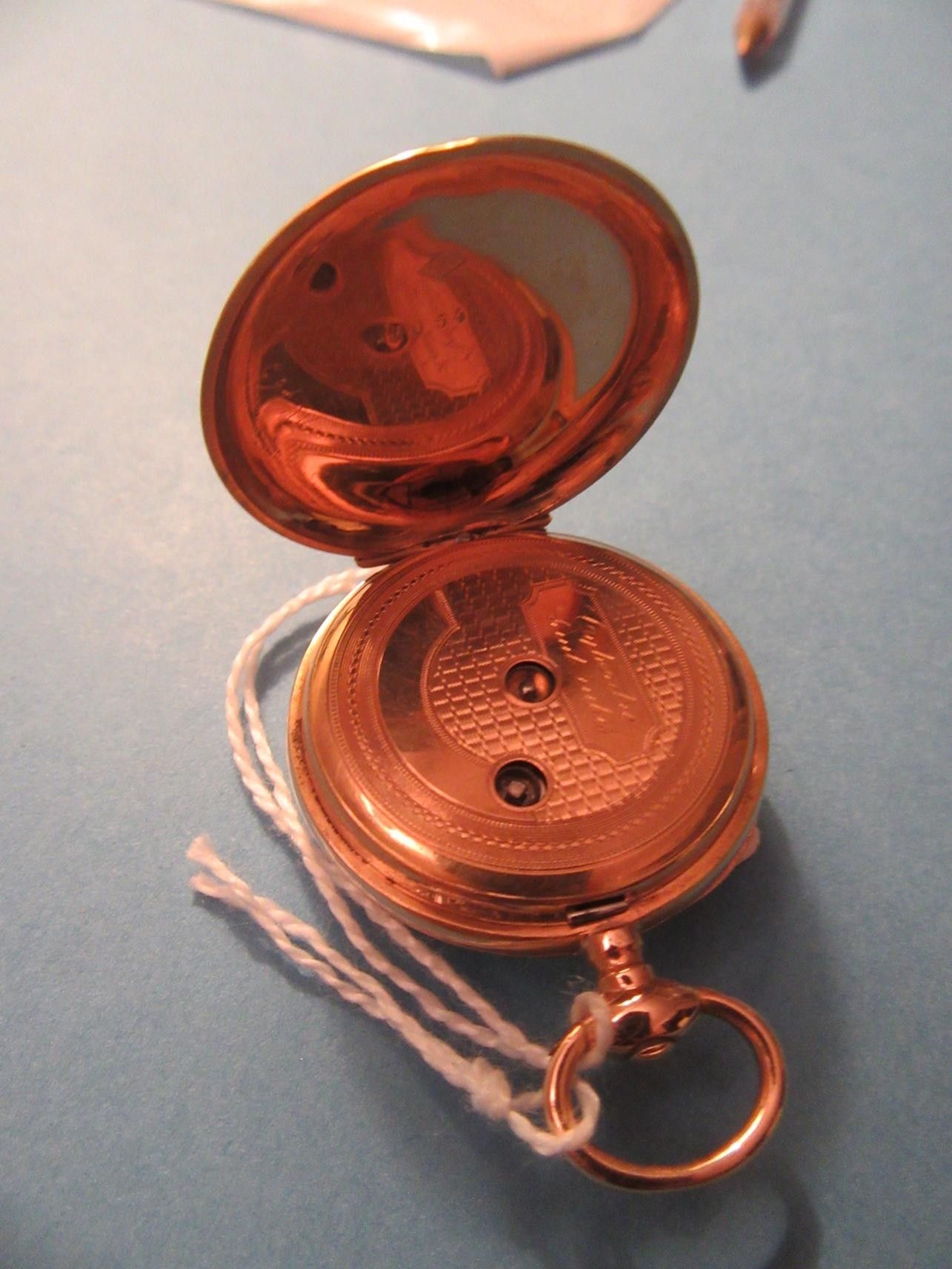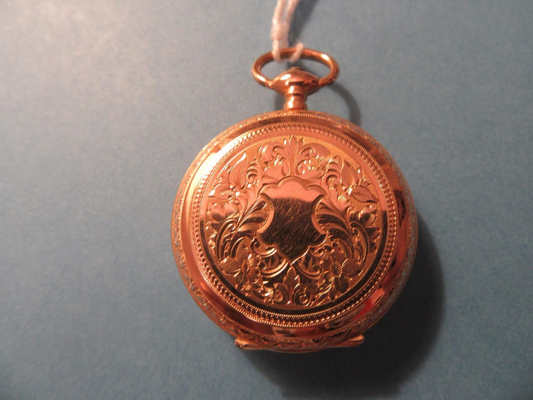 85 - NECK WATCH IN 18K (750 thousandths) YELLOW GOLD, WHITE EMAIL DIAL WITH ARABIC AND ROMAN FIGURES, GRAVE BACK - Gross weight 19.8 grams (+ METAL KEY) (three photographs) 250 - 350 EURO