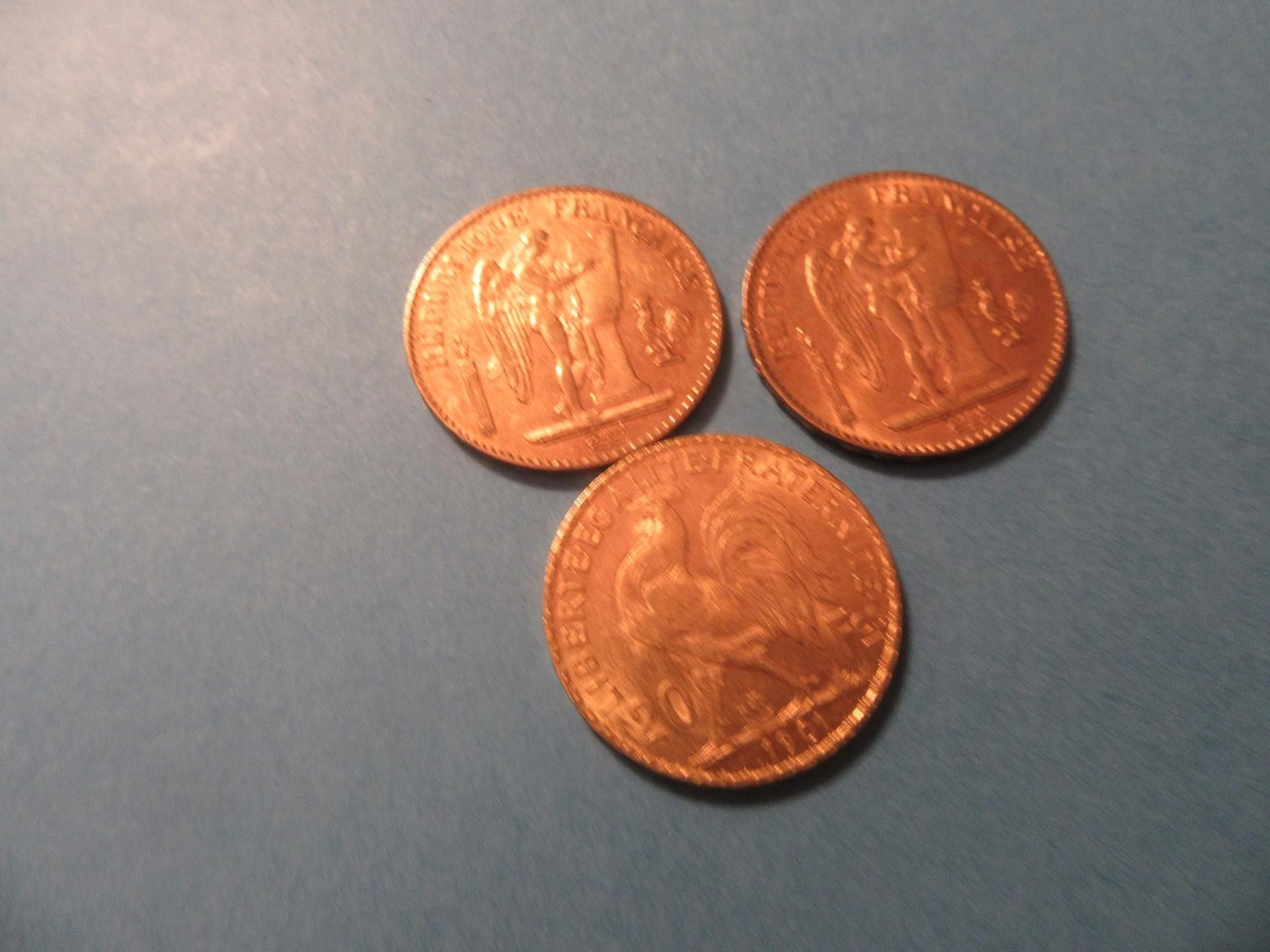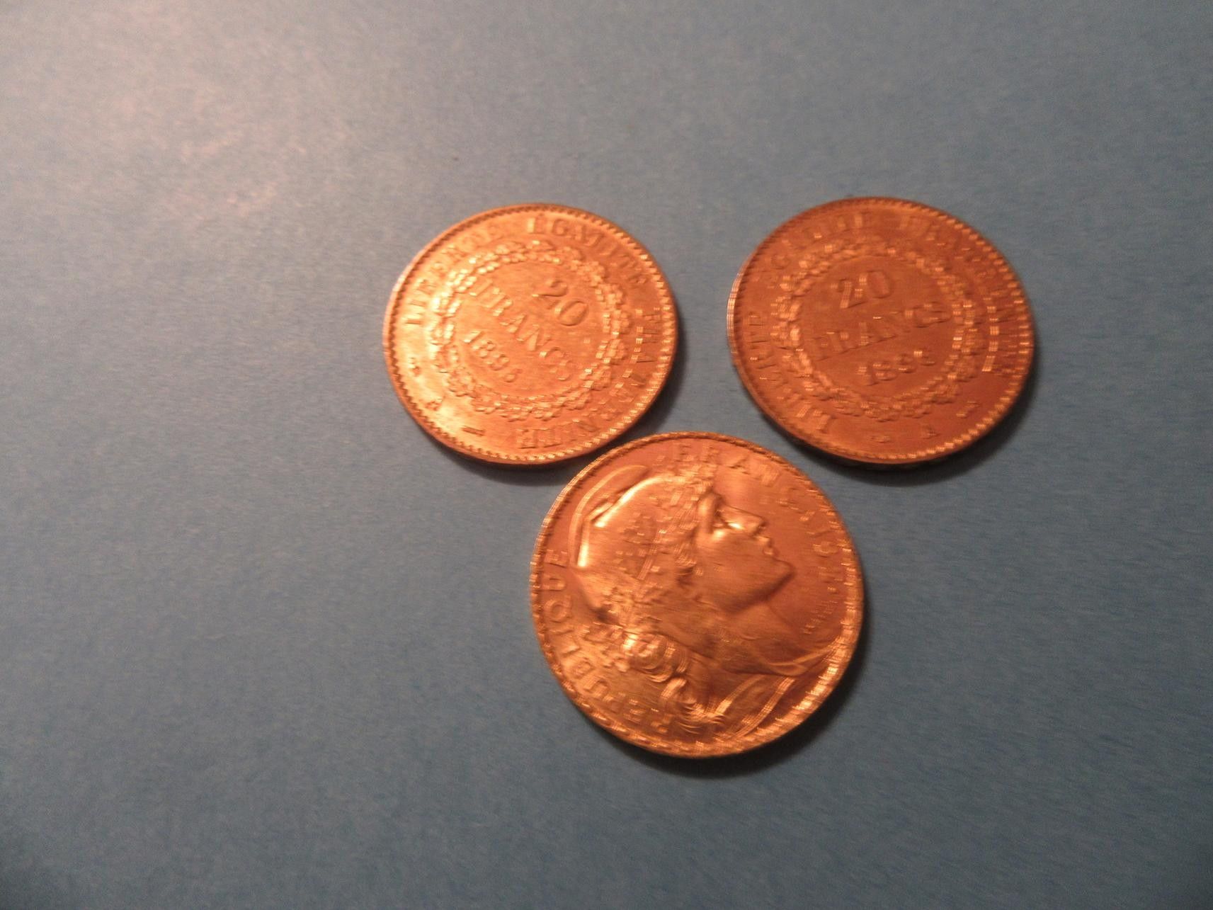 87 - THREE PIECES OF 20 FRANCS GOLD GENIR AND COQ 1895/1896/1901 (two photographs) 1000 - 1500 EURO