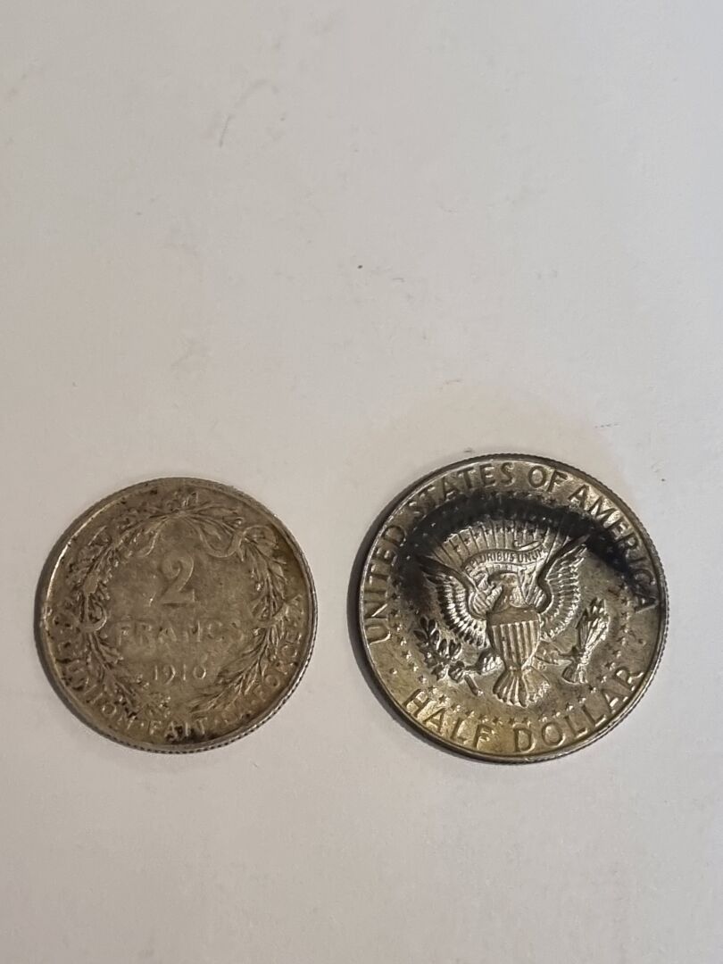 Silver 2 franc coin (Albert King of the Belgians, 1910) and a silver half dollar coin (Kennedy, 1961)