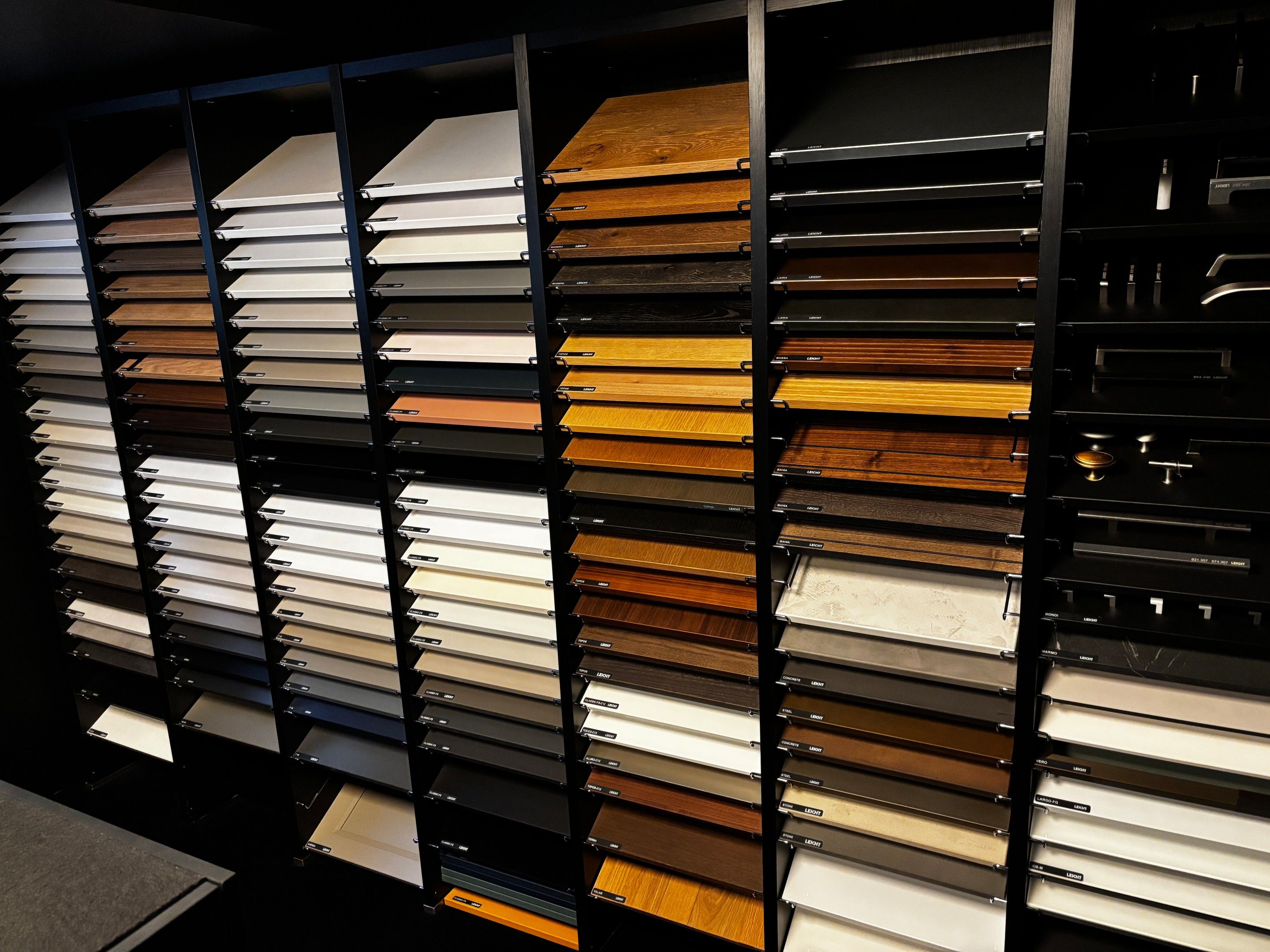 1 display cabinet with stands and 1 catalogue of different LEICHT colours and wood species