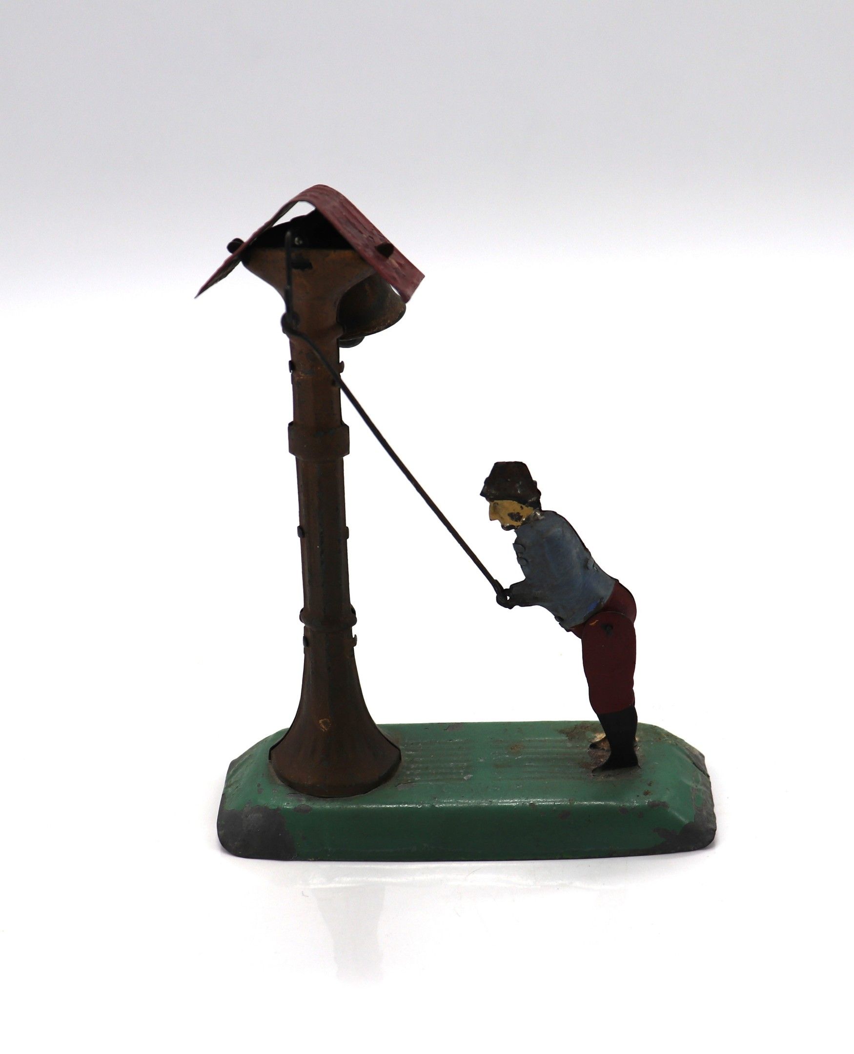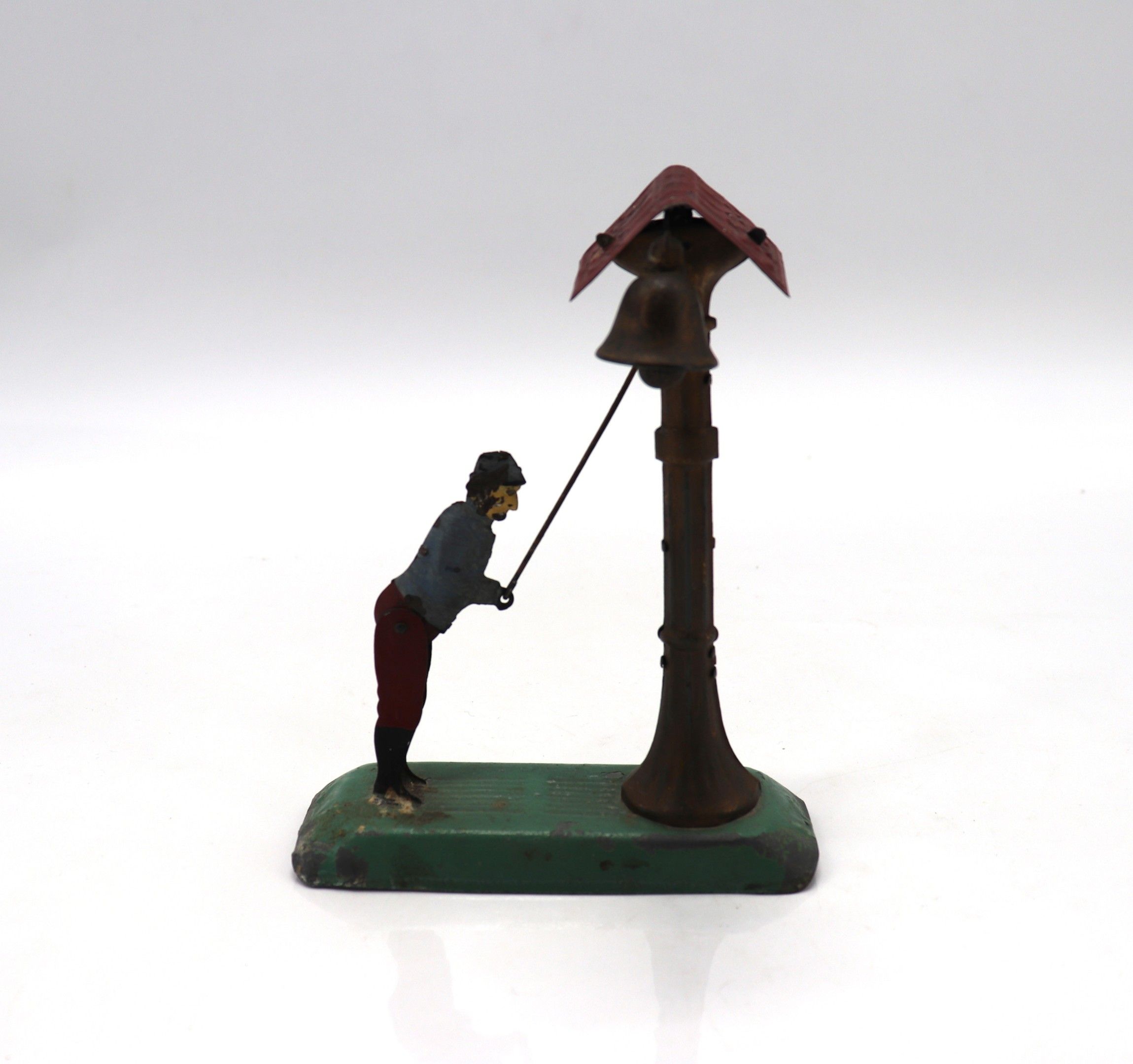"Le sonneur endiablé" in painted sheet metal (some missing parts), elastic movement, rocking figure driving the ringing of the bell, marked F.M Paris, patented S.G.D.G on the base.