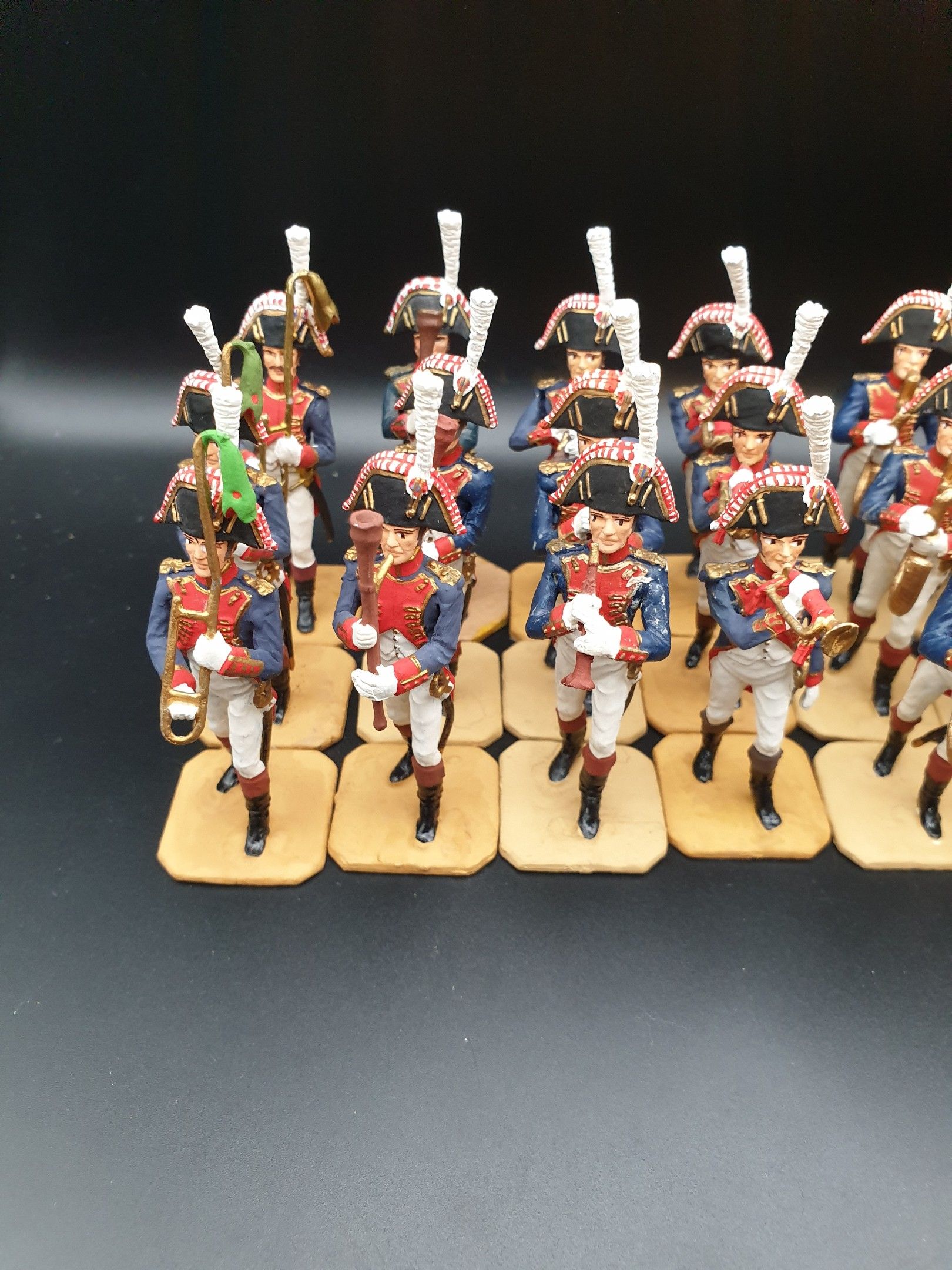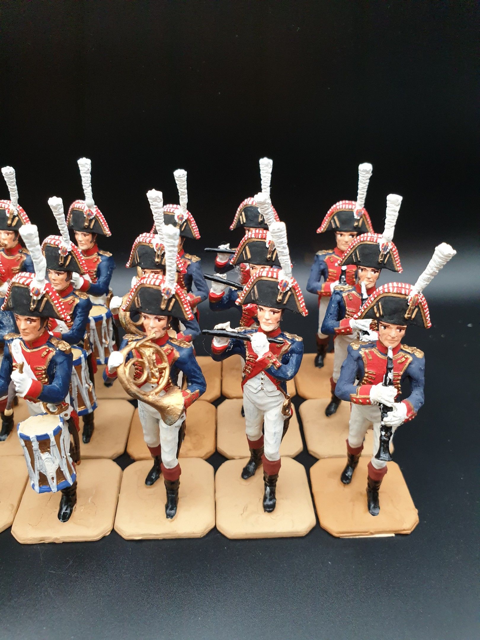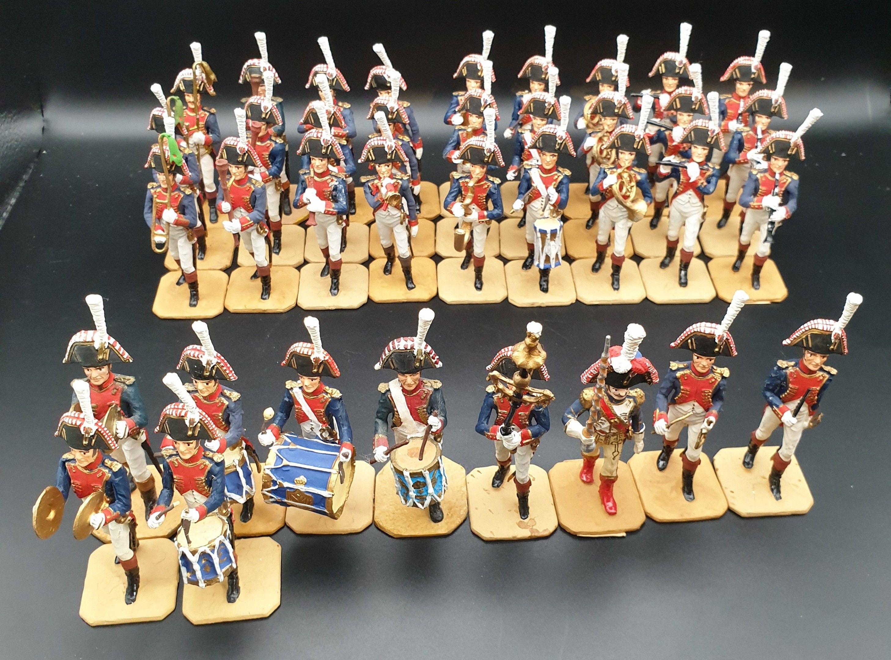 37 lead soldiers, 8cm, Musician of the 1st regiment of the grenadiers of the guard, from the famous Parisian shop "Drapeaux de France - Jardin du Palais Royal" (Unique hand-painted pieces), including drums, trumpets, cymbals, flutes, horn, chef d'orquestre, drum majors, ...