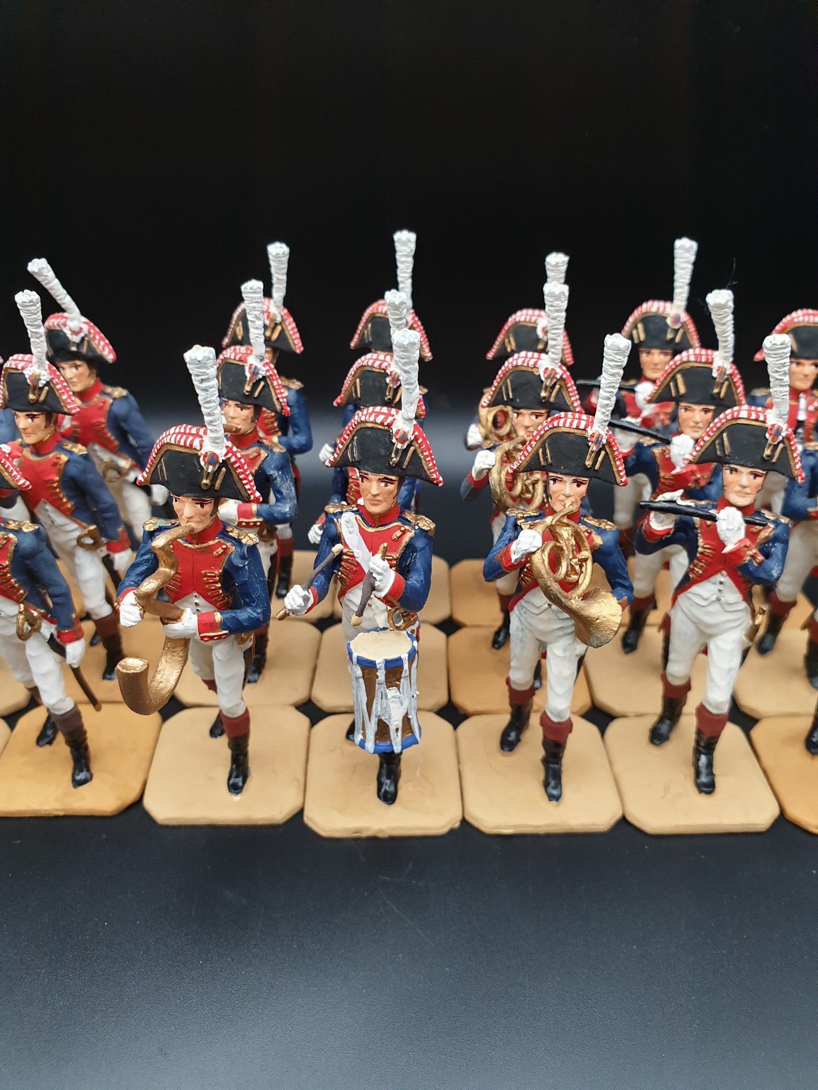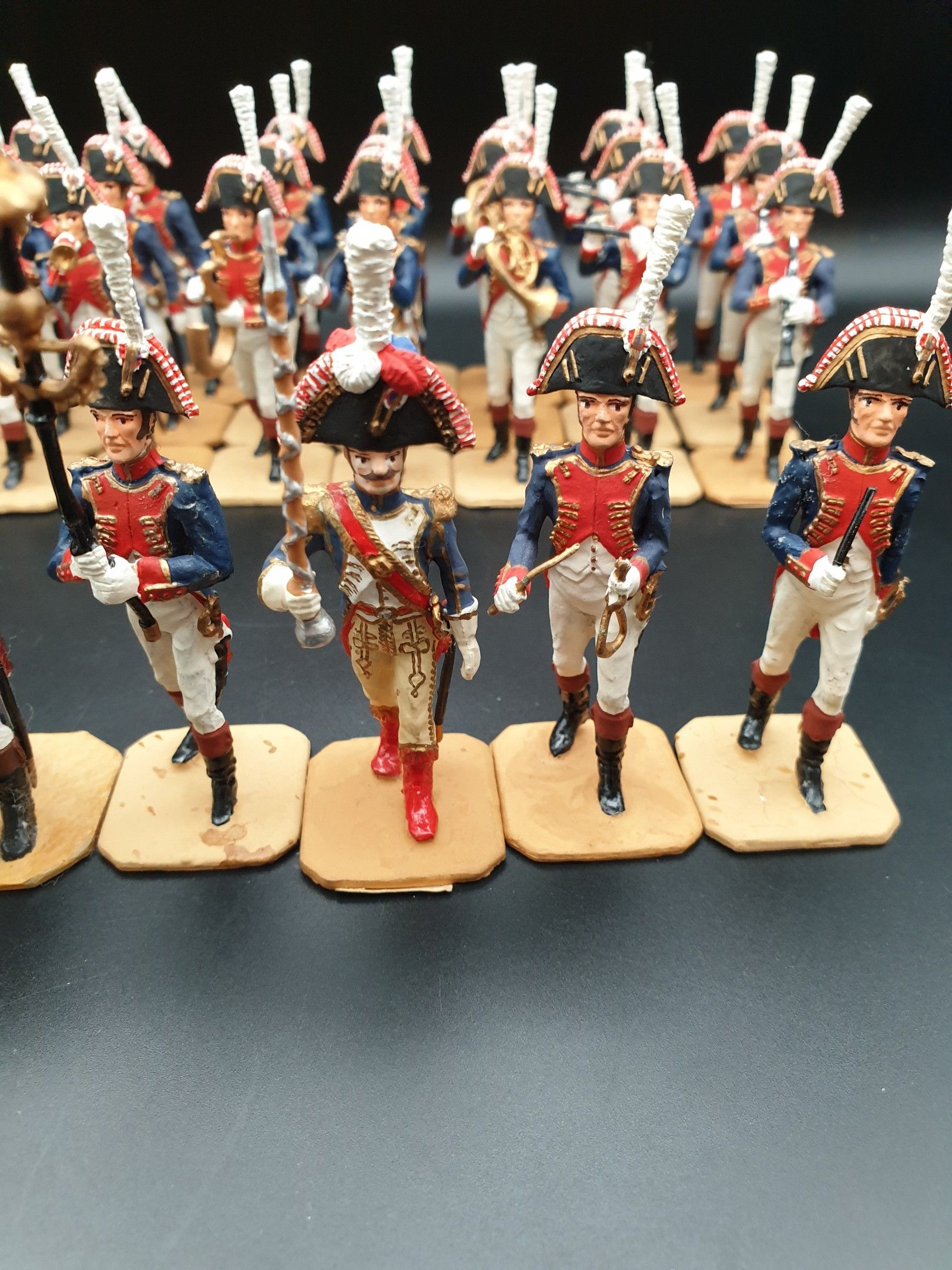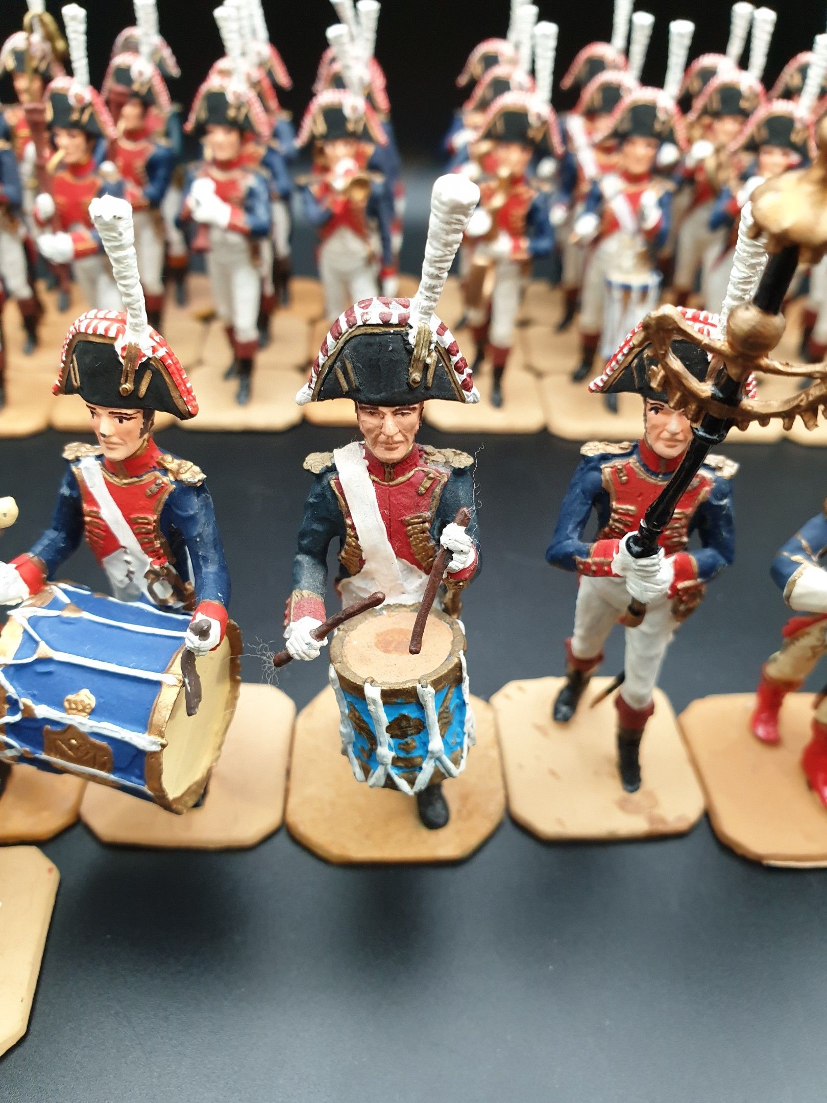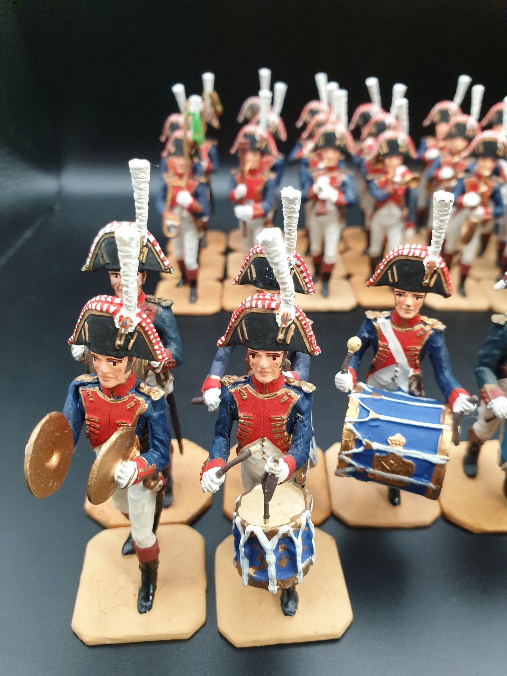 37 lead soldiers, 8cm, Musician of the 1st regiment of the grenadiers of the guard, from the famous Parisian shop "Drapeaux de France - Jardin du Palais Royal" (Unique hand-painted pieces), including drums, trumpets, cymbals, flutes, horn, chef d'orquestre, drum majors, ...