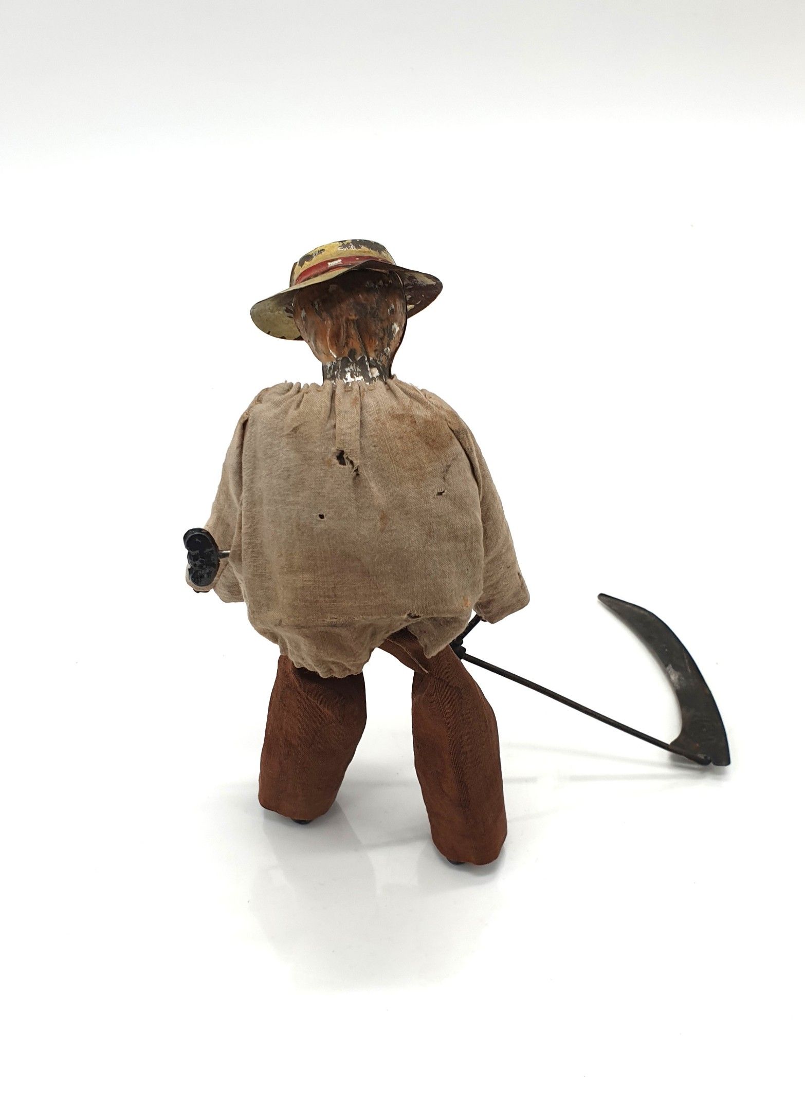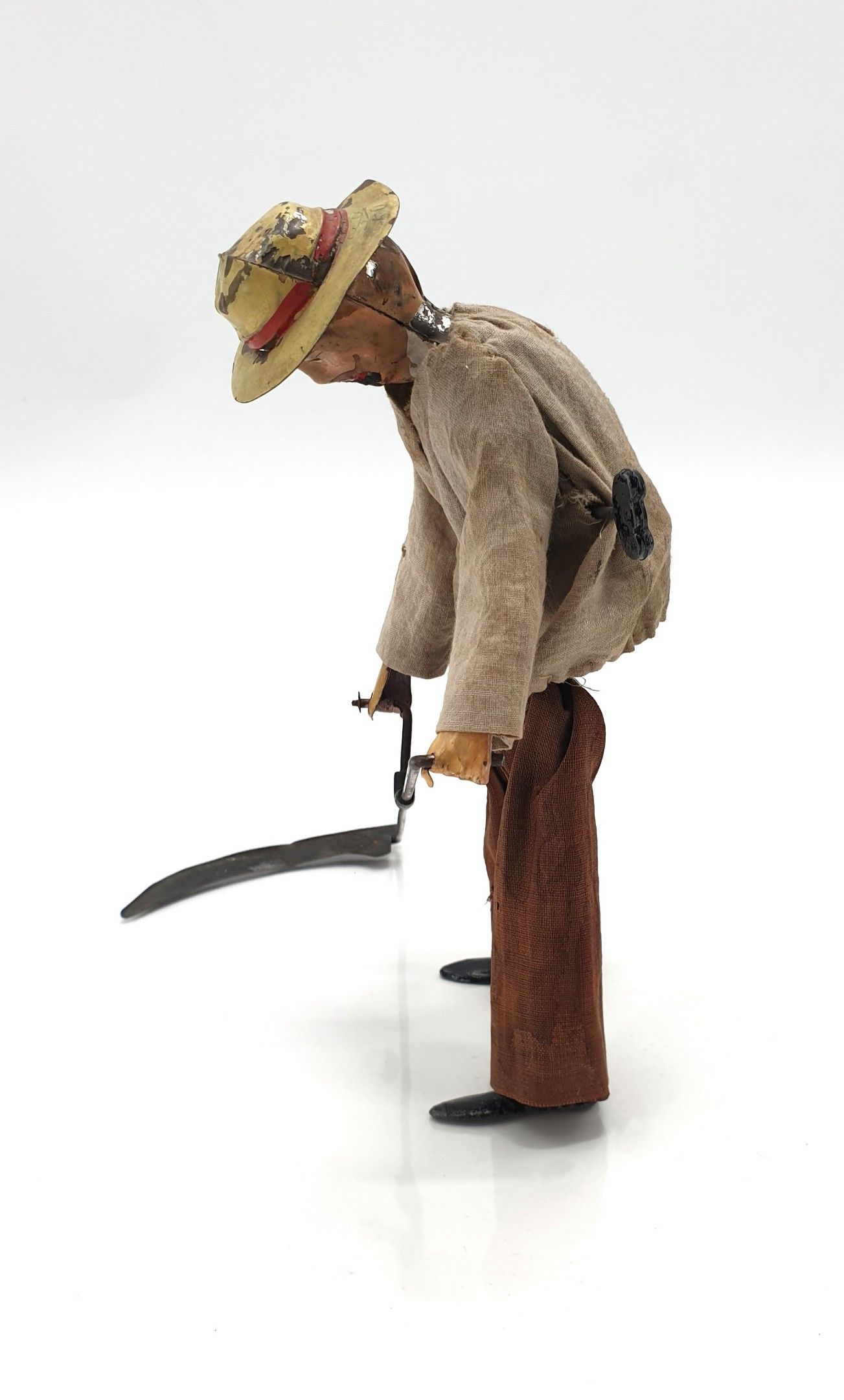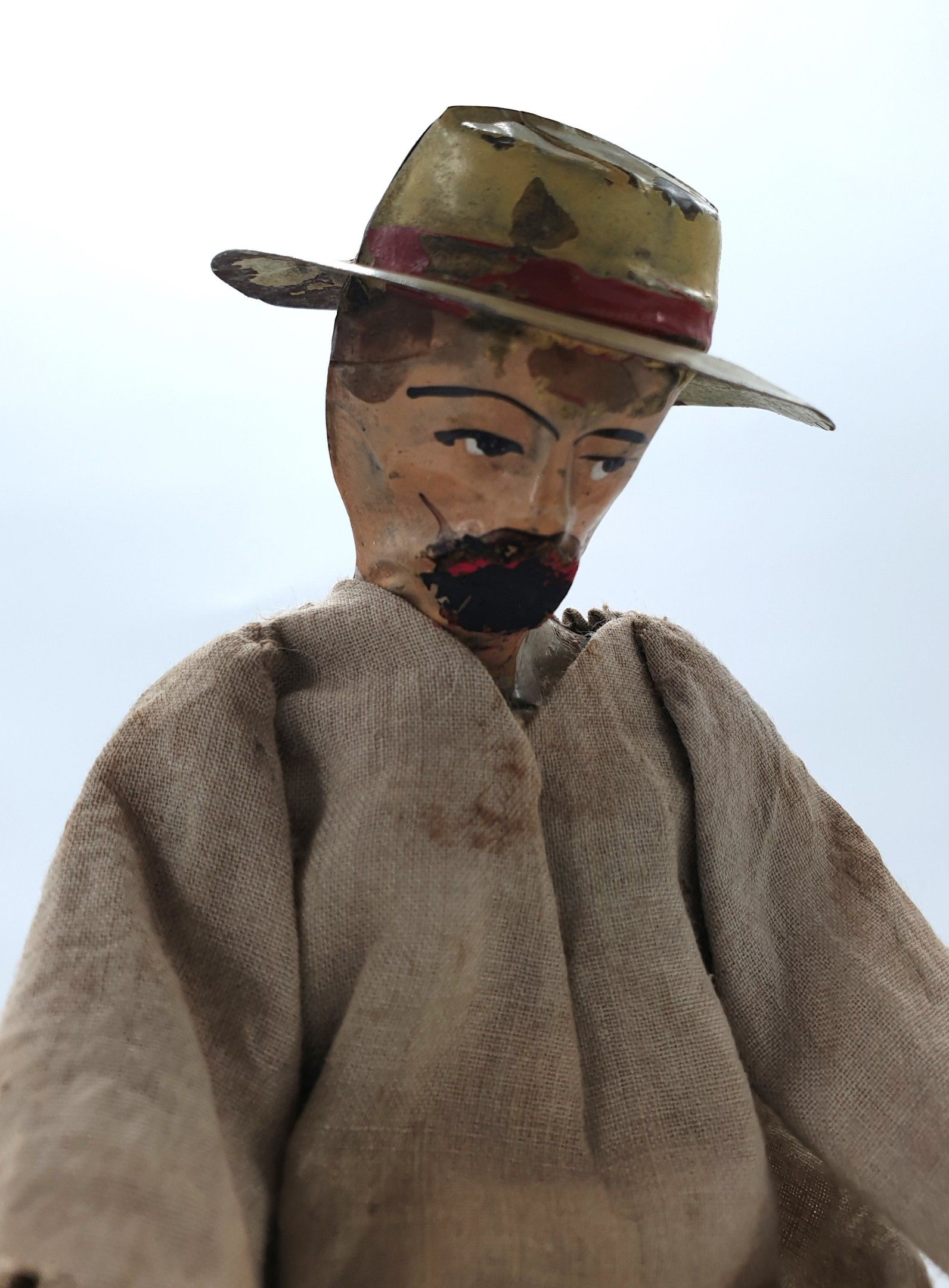 Painted and clothed sheet metal mechanical toy, from 1899, h. 19 cm (small chips on the face and wear).