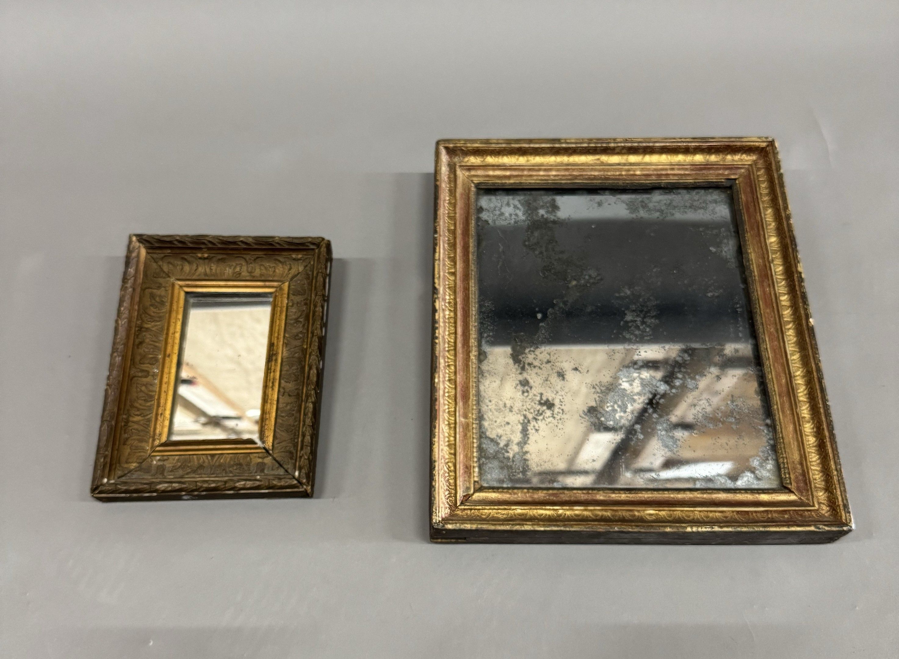 Small mirror in a wood and stucco frame carved with foliage (accidents and missing parts). 23 x 17 cm Mirror in an old gilded wooden frame. Provincial work from the 18th century (wear, chips). 30 x 24 cm